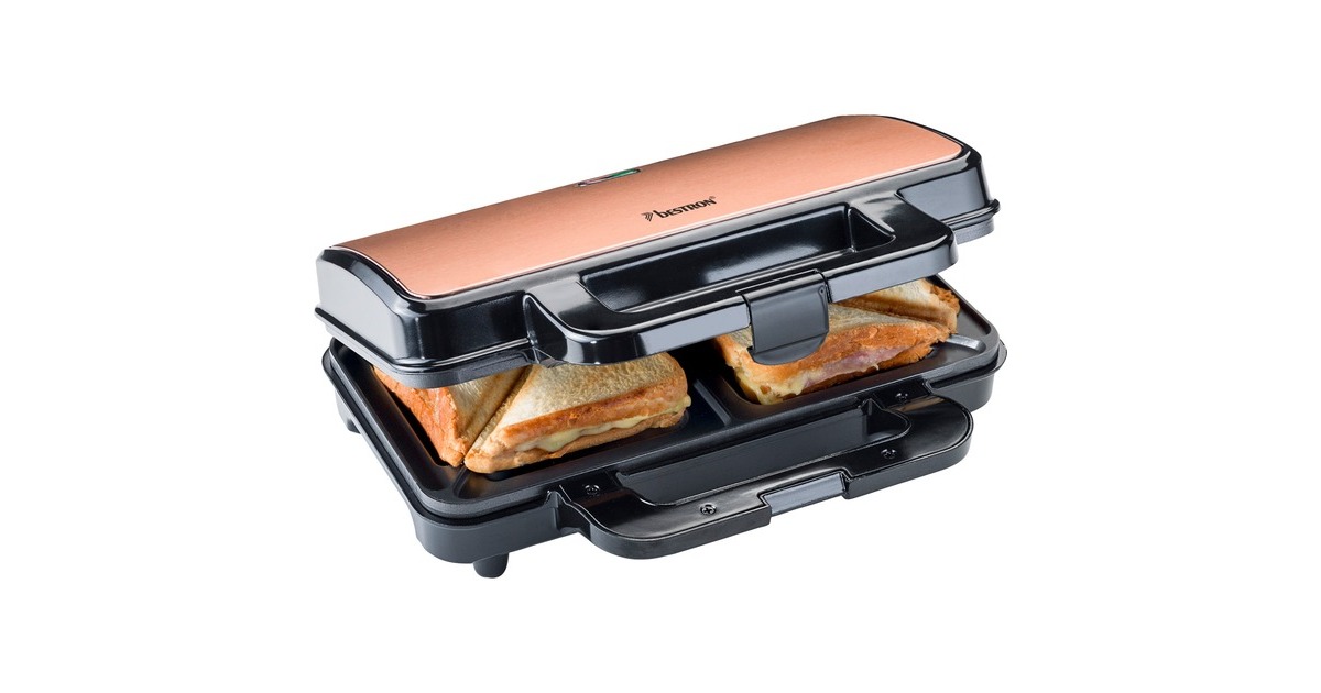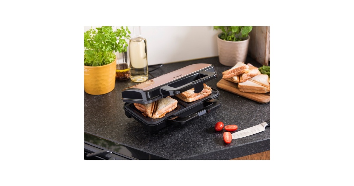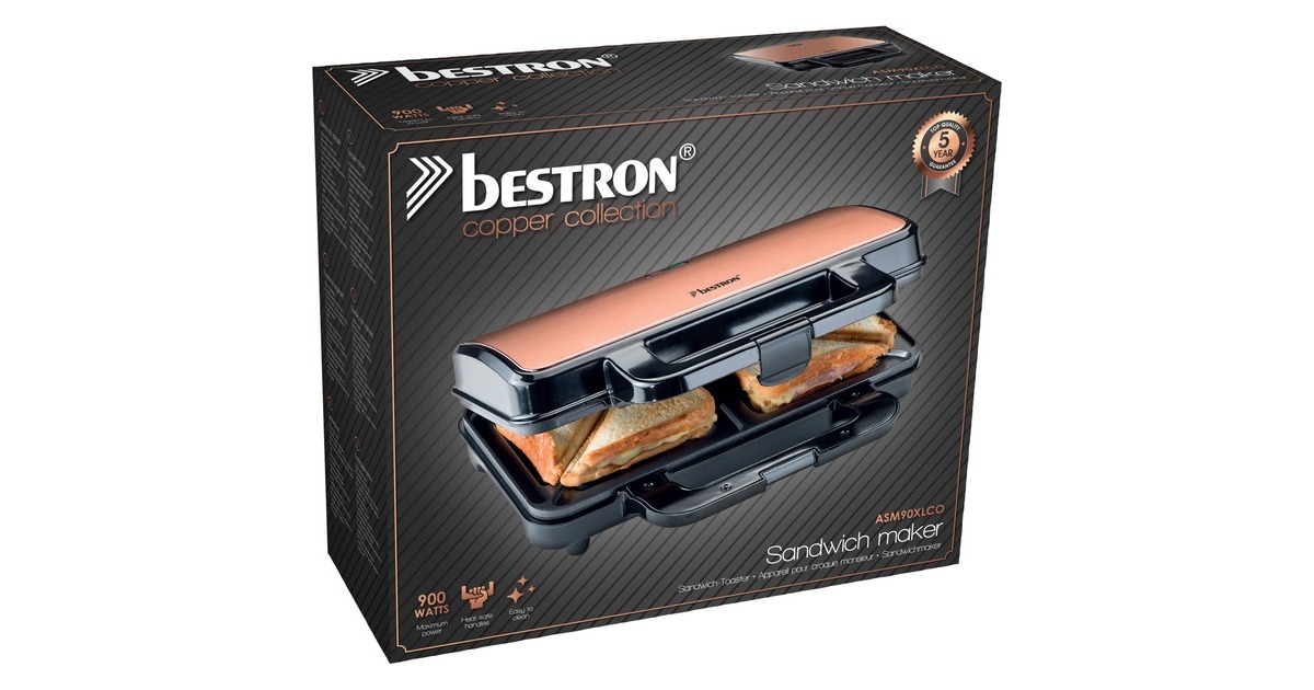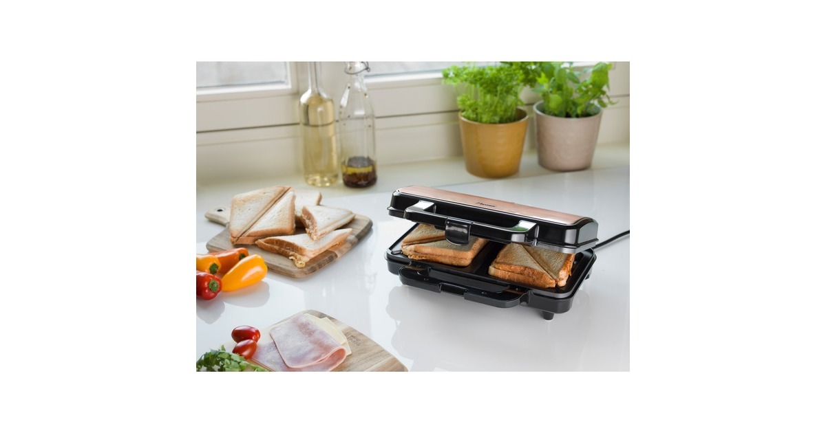 Der Sandwichmaker ASM90XLCO aus der Copper Collection in stilvollen Kupfer-Design macht das Zubereiten von leckeren Sandwiches zum Kinderspiel. Mit einer Leistung von 900 Watt und automatischer Temperaturregelung lassen sich einfach 4 dreieckige Sandwiches zubereiten. Die Bereitschaftsanzeige signalisiert das Erreichen der passenden Backtemperatur. Für einen sicheren Gebrauch sorgen das wärmeisolierende Gehäuse mit großem wärmeisoliertem Griff mit Verriegelungsclip und die Antirutschfüße. Die antihaftbeschichteten Sandwichplatten erleichtern die Reinigung. Der ASM90XLCO kann platzsparend senkrecht aufbewahrt werden.