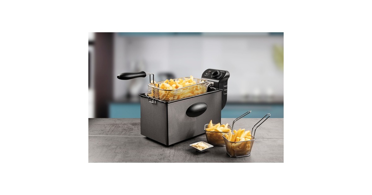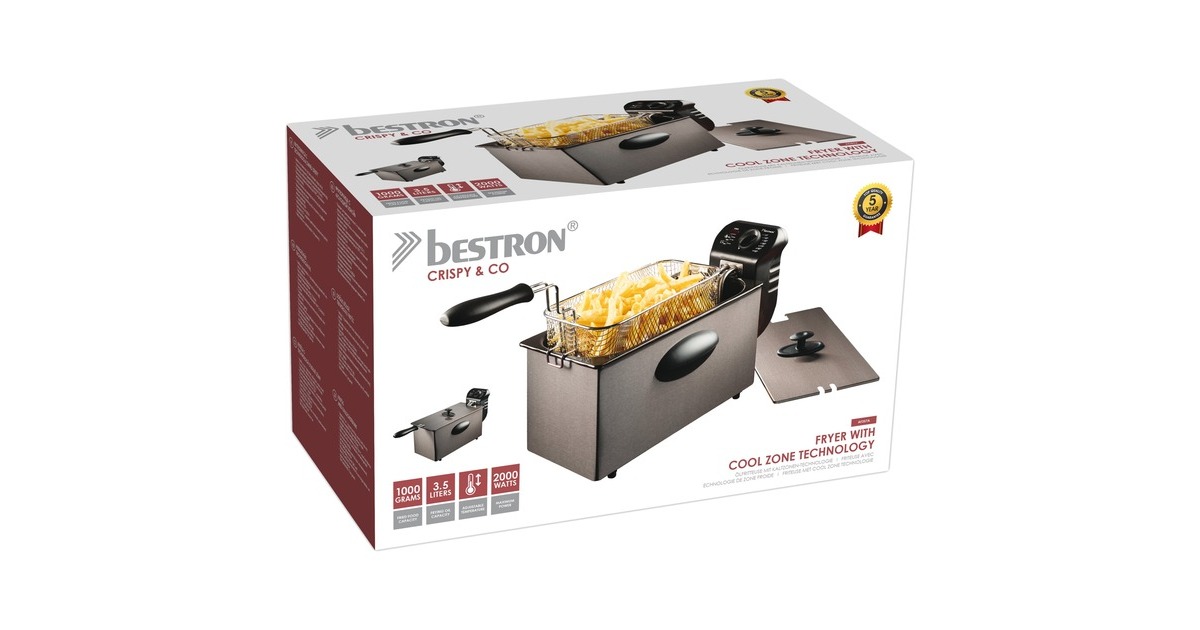 Die Bestron Fritteuse AF357A eignet sich ideal für ca. 1 kg Pommes Frites, Snacks, Fleisch, Fisch etc. Die Temperatur des Frittierfettes lässt sich über einen Drehregler mit Kontrollleuchte bis zu 190°C einstellen. Die Kaltzonen-Technologie sorgt für eine längere Haltbarkeit des Öls. Sicheres Heben und Senken des Fritierkorbes ist durch den wärmeisolierten Griff möglich. Die Fritteuse AF357A ist durch den emaillierten, herausnehmbaren 3,5 l Behälter leicht zu reinigen. Der Deckel ist abnehmbar.Art.-Nr.: 1820339