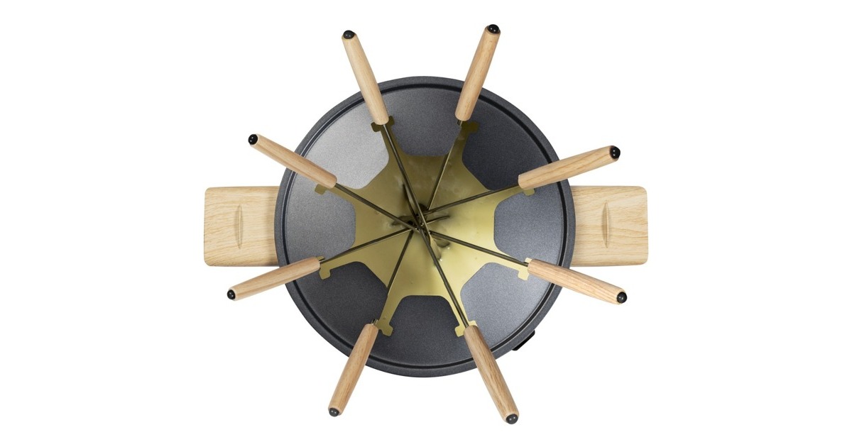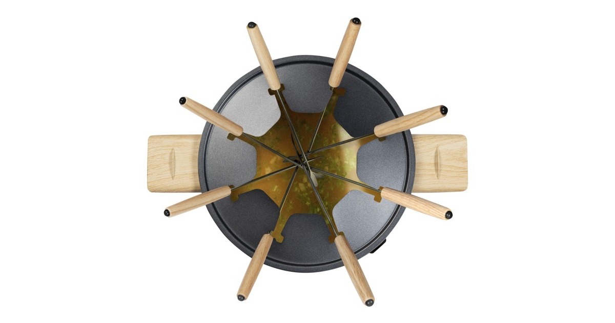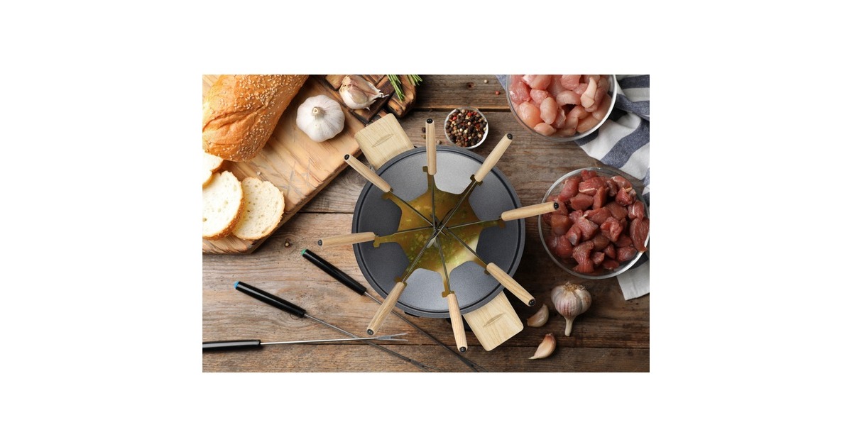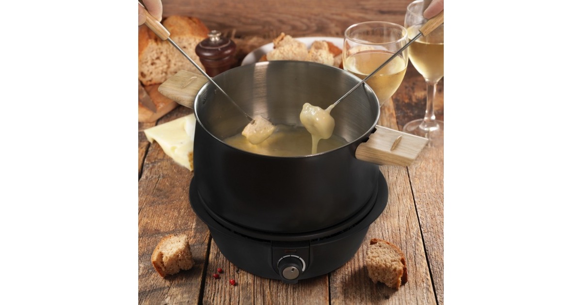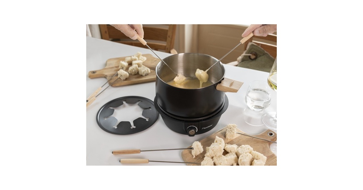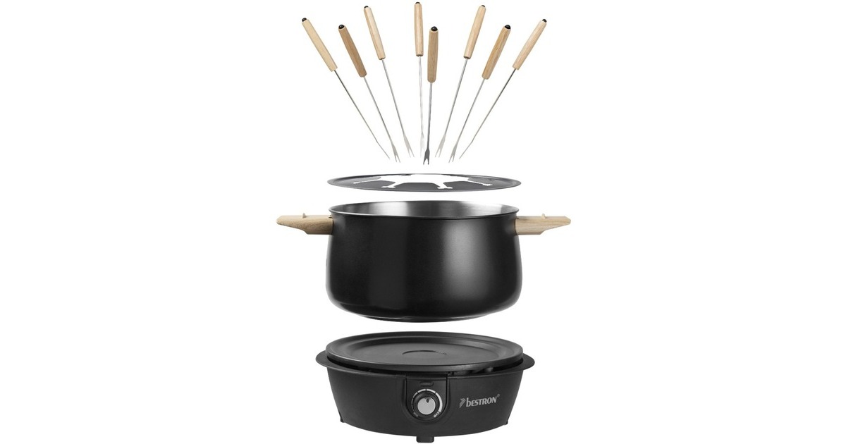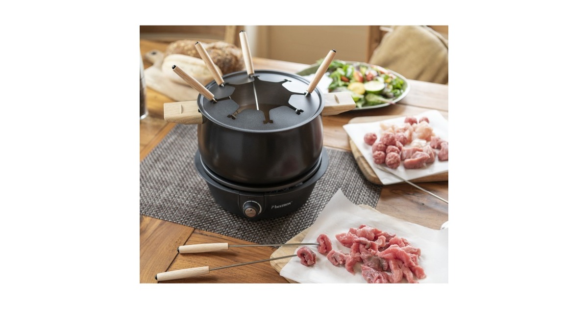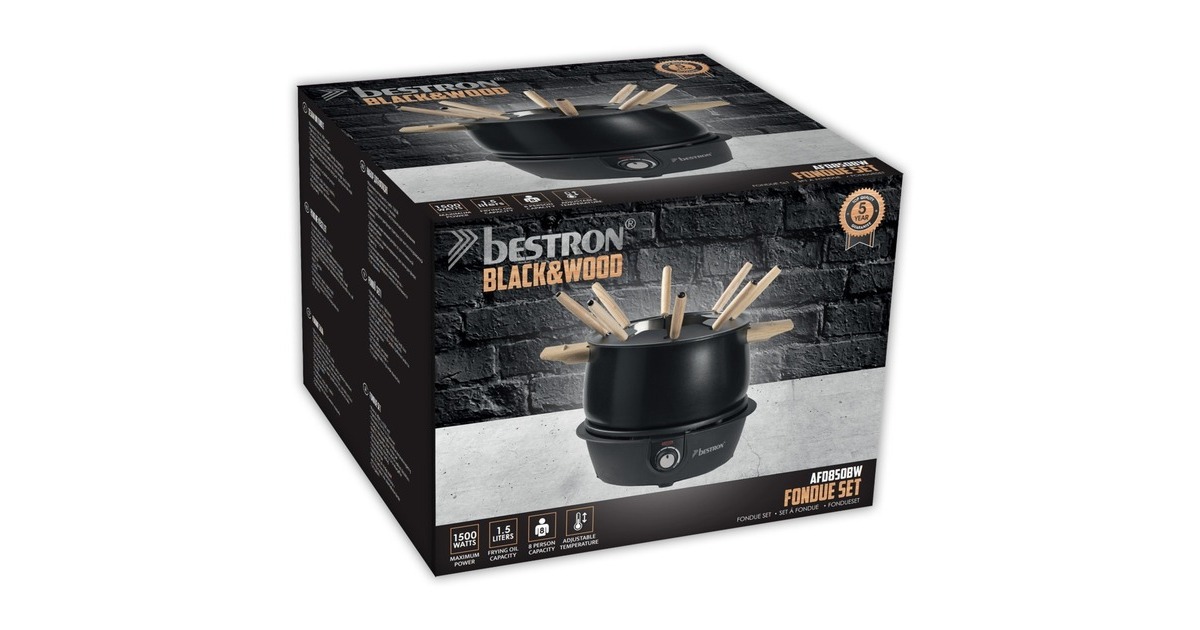 Das Bestron Fondue AFD850BW aus Black & Wood Serie hat einen abnehmbaren 1,5 l Topf mit wärmeisolierten Griffen. Dank einer Leistung von 1500 Watt ist das Fondue Set schnell einsatzbereit. Der Spritzschutz mit Gabel-Halter vermeidet unnötige Spritzer und bringt Ordnung in den Fonduetopf. Das Fondue AFD850BW ist für acht Personen geeignet und im Lieferumfang sind acht Fonduegabeln enthalten. Mit dem regelbaren Thermostat lässt sich die optimale Gartemperatur einstellen. Zur einfachen Reinigung ist der Topf spülmaschinengeeignet.