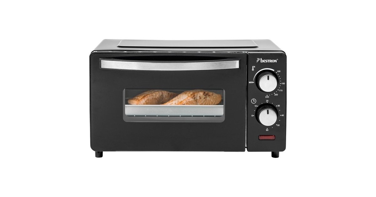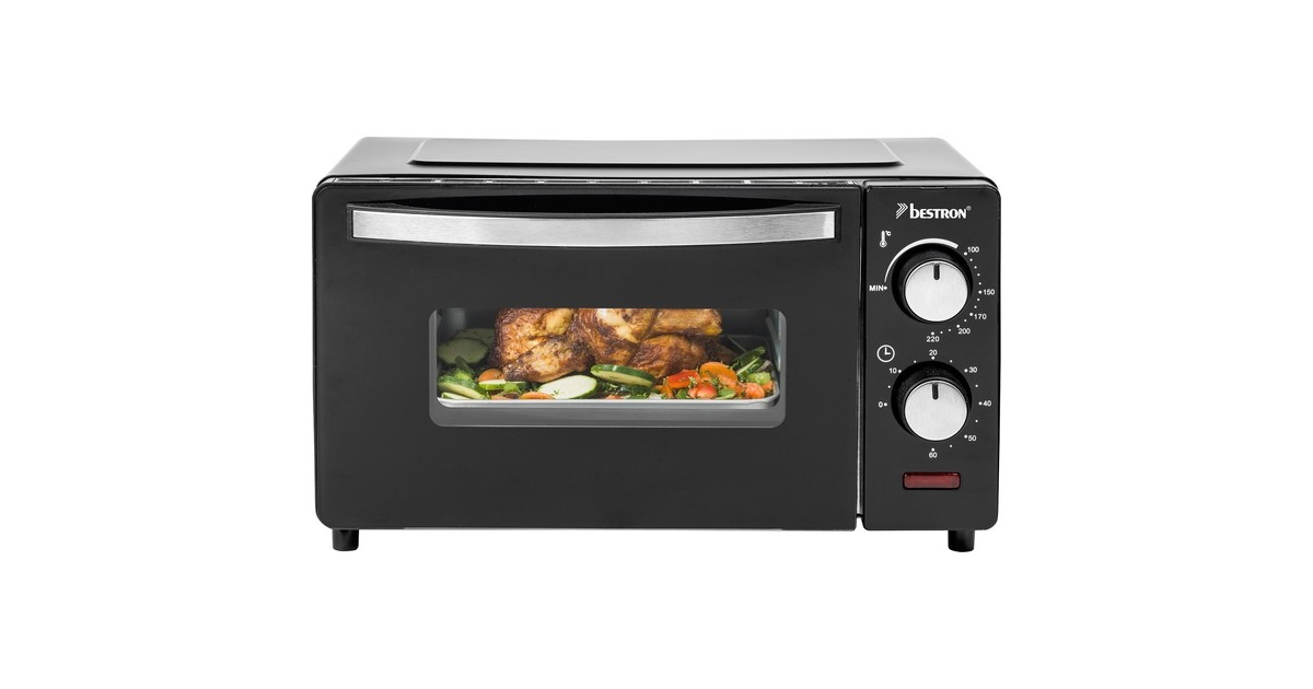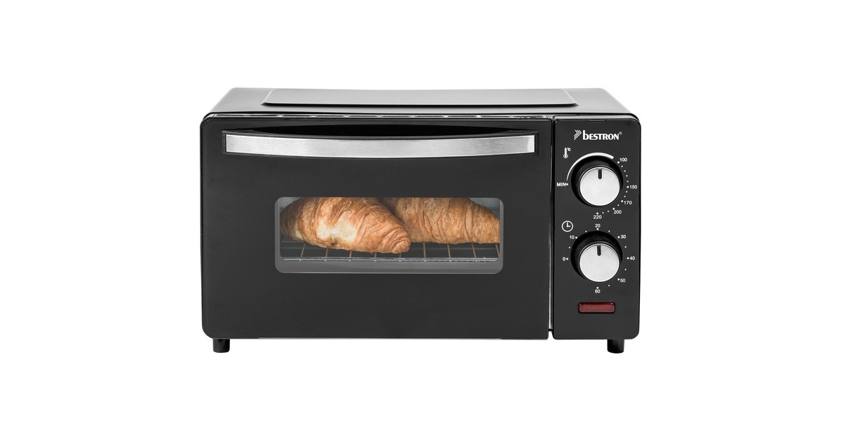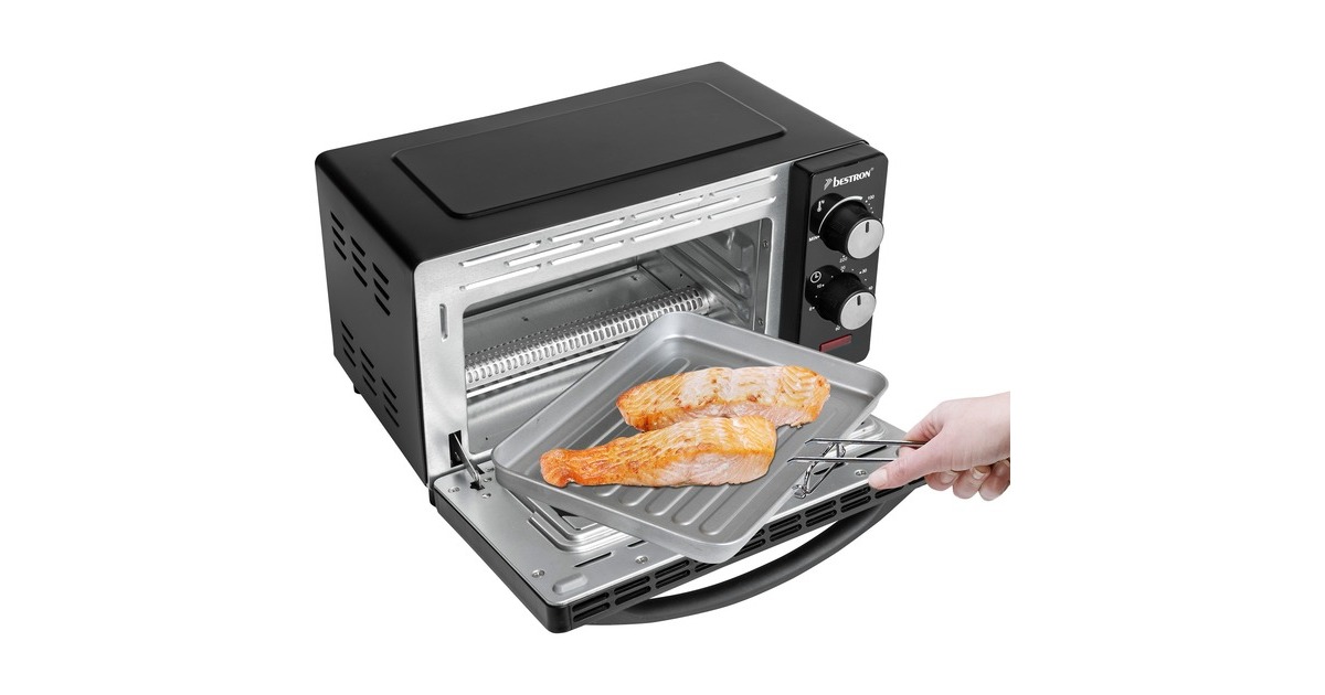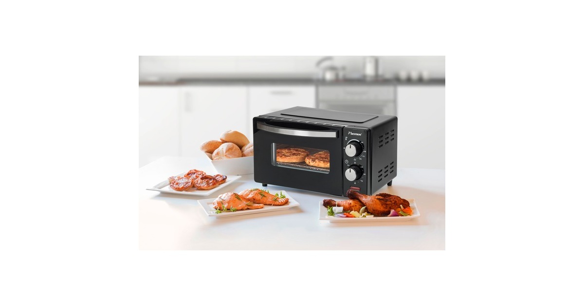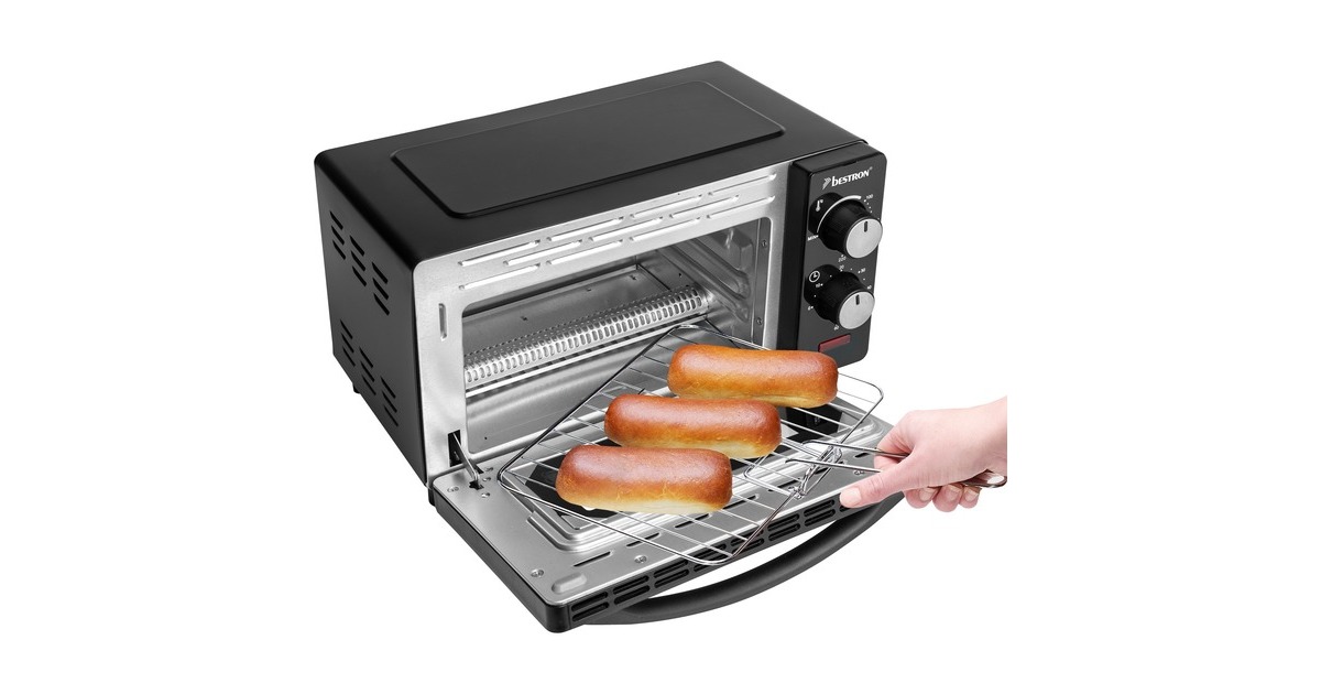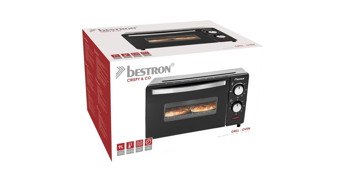 Der Grill-Backofen AOV9 von Bestron bietet einen Garraum von 9 Litern und ist damit ideal zum Zubereiten von Toasts, kleinen Ofengerichten oder zum Aufbacken von Brötchen gegeeignet. Der AOV9 verfügt über Ober- und Unterhitze sowie ein Backblech, einen Grillrost und eine Krümelschublade. Die Temperatur lässt sich bis 220°C einstellen. Er ist mit einem 60-Minuten-Timer mit Signalton nach Beenden der Backzeit und einer Abschaltautomatik ausgestattet.