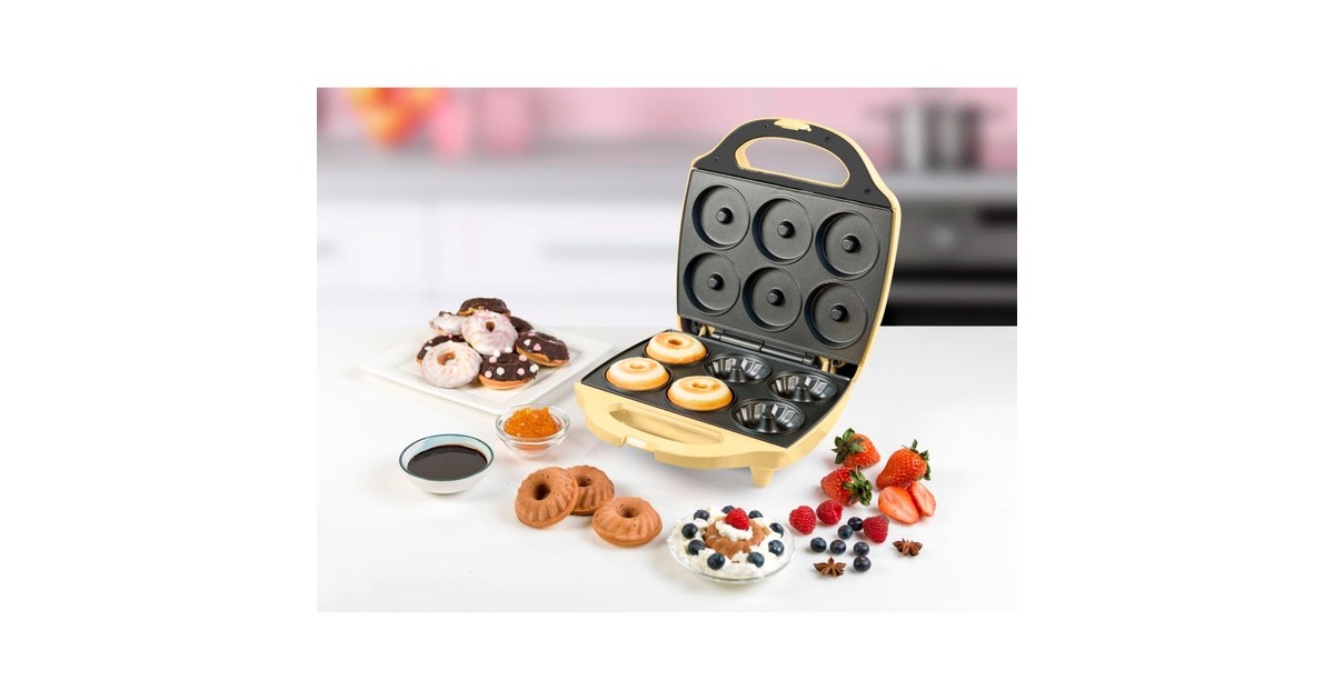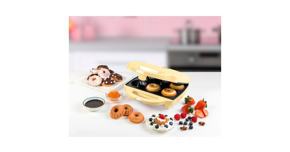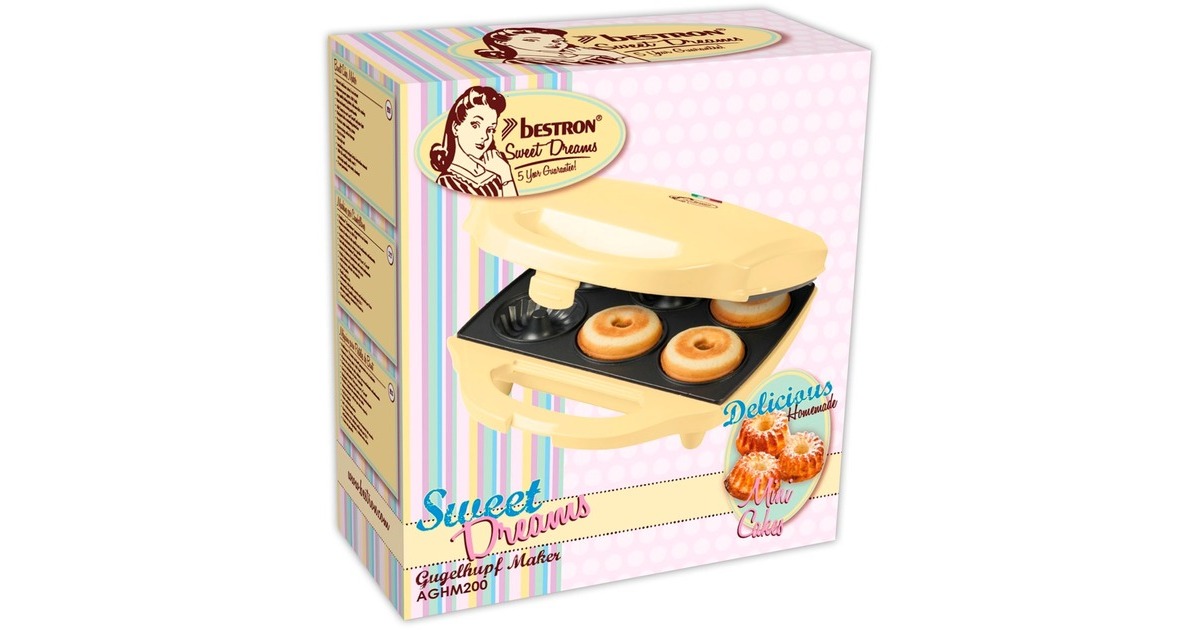 Der Gugelhupfmaker AGHM200 von Bestron backt im Handumdrehen sechs leckere kleine Gugelhupfe. Der Gugelhupfmaker ist innerhalb weniger Minuten einsatzbereit und die Bedienung ist dank der automatischen Temperaturregelung und der Bereitschaftsanzeige ein Kinderspiel. Die Antihaftbeschichtung sorgt für leichtes Entnehmen der leckeren Gugelhupfe und für eine einfache Reinigung. Das Gehäuse in zartem Gelb ist hitzebeständig und die Griffe sind wärmeisoliert. Für noch mehr Sicherheit sorgen die Antirutschfüße.Art.-Nr.: 1915008