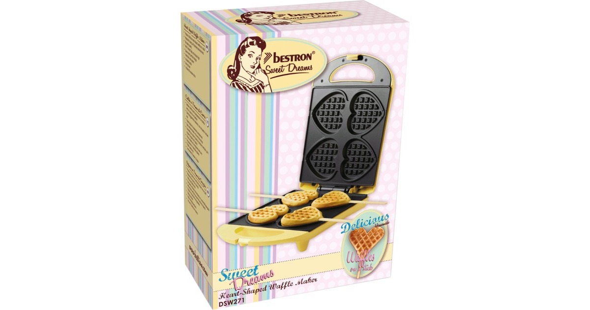 Mit dem Waffeleisen DSW271 von Bestron lassen sich herrliche kleine Herzwaffeln am Stiel zaubern. Das Gehäuse in strahlendem Gelb ist hoch hitzebeständig und die Griffe sind wärmeisoliert. Für noch mehr Sicherheit sorgen die Antirutschfüße. Die Reinigung ist dank der Antihaftbeschichtung ein Kinderspiel.