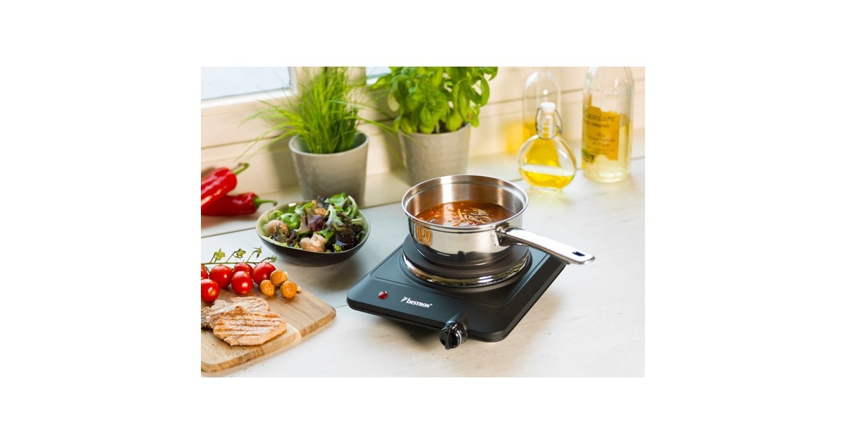 Die Einzelkochplatte AHP150 von Bestron ist mit 1500 Watt Leistung ausgestattet. Das Gehäuse ist hoch hitzebeständig lackiert. Die robuste Gusseisenplatte hat einen Durchmesser von ca. 18 cm. Durch das Thermostat kann die Temperatur stufenlos eingestellt werden. Für Sicherheit sorgen die Kontrollleuchte und die Antirutschfüße. Art.-Nr.: 1636847