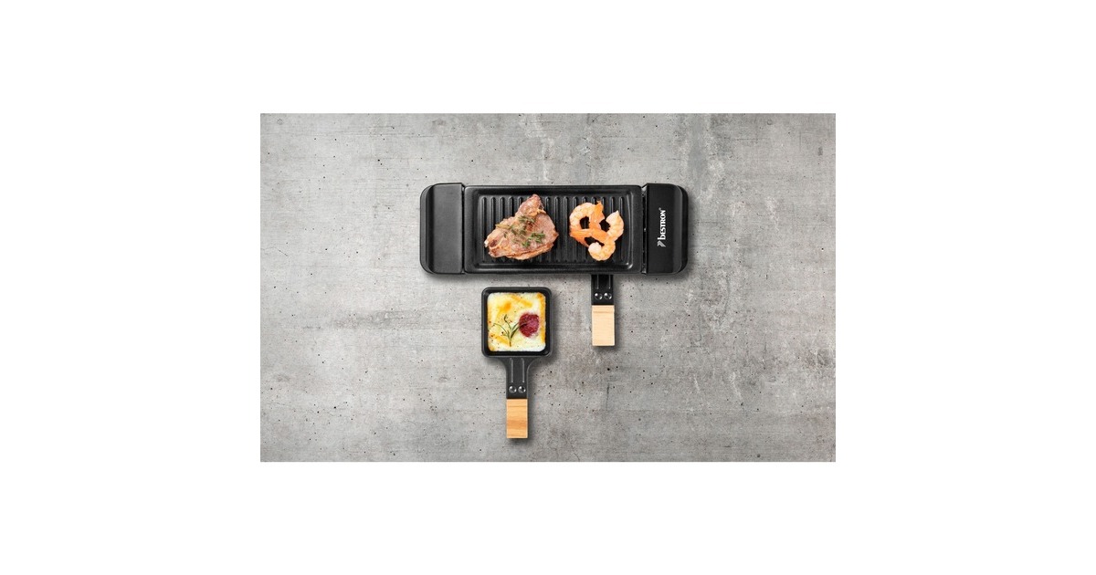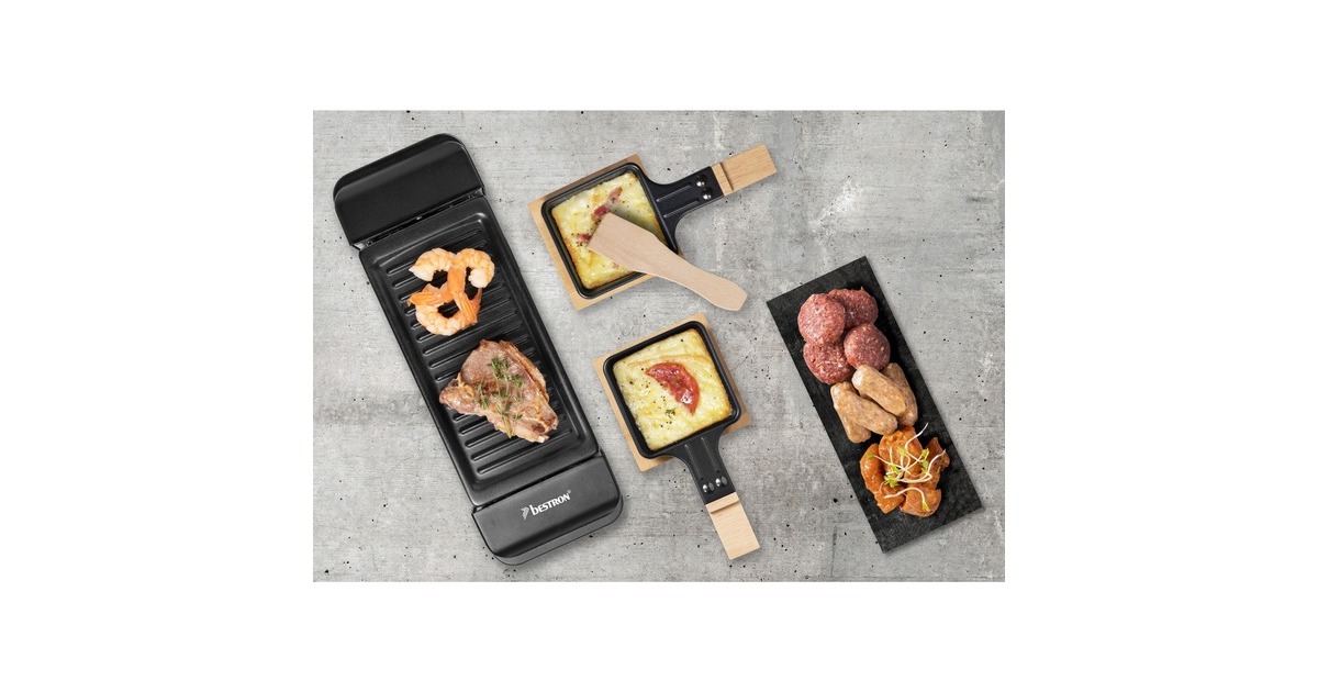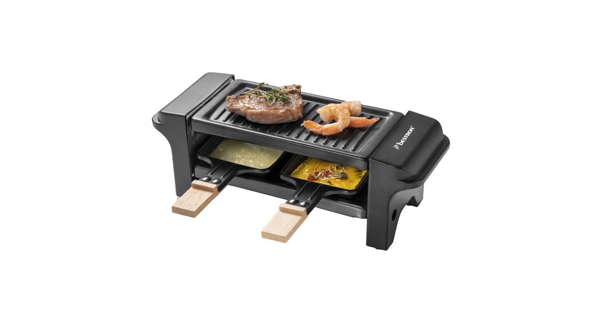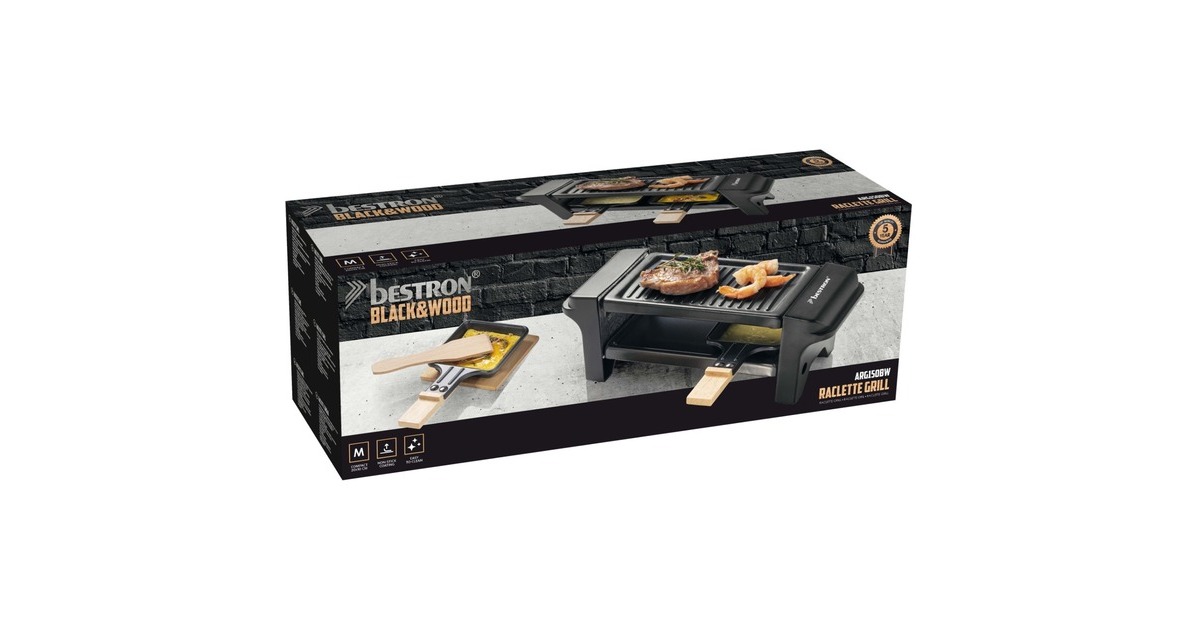 Das Bestron Mini Raclette der Black & Wood Serie im hochwertigen Holzdesign bietet Genuss im kompakten Format und eignet sich für zwei Personen. Die Bedienung ist über den Ein-/Ausschalter sehr einfach und durch die Leistung von 350 Watt ist das Gerät schnell einsatzbereit. Damit auch bei längerer Hitze nichts hängen bleibt, sind die Pfännchen mit einer Antihaftbeschichtung versehen. Auf der großen 10 x 20 cm großen, spülmaschinengeeigneten Grillplatte können Fleisch, Fisch und Gemüse gegrillt werden. Art.-Nr.: 1742922