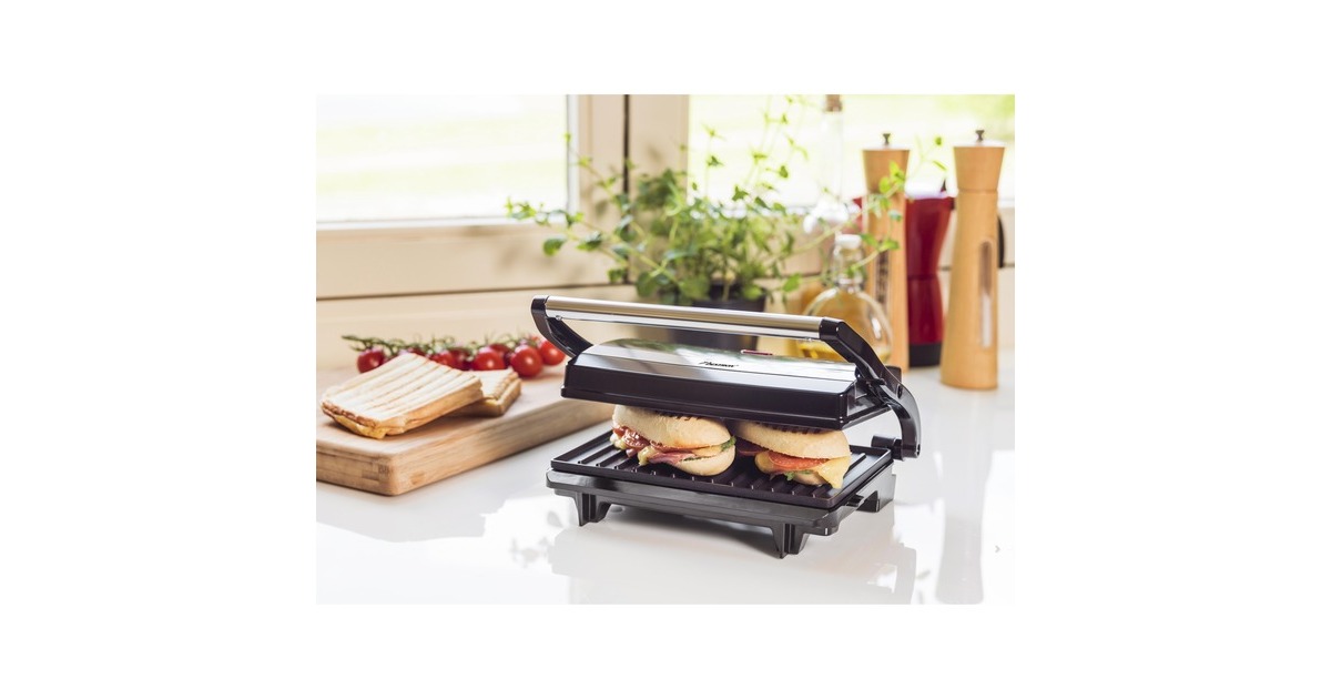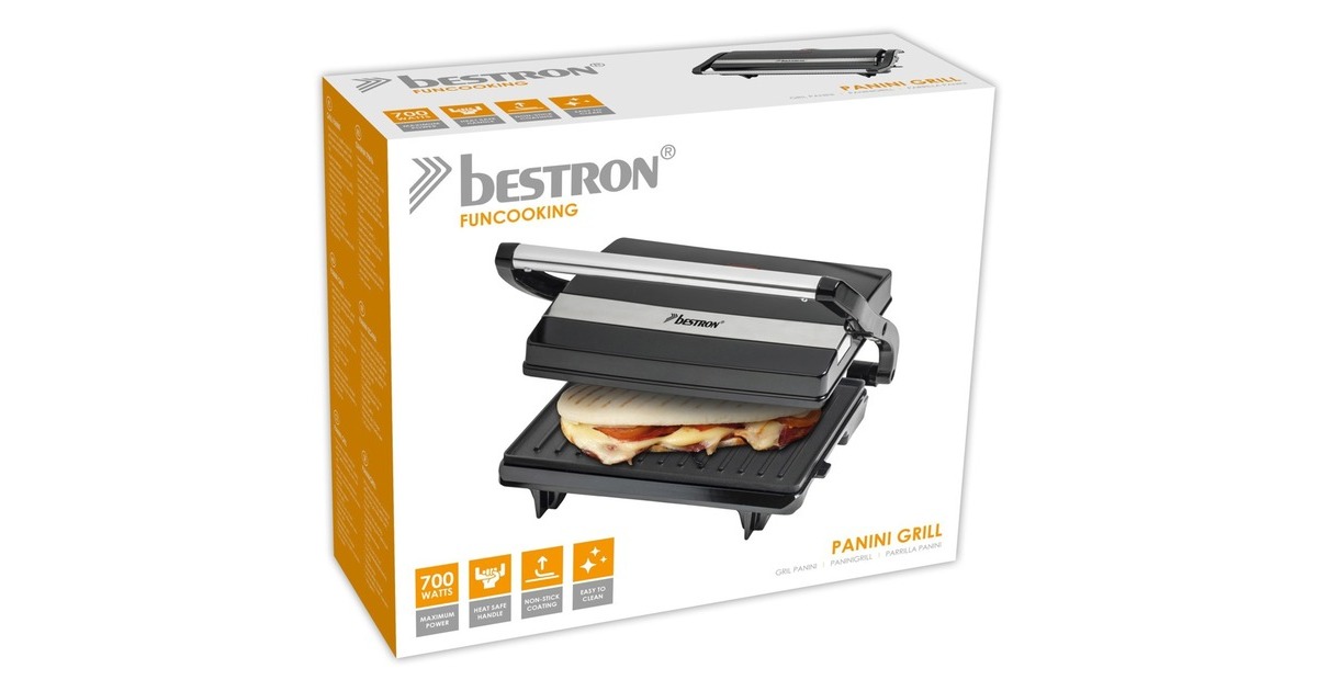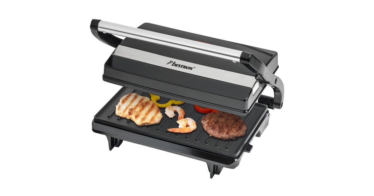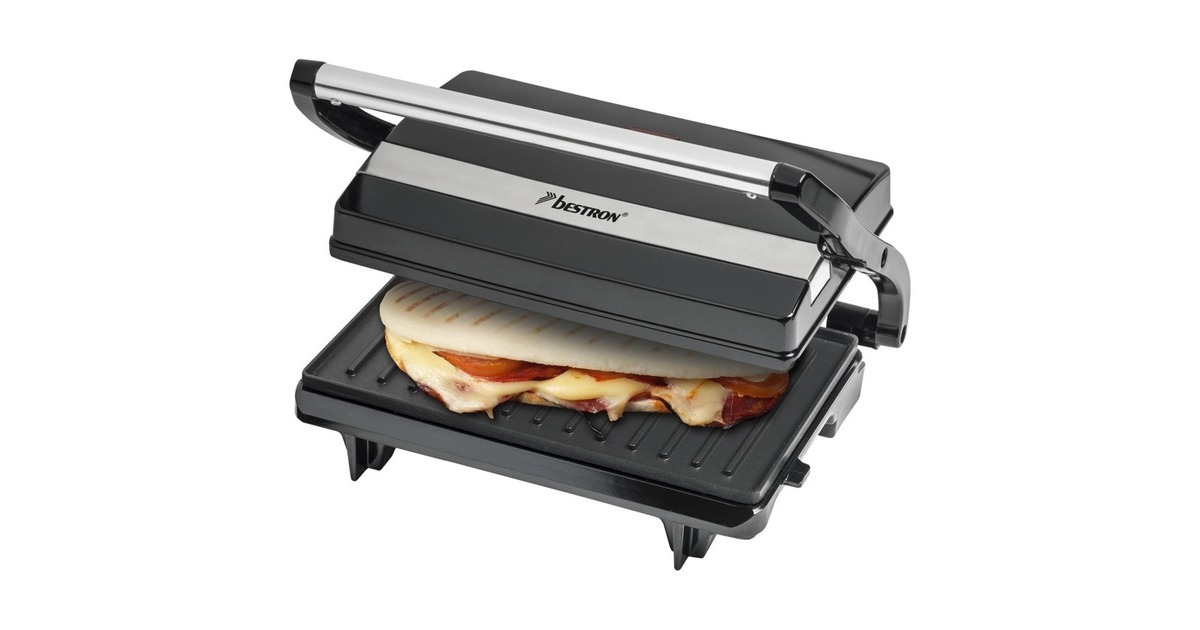 Der vielseitige Bestron APM123Z Panini-Grill ist minutenschnell einsetzbar zum Grillen und Toasten von Panini, Bruschetta, Toast, Gemüse, Gambas, Fleisch und Fisch und ähnlichem. Er eignet sich ideal zum komfortablen fettarmen Kontaktgrillen, das Grillgut wird dabei von beiden Seiten gleichzeitig erhitzt. Der APM123Z bietet außerdem eine Temperatur-Kontrollleuchte, einen großen wärmeisolierten Griff und eine Deckelverriegelung.Art.-Nr.: 1495008