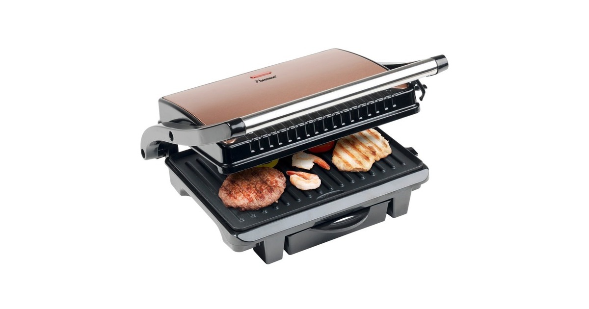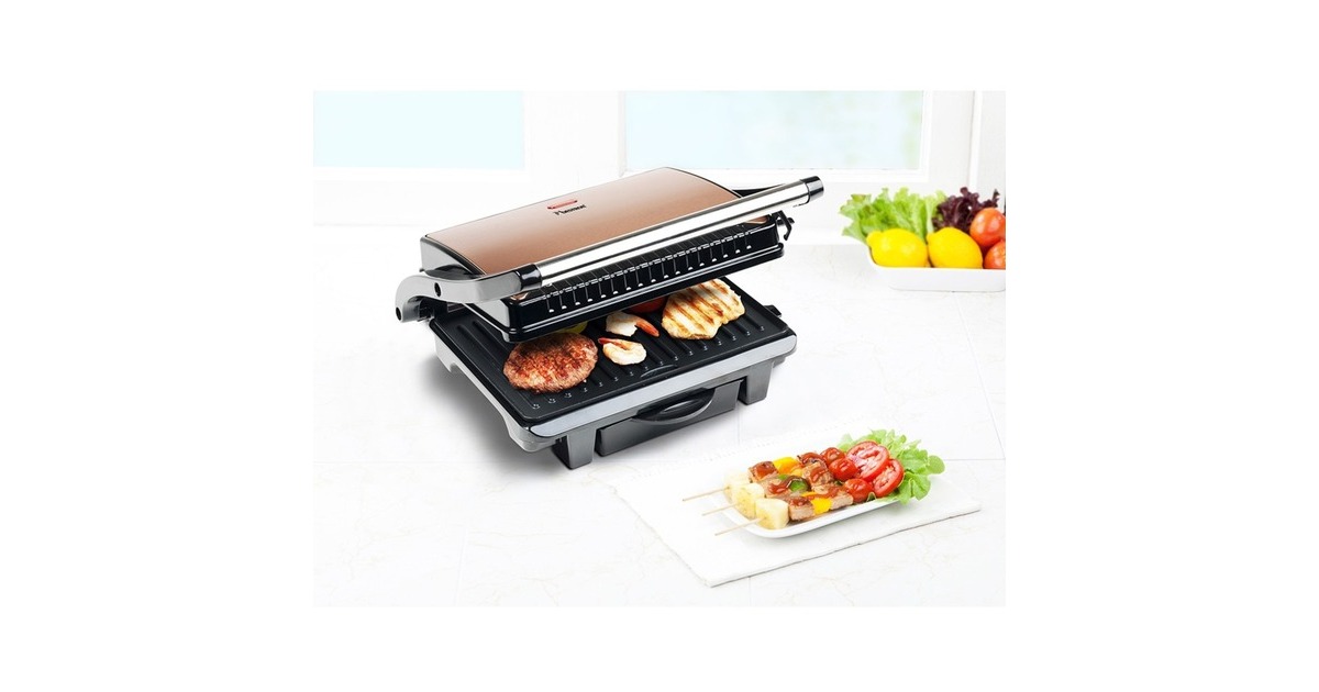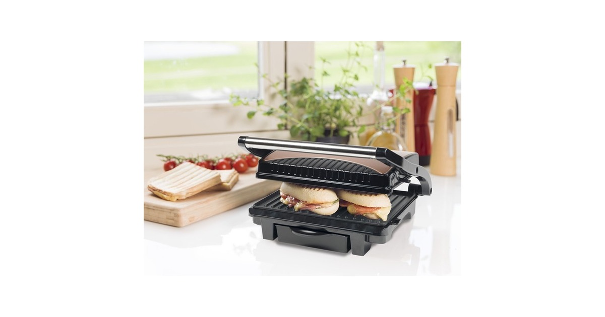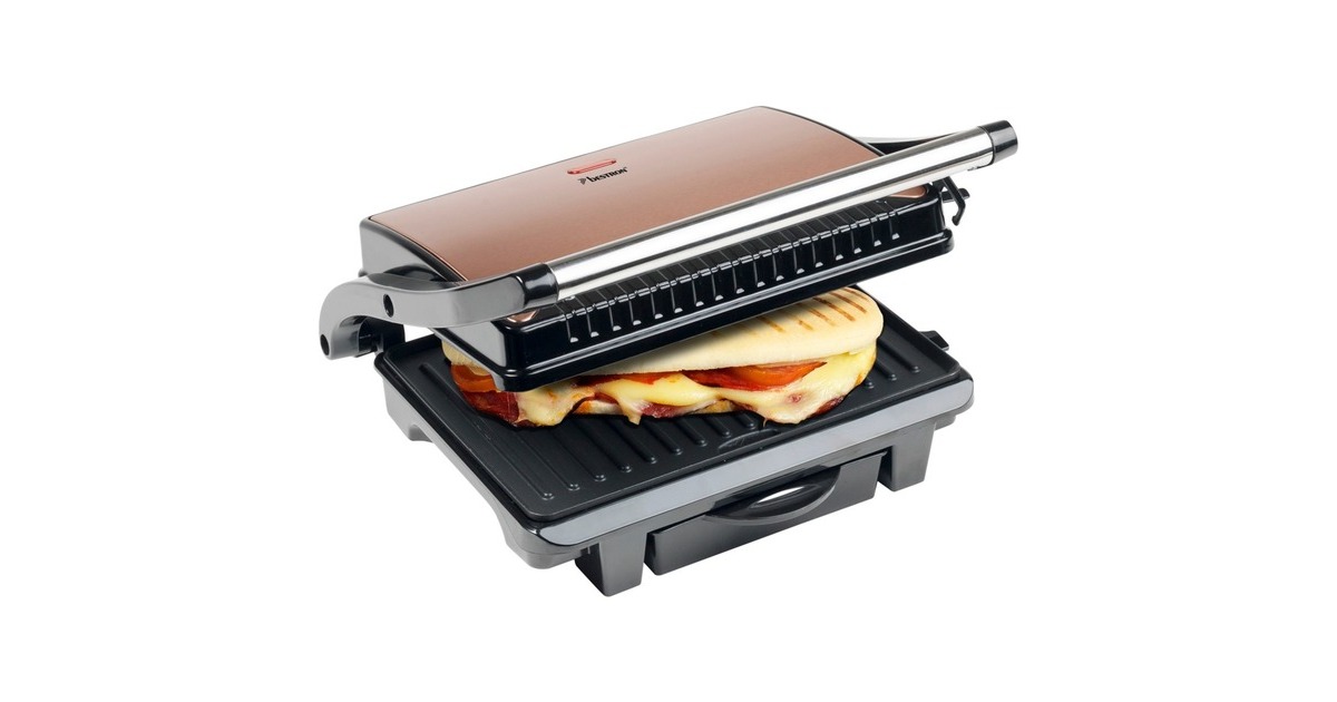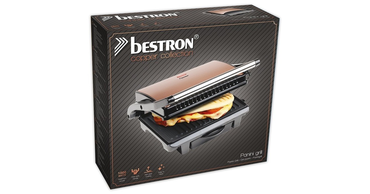 Der vielseitige Bestron ASW113CO Panini Grill ist minutenschnell einsetzbar zum Grillen und Toasten von Panini, Bruschetta, Toast, Gemüse, Gambas, Fleisch und Fisch und vielem mehr. Er eignet sich ideal zum komfortablen Kontaktgrillen, das Grillgut wird von beiden Seiten gleichzeitig erhitzt. Der Paninigrill ASW113CO ermöglicht fettarmes Grillen und gleichmäßiges Backen auf beiden Seiten, überschüssiges Fett kann in die Fettauffangschale ablaufen. Das stilvolle Kupfer-Design ist außerdem ein Hingucker in jeder Küche.Art.-Nr.: 1576234