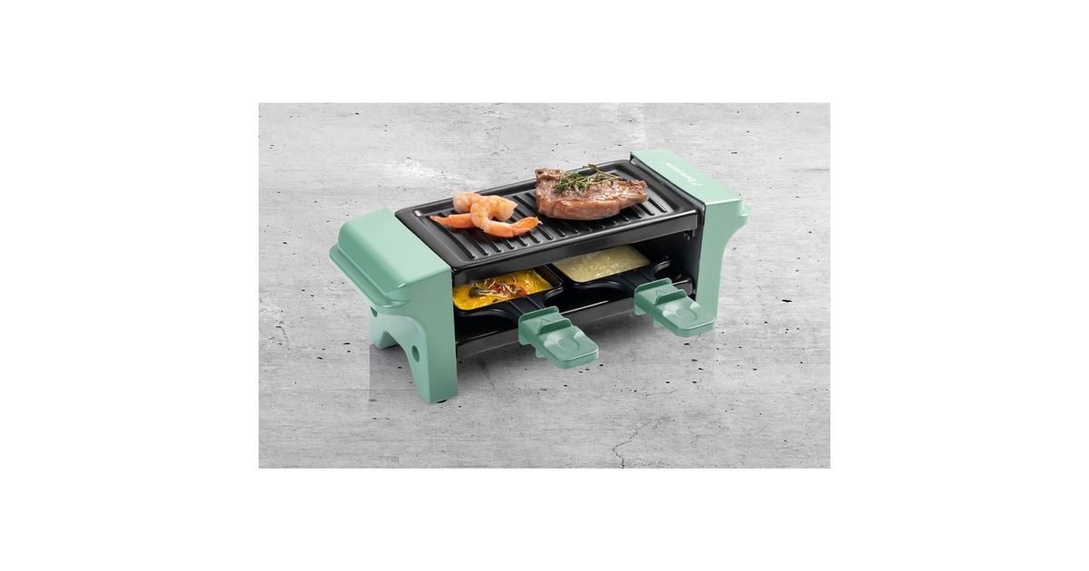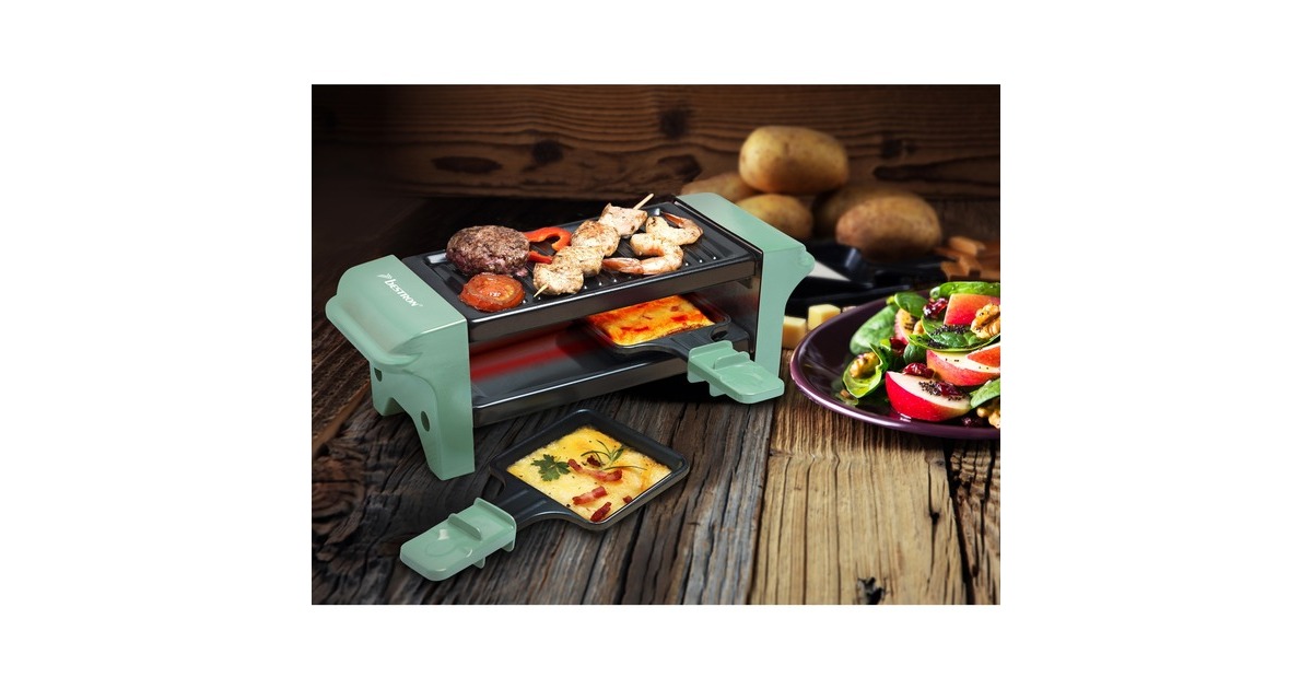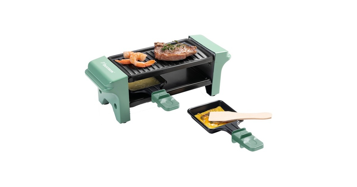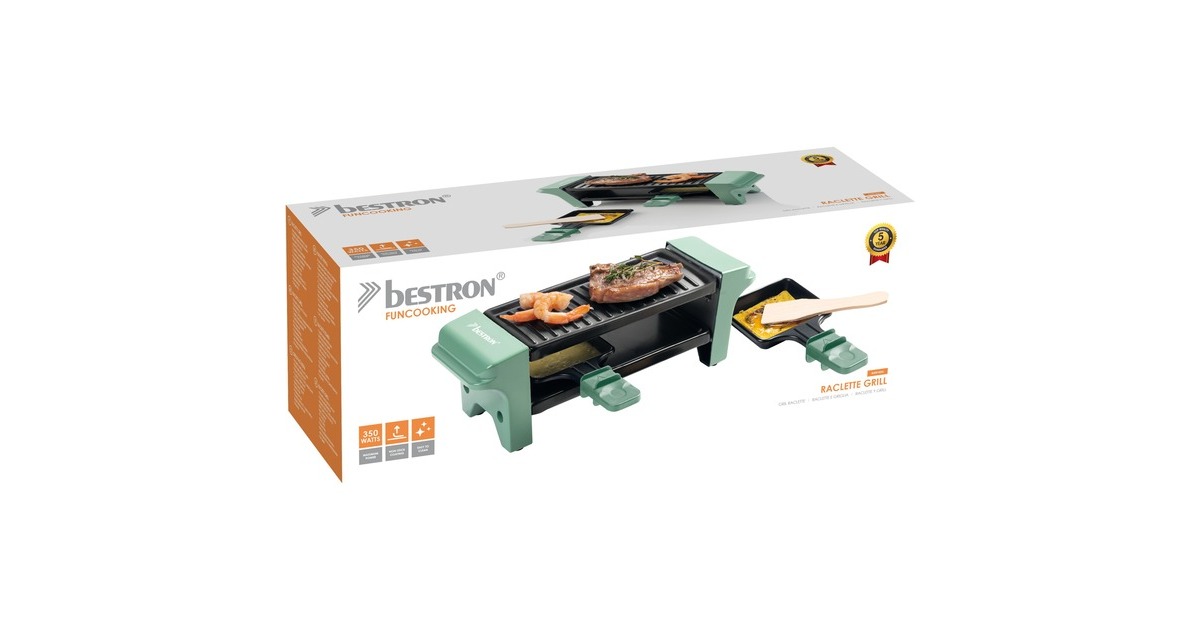 Der Bestron Raclette Grill bietet Genuss im kompakten Format und eignet sich für zwei Personen. Die Bedienung ist über den Ein-/Ausschalter sehr einfach. Damit auch bei längerer Hitze nichts hängen bleibt, sind die Pfännchen mit einer Antihaftbeschichtung versehen. Auf der großen 10 x 20 cm großen Grillplatte können Fleisch, Fisch und Gemüse gegrillt werden. Art.-Nr.: 1820352