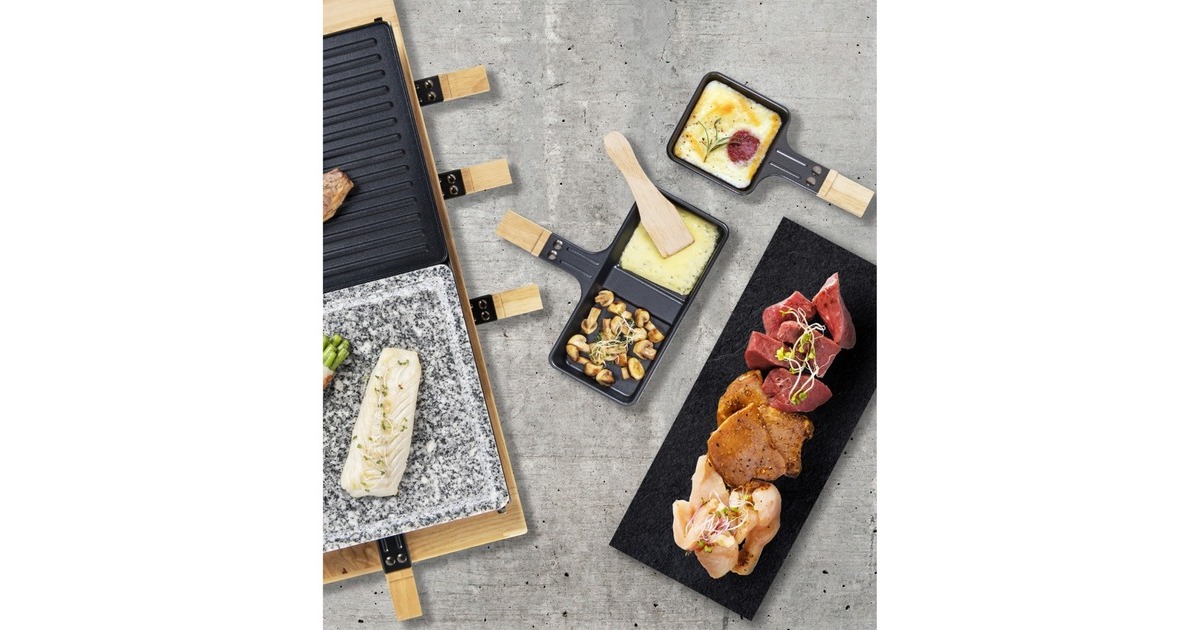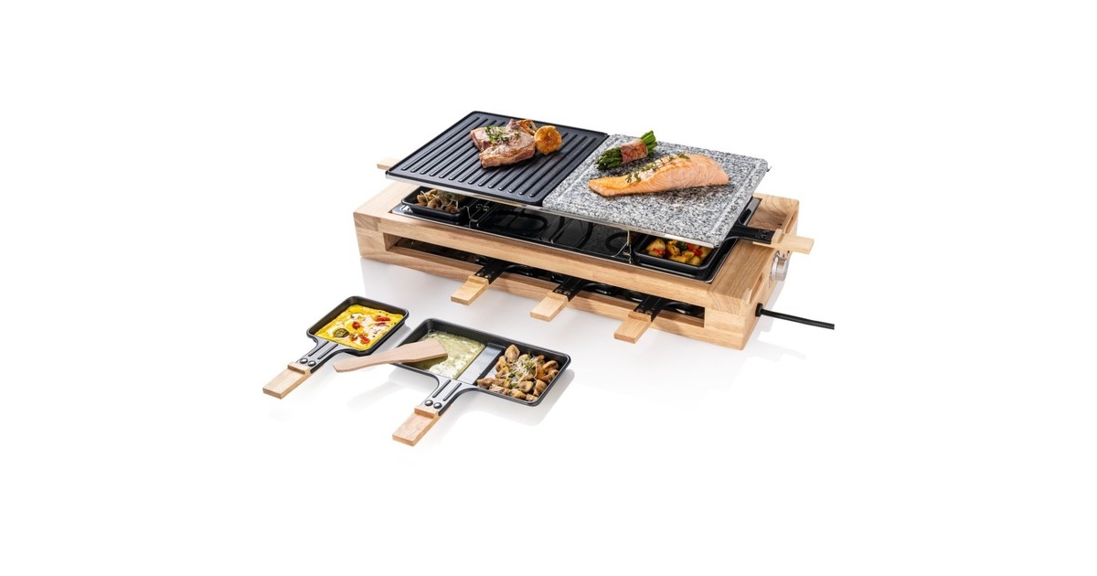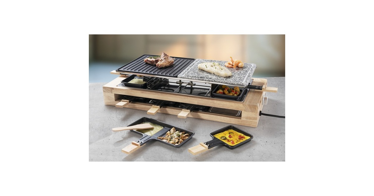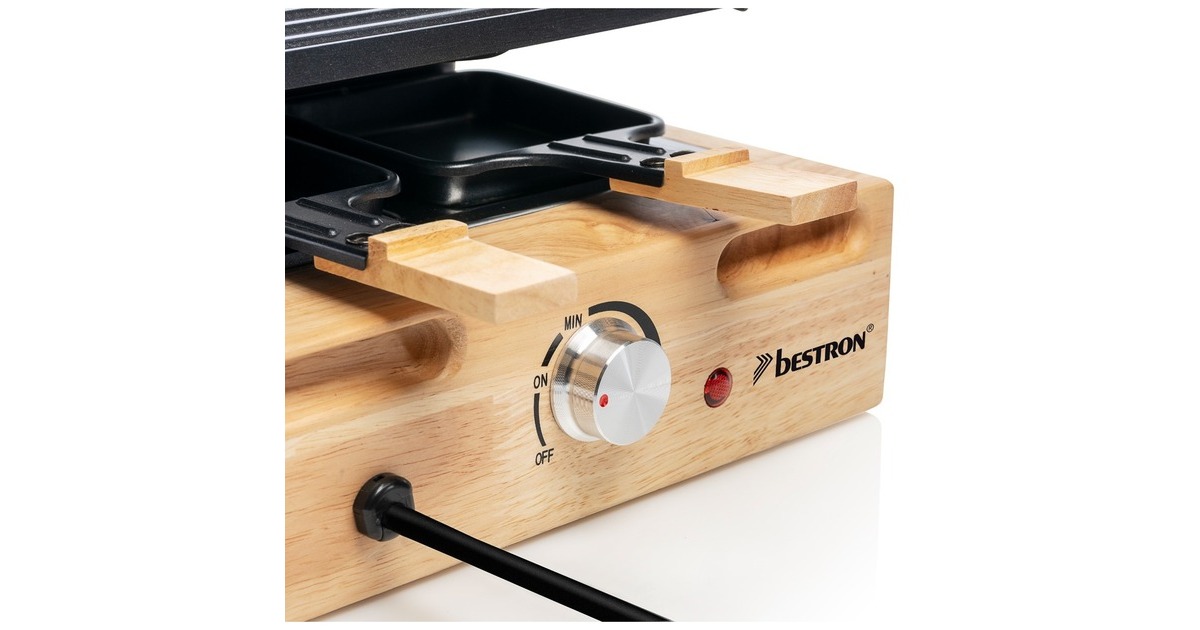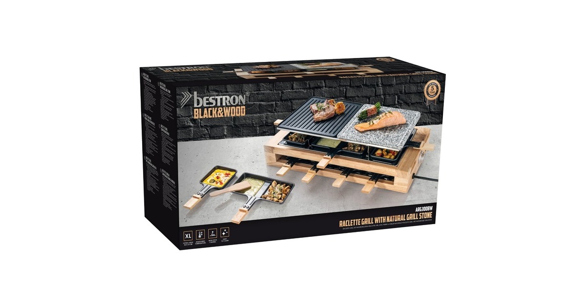 Der Bestron Raclette-Grill XL der Black & Wood Serie im hochwertigen Holzdesign bietet Partyspaß für acht Personen. Für ein optimales Grillergebnis verfügt der ARG300BW über eine kratz- und schnittfeste Grillsteinplatte (23x23cm) mit Saftrinne und eine antihaftbeschichtete Wendegrillplatte (23x23cm) aus Gusseisen mit gerillter Oberfläche. Die Bedienung ist dank stufenloser Temperaturregelung sehr einfach und durch die Leistung von 1500 Watt ist das Gerät schnell einsatzbereit. Im Lieferumfang sind 4x antihaftbeschichtete Doppelpfännchen, 8x antihaftbeschichtete Einzelpfännchen und 8x Holzschaber enthalten. Damit auch bei längerer Hitze nichts hängen bleibt, sind auch die Pfännchen mit einer Antihaftbeschichtung versehen. Art.-Nr.: 1742926