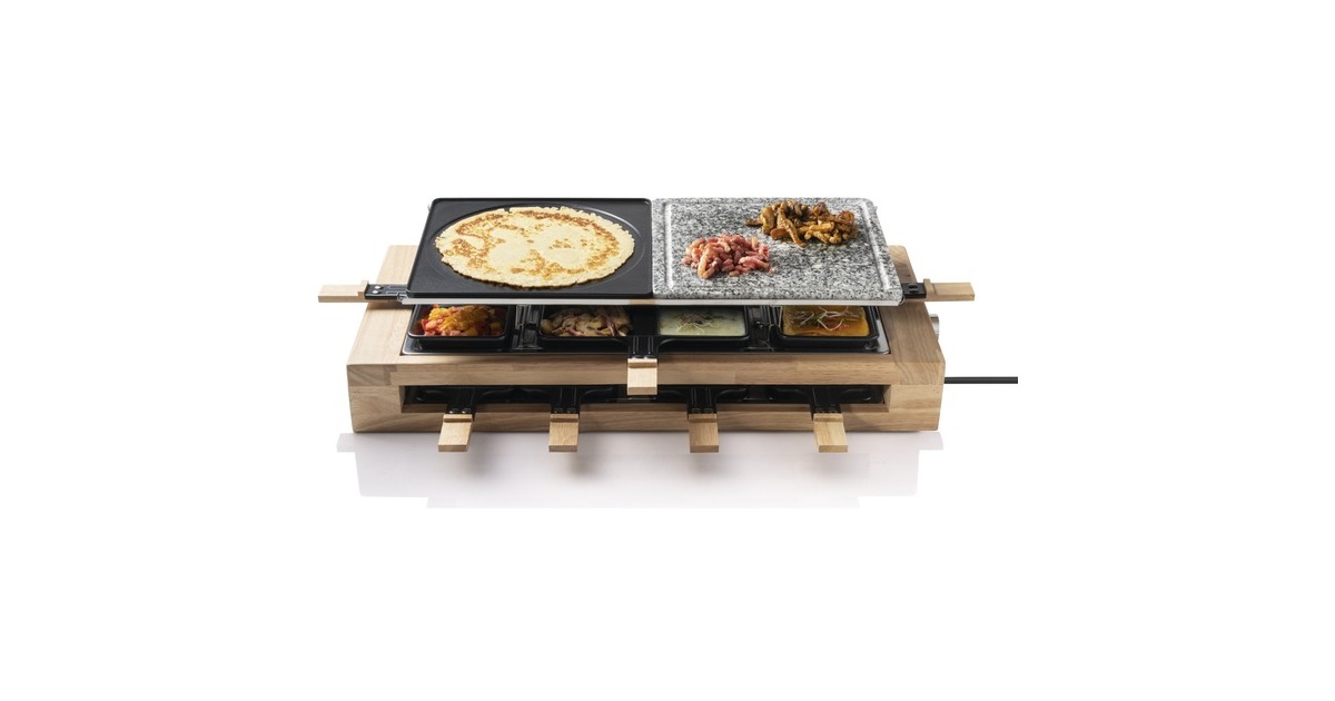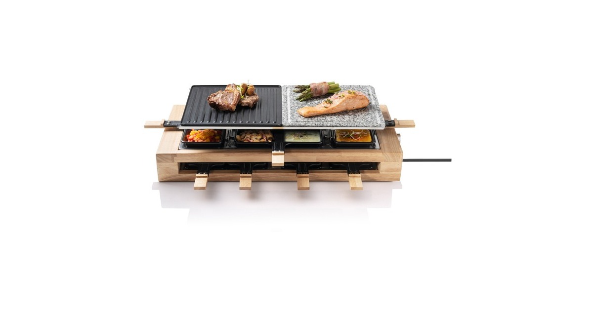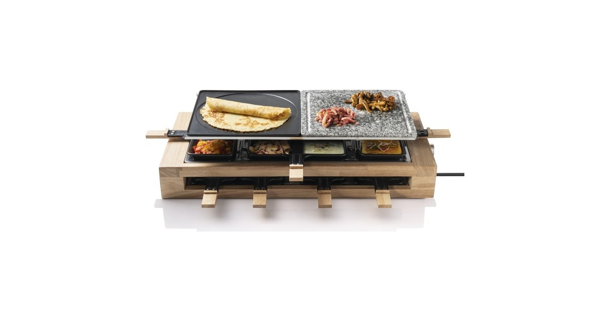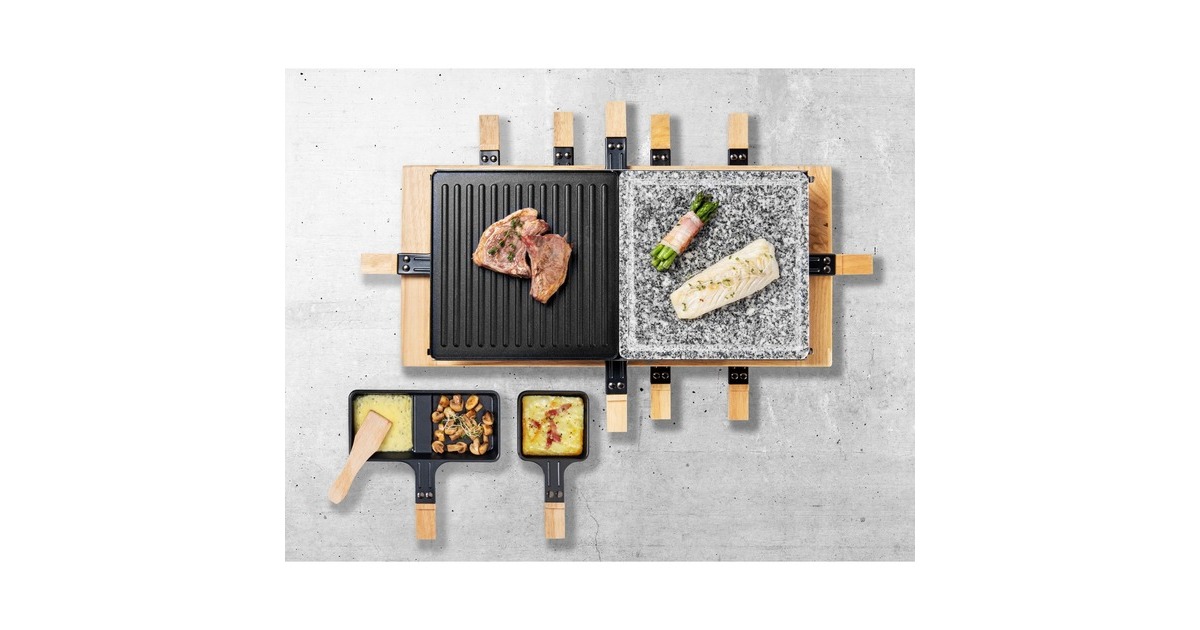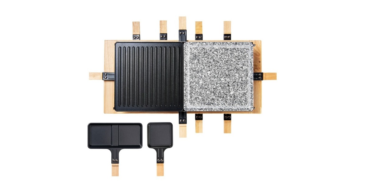 Der Bestron Raclette-Grill XL der Black & Wood Serie im hochwertigen Holzdesign bietet Partyspaß für acht Personen. Für ein optimales Grillergebnis verfügt der ARG300BW über eine kratz- und schnittfeste Grillsteinplatte (23x23cm) mit Saftrinne und eine antihaftbeschichtete Wendegrillplatte (23x23cm) aus Gusseisen mit gerillter Oberfläche. Die Bedienung ist dank stufenloser Temperaturregelung sehr einfach und durch die Leistung von 1500 Watt ist das Gerät schnell einsatzbereit. Im Lieferumfang sind 4x antihaftbeschichtete Doppelpfännchen, 8x antihaftbeschichtete Einzelpfännchen und 8x Holzschaber enthalten. Damit auch bei längerer Hitze nichts hängen bleibt, sind auch die Pfännchen mit einer Antihaftbeschichtung versehen. Art.-Nr.: 1742926