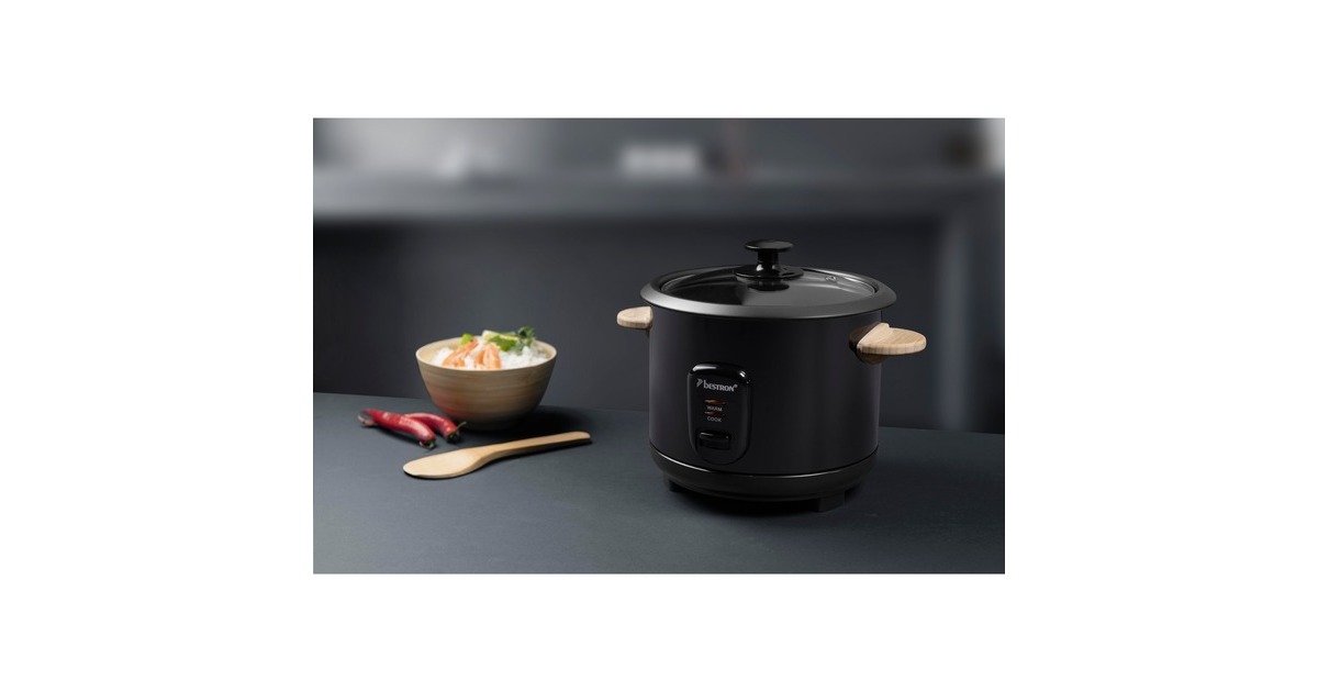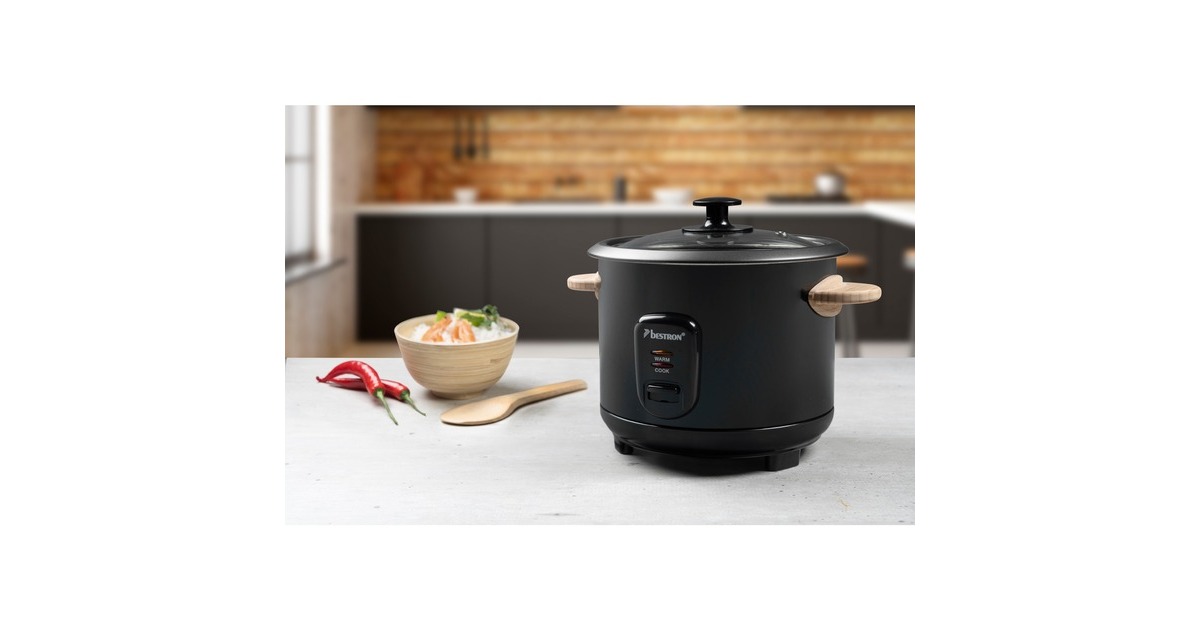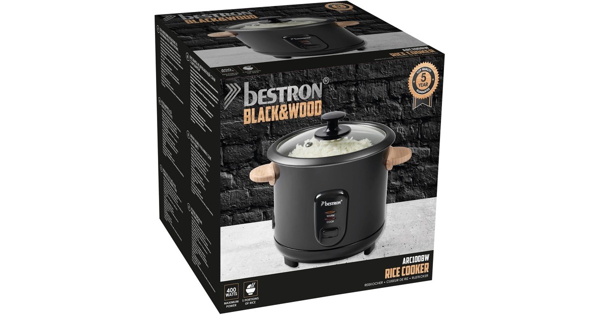 Der Reiskocher ARC100BW von Bestron kocht schnell und vollautomatisch alle Sorten Reis sowie Natur, Basmati, Risotto, Wild, Sushi Reis etc. Mit 1 Liter Volumen können bis zu 750g Reis zubereitet werden, das reicht für vier bis acht Personen. Die Warmhaltefunktion hält den Reis nach dem Kochen für längere Zeit auf der perfekten Temperatur. Über den Glasdeckel mit Dampfaustrittsöffnung hat man den Reis immer im Blick. Der Innentopf mit Messskala ist zur einfachen Reinigung herausnehmbar und mit einer spülmaschinenfesten Antihaftbeschichtung ausgestattet. Die Bedienung erfolgt ganz einfach über einen Ein-/Aus-Schalter. Es gibt jeweils eine Kontrollleuchte zum Kochen und zum Warmhalten.