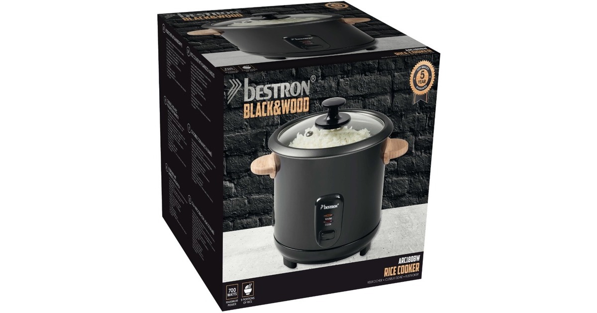 Der Reiskocher ARC180BW von Bestron kocht schnell und vollautomatisch alle Sorten Reis sowie Natur, Basmati, Risotto, Wild, Sushi Reis etc. Mit 1,8 Liter Volumen können bis zu 1.350 g Reis zubereitet werden, das reicht für acht bis zehn Personen. Die Warmhaltefunktion hält den Reis nach dem Kochen für längere Zeit auf der perfekten Temperatur. Über den Glasdeckel mit Dampfaustrittsöffnung hat man den Reis immer im Blick. Der Innentopf mit Messskala ist zur einfachen Reinigung herausnehmbar und mit einer spülmaschinenfesten Antihaftbeschichtung ausgestattet. Die Bedienung erfolgt ganz einfach über einen Ein-/Aus-Schalter. Es gibt jeweils eine Kontrollleuchte zum Kochen und zum Warmhalten.