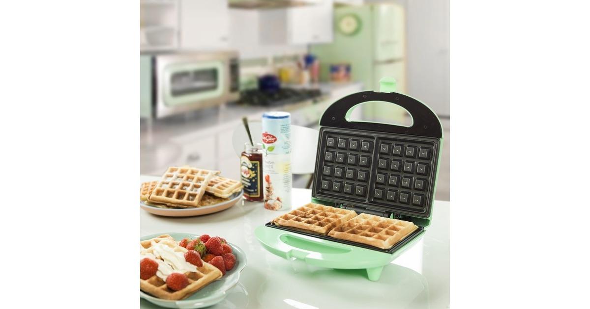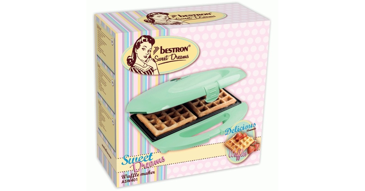 Mit dem Waffeleisen ASW401 von Bestron lassen sich zwei herrliche Brüsseler Waffeln zaubern. Das Gehäuse in frischem Hellgrün ist hoch hitzebeständig und die Griffe sind wärmeisoliert. Für noch mehr Sicherheit sorgen die Antirutschfüße. Die Reinigung ist dank der Antihaftbeschichtung ein Kinderspiel. Art.-Nr.: 1435857