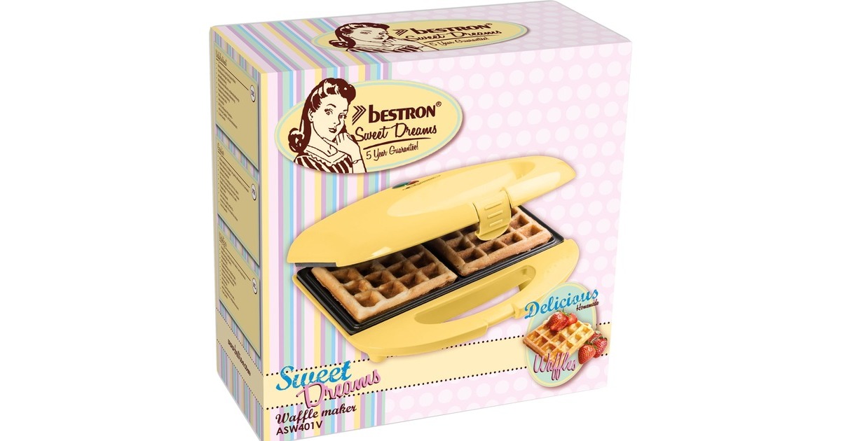 Mit dem Waffeleisen ASW401 von Bestron lassen sich zwei herrliche Brüsseler Waffeln zaubern. Das Gehäuse in zartem Gelb ist hoch hitzebeständig und die Griffe sind wärmeisoliert. Für noch mehr Sicherheit sorgen die Antirutschfüße. Die Reinigung ist dank der Antihaftbeschichtung ein Kinderspiel. Art.-Nr.: 1820272