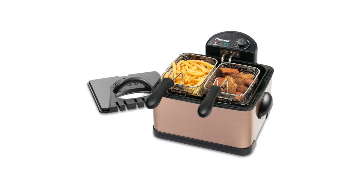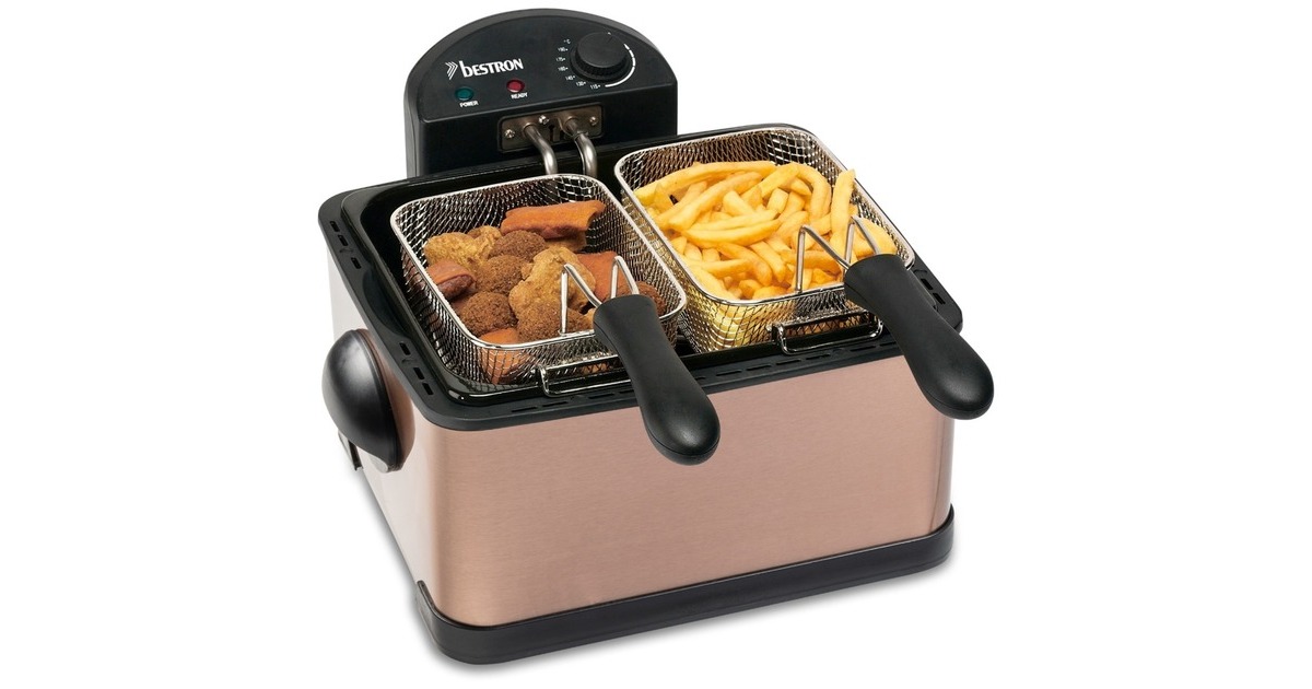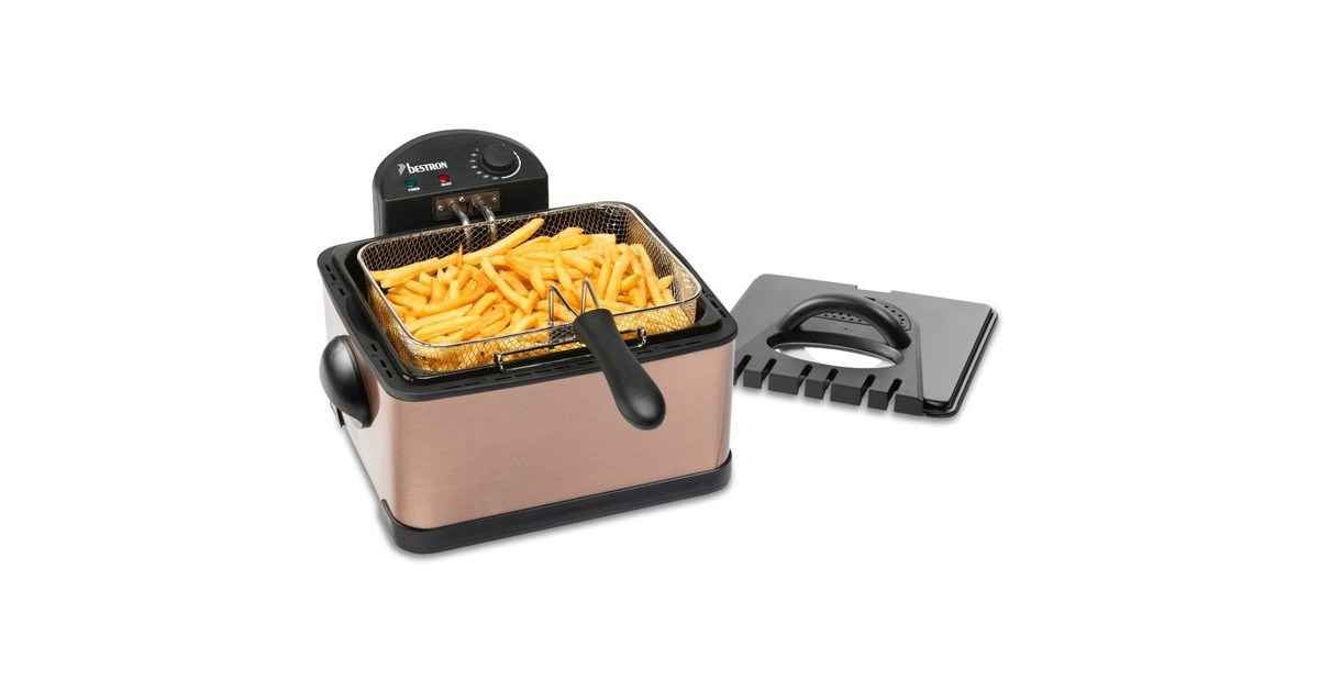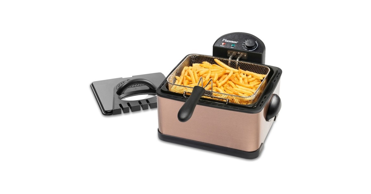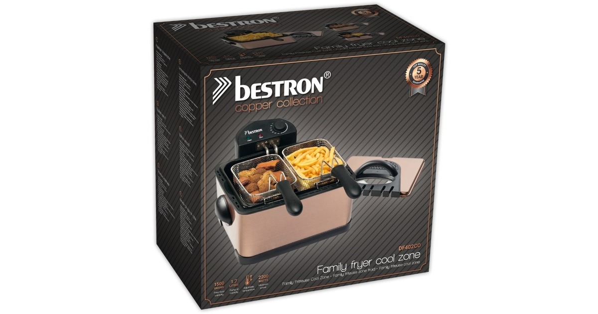 Die XL Fritteuse DF402CO von Bestron mit Kaltzonentechnologie im hochwertigen Kupfer-Design, erhitzt mit 2000 Watt im Handumdrehen das Frittierfett. Der herausnehmbare, emaillierter Fettbehälter fasst 4,5 l. Es gibt einen großen Frittierkorb und zwei kleine. Mit dem Großen können in einem Durchgang bis zu 1,5 kg Pommes oder bis zu 20 Frikadellen frittiert werden. Die kleinen Körbe fassen jeweils 750 g. Die Betriebstemperatur lässt sich stufenlos bis 190 Grad regeln. Im Deckel der XL Fritteuse befindet sich ein auswechselbarer Geruchsfilter sowie ein Sichtfenster. Anti-Rutsch-Füße und wärmeisolierte Handgriffe sorgen für einen sicheren Gebrauch und danach lässt sich das Gerät vollständig zerlegen und in der Spülmaschine reinigen – außer das Heizelement.