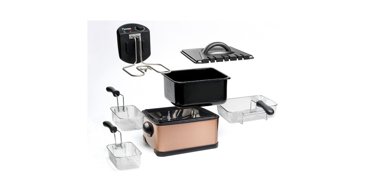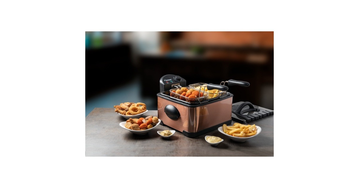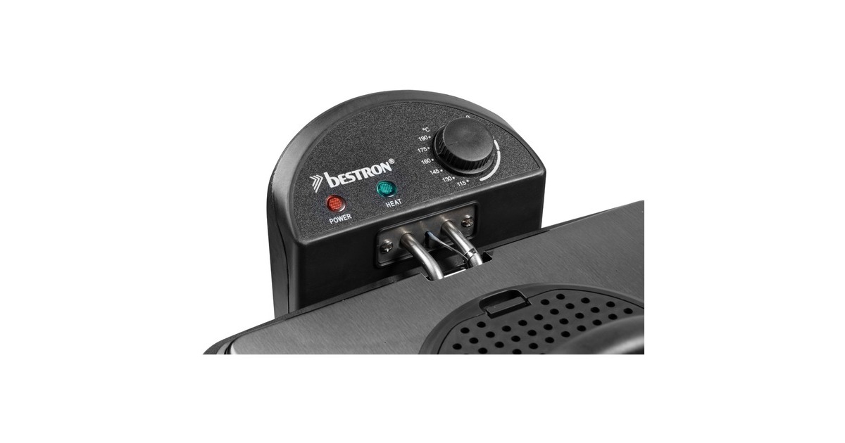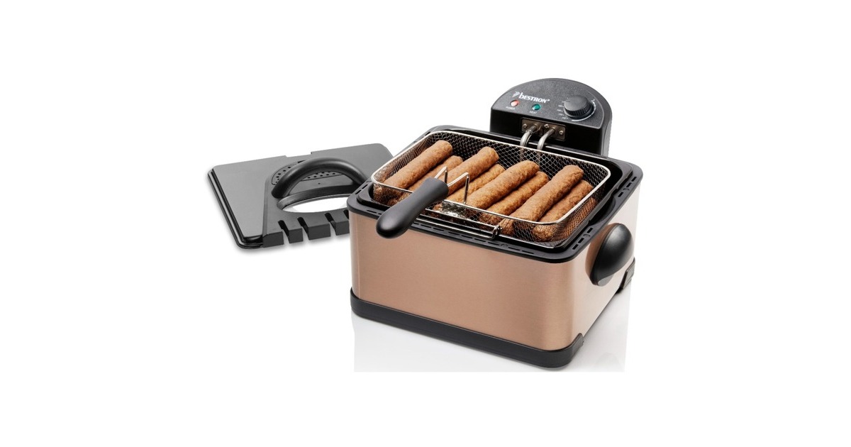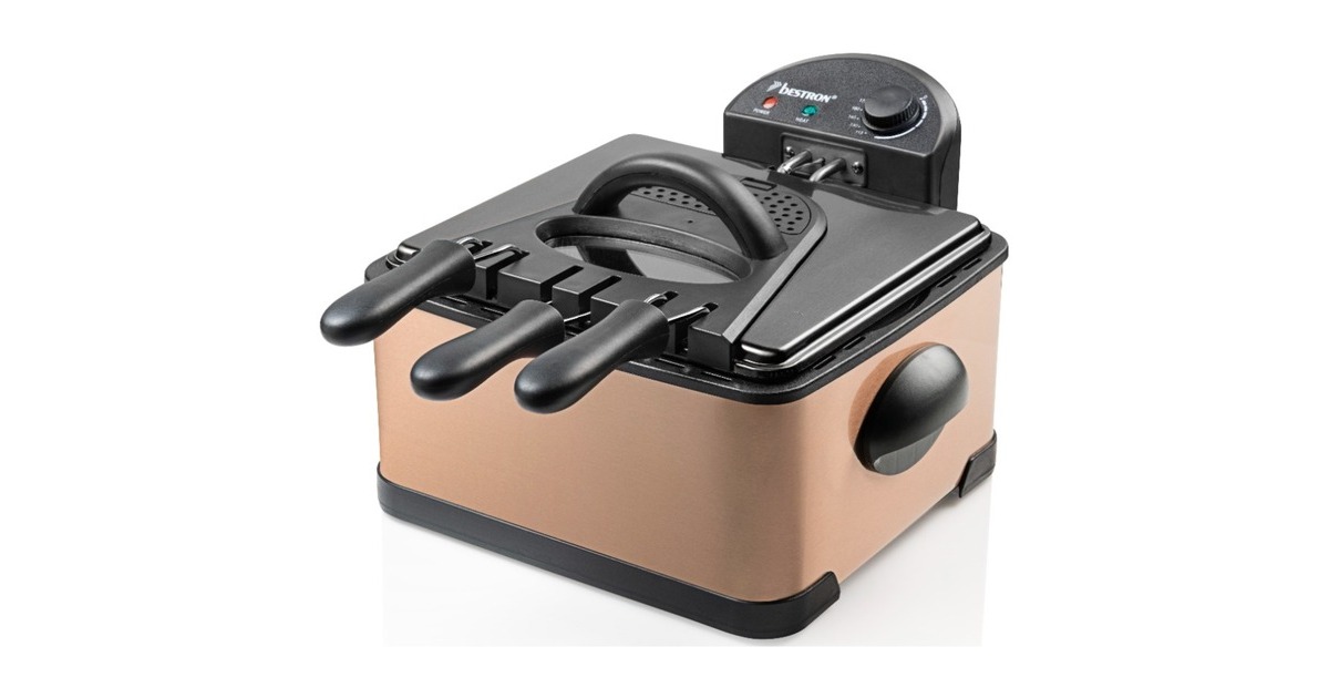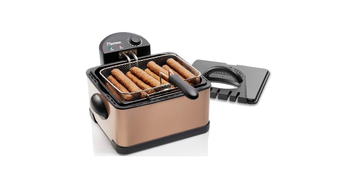 Die XL Fritteuse DF402CO von Bestron mit Kaltzonentechnologie im hochwertigen Kupfer-Design, erhitzt mit 2000 Watt im Handumdrehen das Frittierfett. Der herausnehmbare, emaillierter Fettbehälter fasst 4,5 l. Es gibt einen großen Frittierkorb und zwei kleine. Mit dem Großen können in einem Durchgang bis zu 1,5 kg Pommes oder bis zu 20 Frikadellen frittiert werden. Die kleinen Körbe fassen jeweils 750 g. Die Betriebstemperatur lässt sich stufenlos bis 190 Grad regeln. Im Deckel der XL Fritteuse befindet sich ein auswechselbarer Geruchsfilter sowie ein Sichtfenster. Anti-Rutsch-Füße und wärmeisolierte Handgriffe sorgen für einen sicheren Gebrauch und danach lässt sich das Gerät vollständig zerlegen und in der Spülmaschine reinigen – außer das Heizelement.