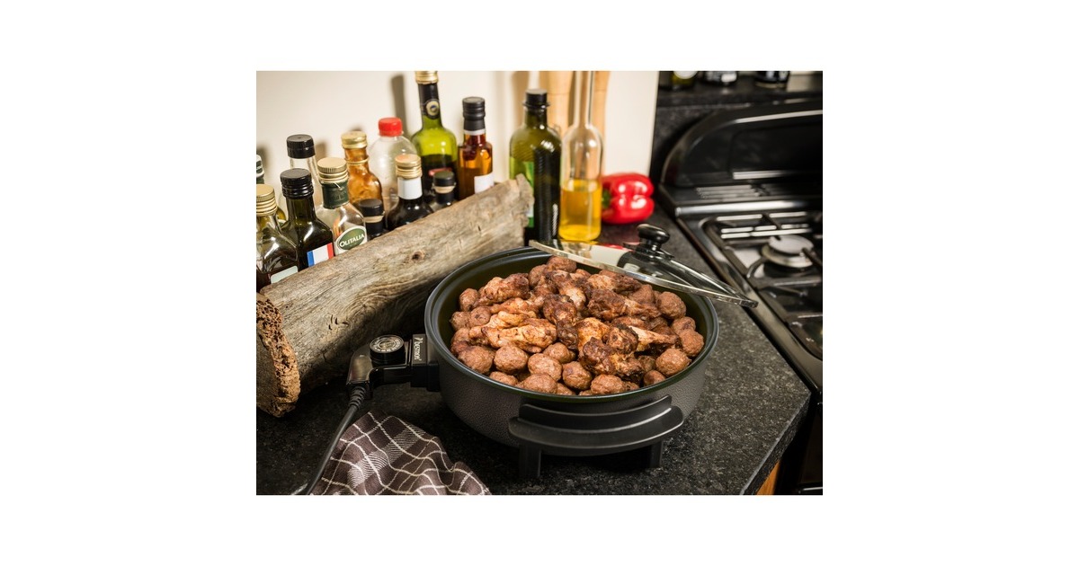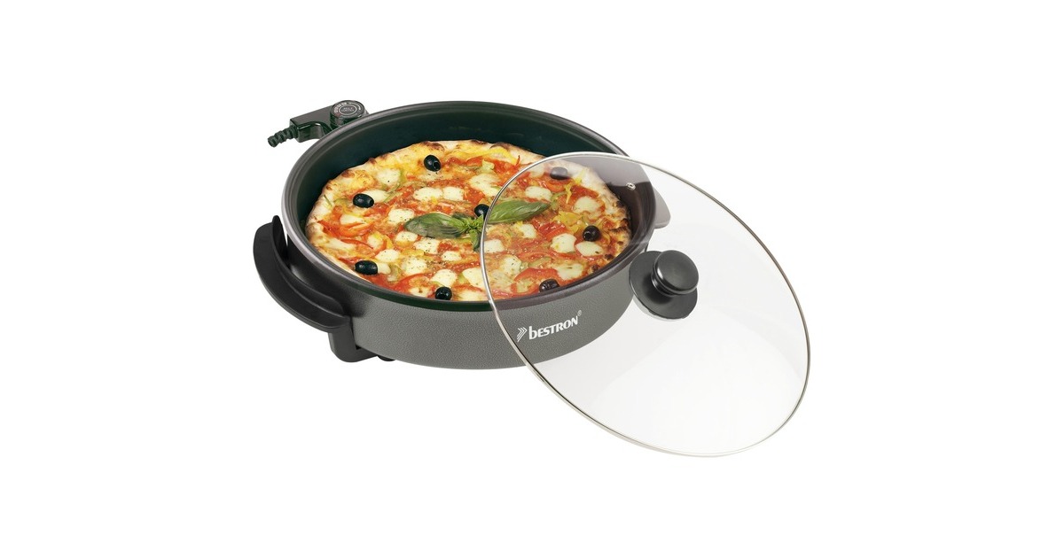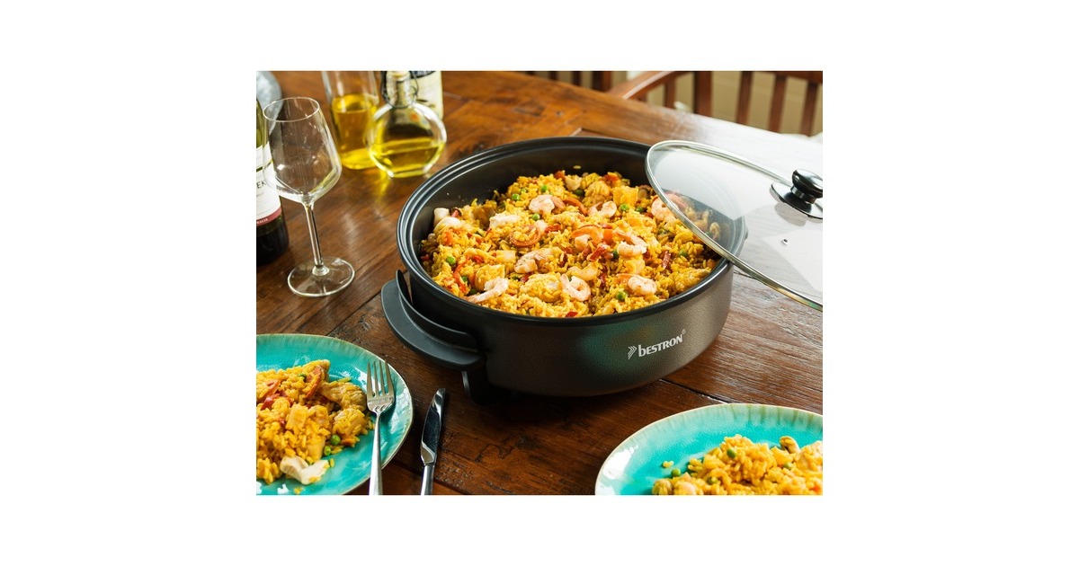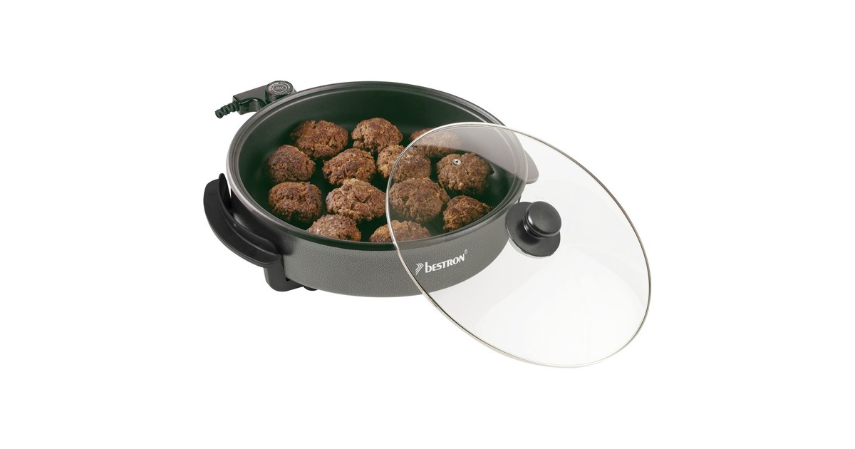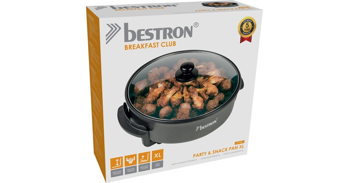 Mit der XL Multifunktions-Party-/Snackpfanne AHP1800Z von Bestron lassen sich Speisen braten, backen oder warmhalten. Mit dem extra hohen Rand ist sie perfekt geeignet für Frikadellen, Nudeln, Paella, Chili con Carne, oder aber auch Pizza. Die Temperatur lässt sich stufenlos über einen abnehmbaren Drehschalter mit Thermostat und Kontrollleuchte einstellen. Durch die Anithaftbeschichtung wird weniger Fett benötigt und die Reinigung vereinfacht. Der Glasdeckel mit Dampfventil ist spülmaschinengeeignet. Die wärmeisolierten Griffe und die Antirutschfüße sorgen für Sicherheit. Ein farbiges Booklet mit vielseitigen Serviervorschlägen ist im Lieferumfang enthalten.Art.-Nr.: 1742903