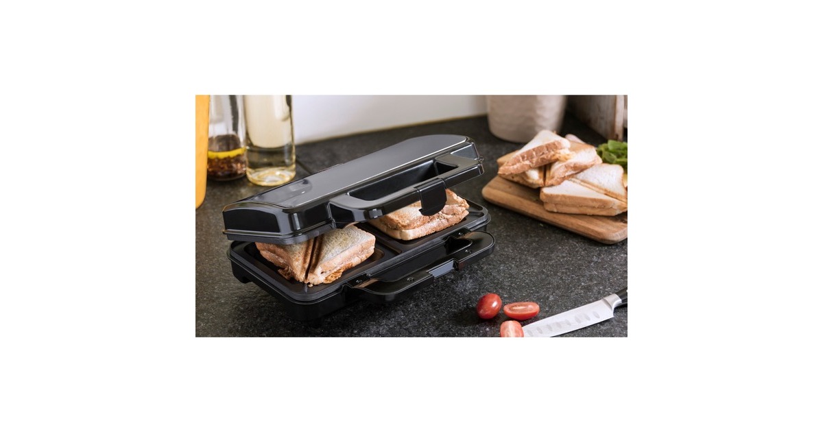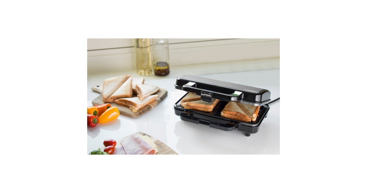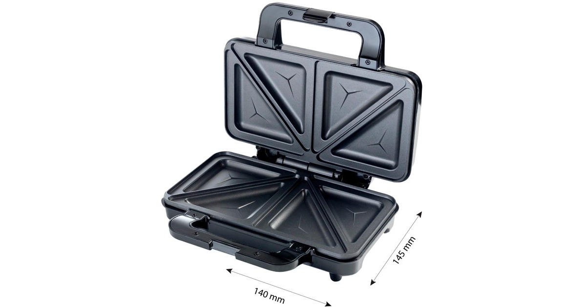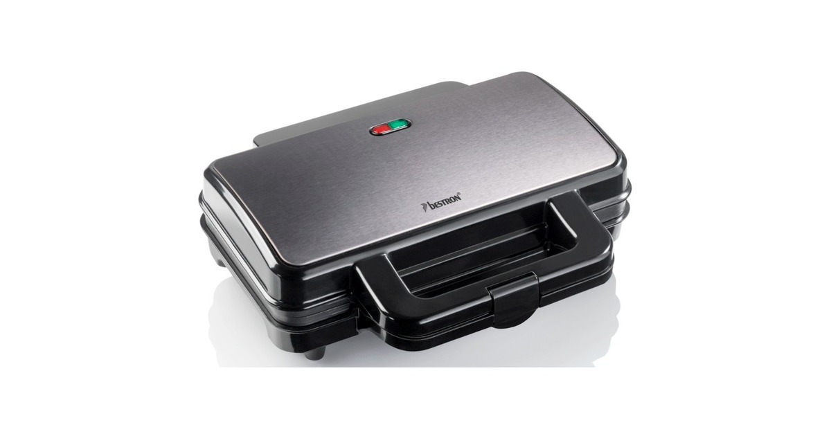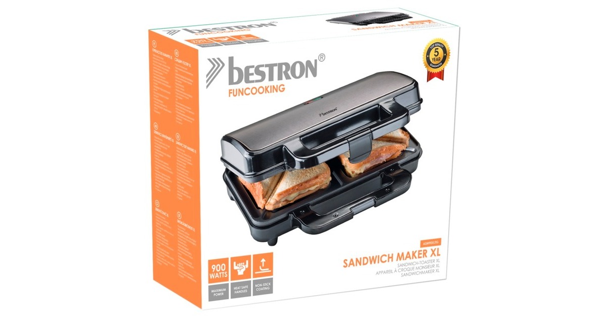 Der Sandwichmaker ASM90XLTG von Bestron macht das Zubereiten von leckeren Sandwiches zum Kinderspiel. Mit einer Leistung von 900 Watt und automatischer Temperaturregelung lassen sich einfach zwei große oder vier dreieckige Sandwiches pro Durchgang zubereiten. Die Bereitschaftsanzeige signalisiert das Erreichen der passenden Backtemperatur. Für einen sicheren Gebrauch sorgen das wärmeisolierte Gehäuse mit großem wärmeisoliertem Griff und die Antirutschfüße. Die antihaftbeschichteten Sandwichplatten erleichtern die Reinigung. Der Sandwich-Toaster ASM90XLTG kann platzsparend senkrecht aufbewahrt werden.Art.-Nr.: 1915113