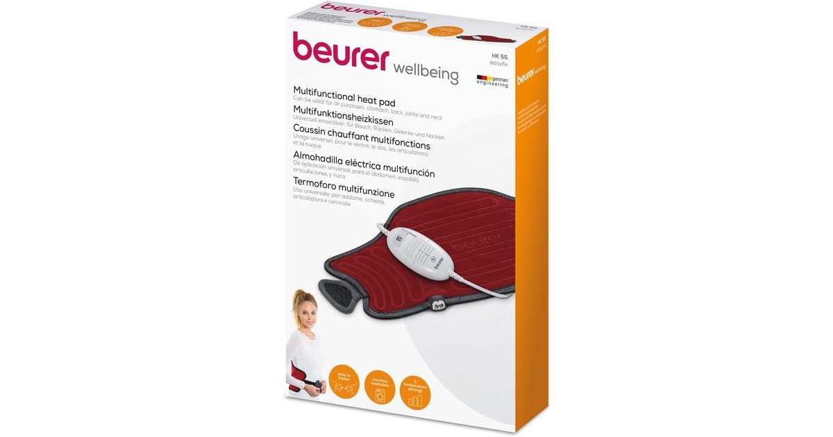 Das Beurer Heizkissen Easy Fix HK 55 ist flexibel einsetzbar durch seine körpergerechte Form. Es eignet sich so für Bauch, Rücken, Gelenke und zusammengerollt auch als Nackenheizkissen. Durch das elastische Verlängerungsband ist es für fast jeden Bauchumfang passend und ist leicht fixierbar. Das Material ist anschmiegsam und hautsympathisch. Das Easy Fix HK 55 verfügt über drei elektronsich einstellbare Temperaturstufen. Zur Sicherheit hat es eine automatische Abschaltung nach ca. 90 Minuten. Die Reinigungs des Easy Fix HK 55 kann bei 30 °C in der Maschine erfolgen, da die Zuleitung abnehmbar ist.Art.-Nr.: 1277185