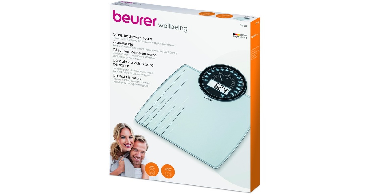 Die Personenwaage GS 58 von Beurer überzeugt im Cockpit-Design mit Glasoberfläche. Sie besitzt ein analoges und digitales Dual-Display. Die große LCD-Anzeige mit weißer Display-Beleuchtung und 26 mm Ziffernhöhe zeigt das Körpergewicht in kg bis maximal 180 kg an. Für vergleichbare Werte verfügt die Waage über einen akustischen Alarm 24 Stunden nach dem letzten Wiegen. Nach Gebrauch schaltet sich die Beurer GS 58 zudem automatisch aus.Art.-Nr.: 1349628