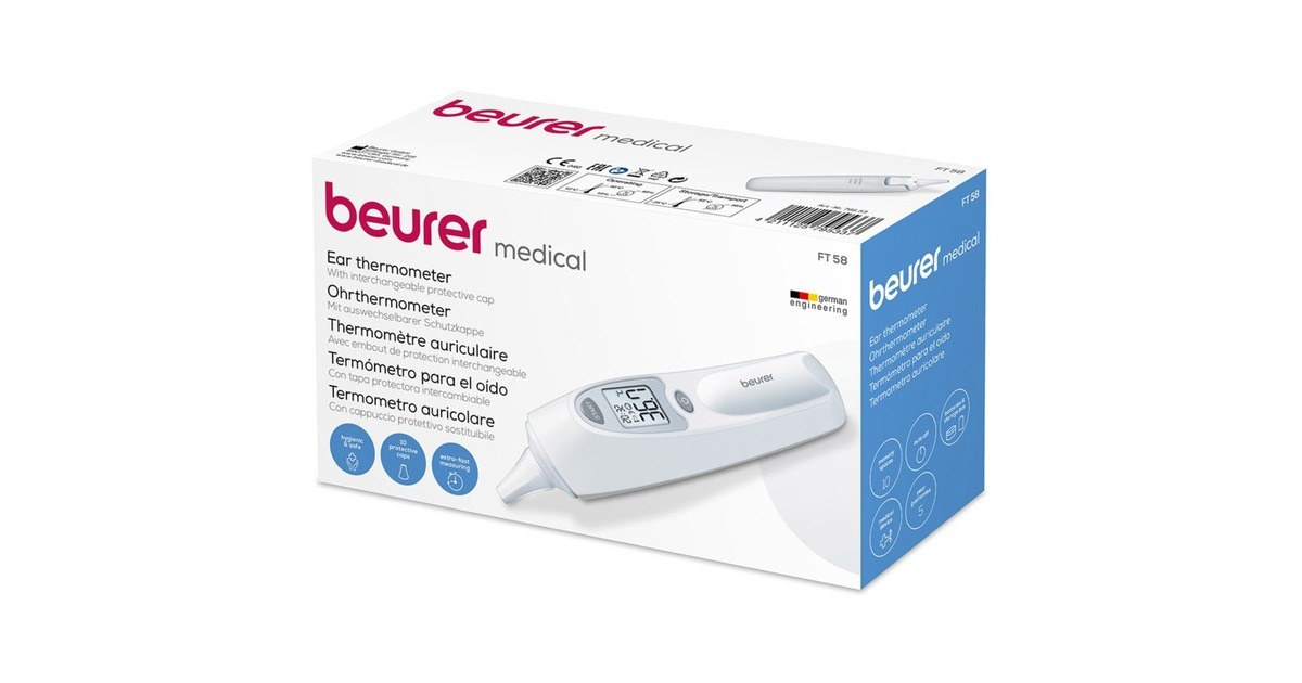 Mit dem Beurer FT 58 Ohrthermometer lässt sich die Körpertemperatur sekundenschnell messen. Das Thermometer misst mittels Infrarot die Temperatur des Trommelfells und des umliegenden Gewebes, ein Signalton informiert über die erfolgte Messung. Im gut ablesbaren Display werden sowohl die gemessene Innenohr Temperatur als auch die Raumtemperatur angezeigt. Ab einer gemessenen Temperatur vom 37,5 °C ertönt ein Warnton. Durch die auswechselbaren Schutzkappen ist die Anwendung besonders hygienisch. Neben der Messung der Körpertemperatur kann das Beurer FT 58 auch die Temperatur von Objekten messen.Art.-Nr.: 1350486