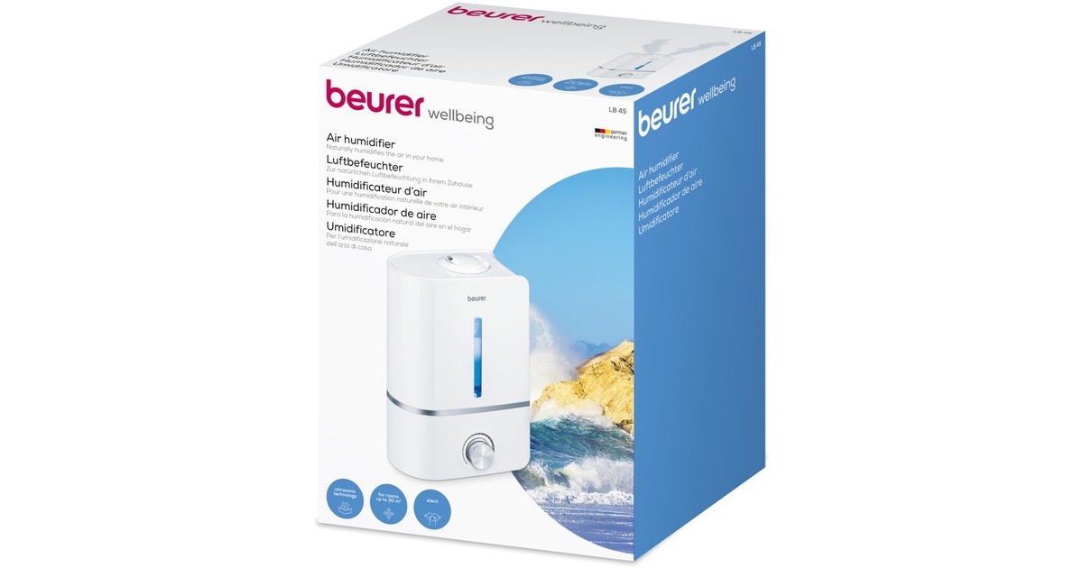 Der LB 45 sorgt für natürliche Luftbefeuchtung Zuhause. Die Luftfeuchtigkeit spielt für ein gutes Raumklima eine große Rolle. Besonders in den kalten Monaten ist die Luftfeuchtigkeit oft zu niedrig. Durch mikrofeine Zerstäubung mit Ultraschall werden bis zu 300 ml/h verdampft. Der LB 45 besitzt einen abnehmbaren, vier Liter Wassertank mit farbiger Wasserstandanzeige und zwei verstellbare 360° Nebeldüsen. Über einen Drehregler aus Chrom kann die Befeuchtungsintensität stufenlos eingestellt werden. Das Gerät eignet sich für Räume bis zu ca. 30 m² und kann auch zur Raumbeduftung mit Aromaölen genutzt werden. Da der LB 45 geräuscharm arbeitet, kann er auch im Schlafzimmer eingesetzt werden. In puncto Sicherheit überzeugt beim LB 45 eine Abschaltautomatik.Art.-Nr.: 1595021