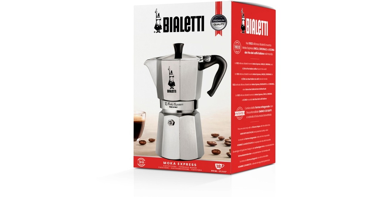 Mit der Moka Express von Bialetti gelingt die Zubereitung eines traditionellen italienischen Espresso oder Mokka innerhalb von Minuten. Diese Variante der Moka Express kocht bis zu 18 Tassen in einem Durchgang. Die Moka Express ist aus einer Aluminiumlegierung hergestellt, die sowohl auf Gasherd als auch auf Herdplatte verwendet werden kann. Der Kessel verfügt über Bialettis markante, achtseitige Form, die eine perfekte Wärmeverteilung ermöglicht, um das Aroma des Kaffees zu verstärken.Art.-Nr.: 1751646