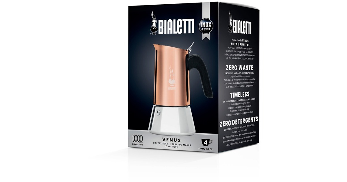 Kesselfußdurchmesser: 90 mm. Reinigungshinweise: Die Espressokanne Bialetti Venus sollte nach Gebrauch nur mit Wasser gespült werden. Kein Spülmittel verwenden. Das Produkt sollte nicht in der Spülmaschine gereinigt werden, da dies zu Schäden führen und den Geschmack des Kaffees verändern kann. |