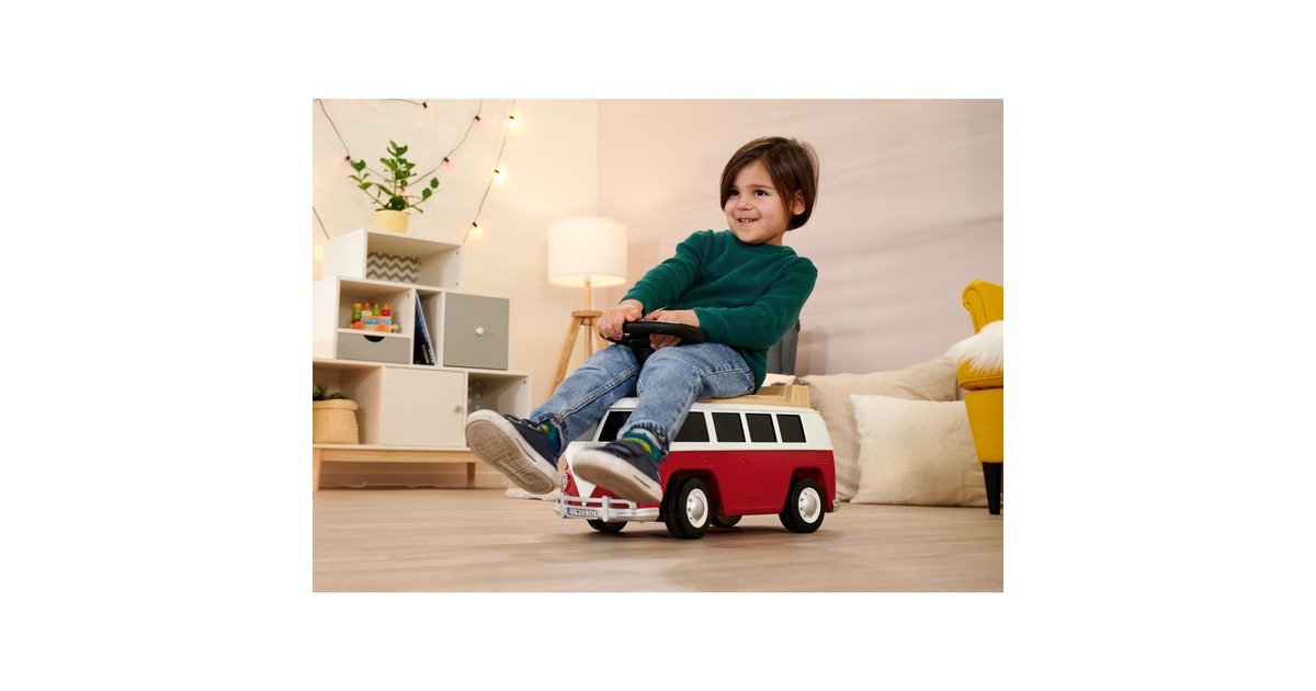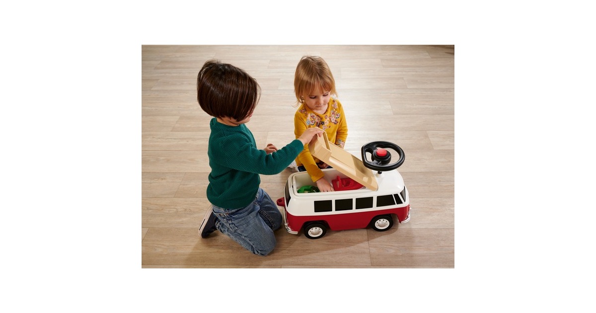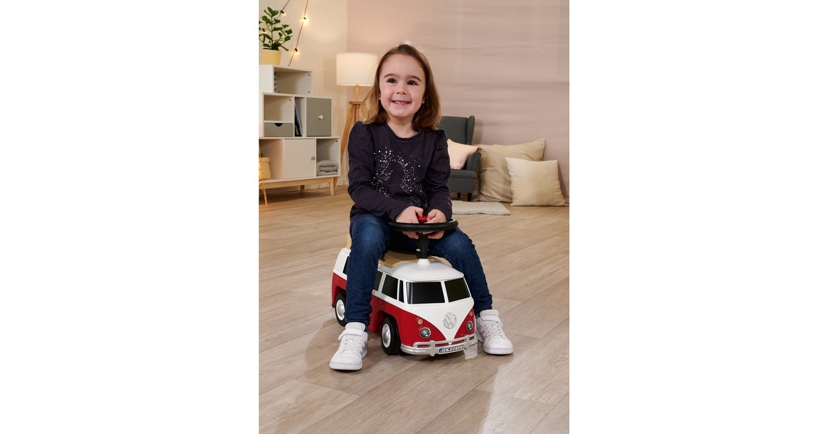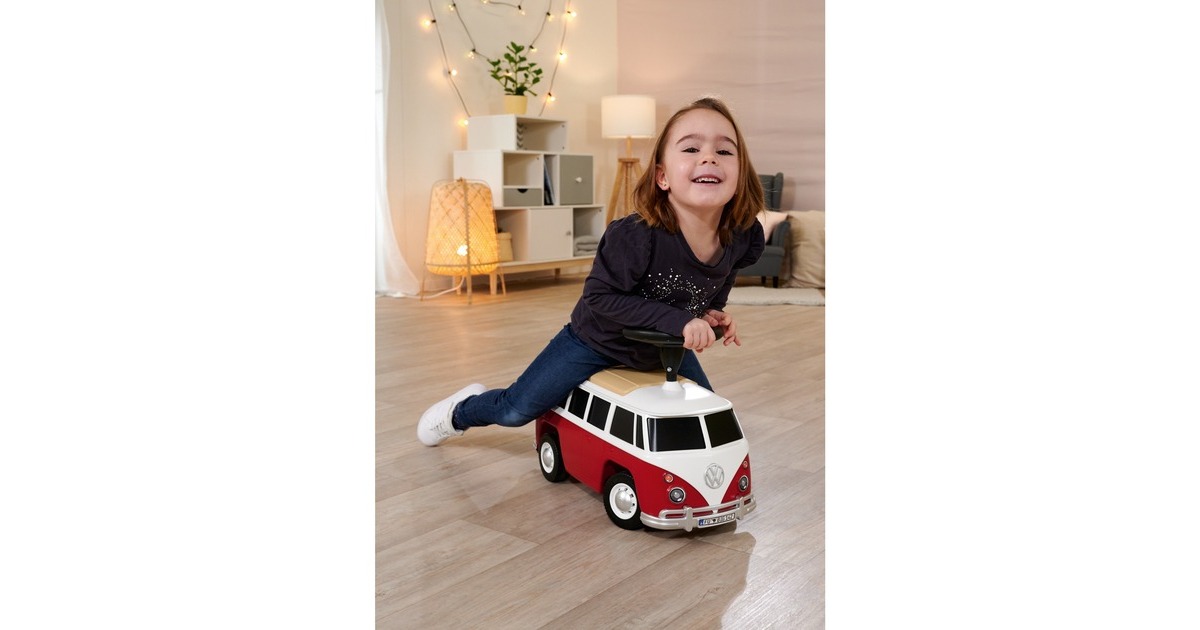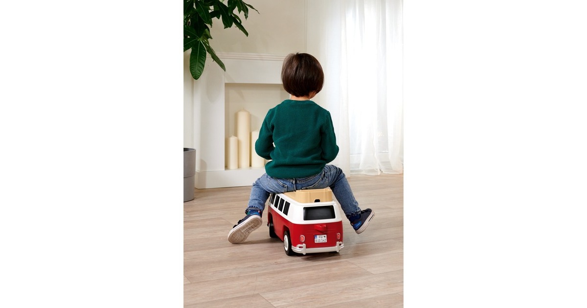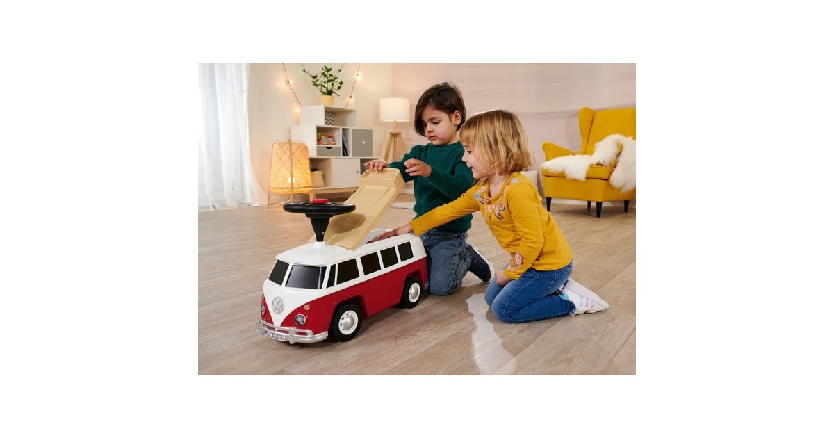 Mit dem Baby VW T1 steht ein echter Fahrzeugklassiker bereit. Dieses Rutschfahrzeug wurde seinem Vorbild, dem Volkswagen T1, detailgetreu nachempfunden und verfügt über zahlreiche raffinierte Funktionen. Unter der abnehmbaren Sitzfläche mit kleiner Rückenlehne verbirgt sich ein geräumiges Fach, in dem Einkäufe und persönliche Gegenstände sicher verstaut werden können. Originalgetreue Details wie das VW-Logo und die Radkappen in Chrom-Optik, sorgen für realistisches Aussehen. Bei den Rädern handelt es sich um hochwertige Flüsterreifen die nicht nur die Ohren von Mama und Papa, sondern auch deren Fußböden schonen. Flüsterleise gleiten sie durch Kinder- und Wohnzimmer und hinterlassen dabei keine Gummirückstände. Das doppelschaligen Lenkrad hat eine integrierte mechanische Hupe. Besonders praktisch ist die Anhängerkupplung auf der Rückseite des Bullis, die kompatibel mit BIG-Schubstangen und BIG-Anhängern ist.Art.-Nr.: 1825897