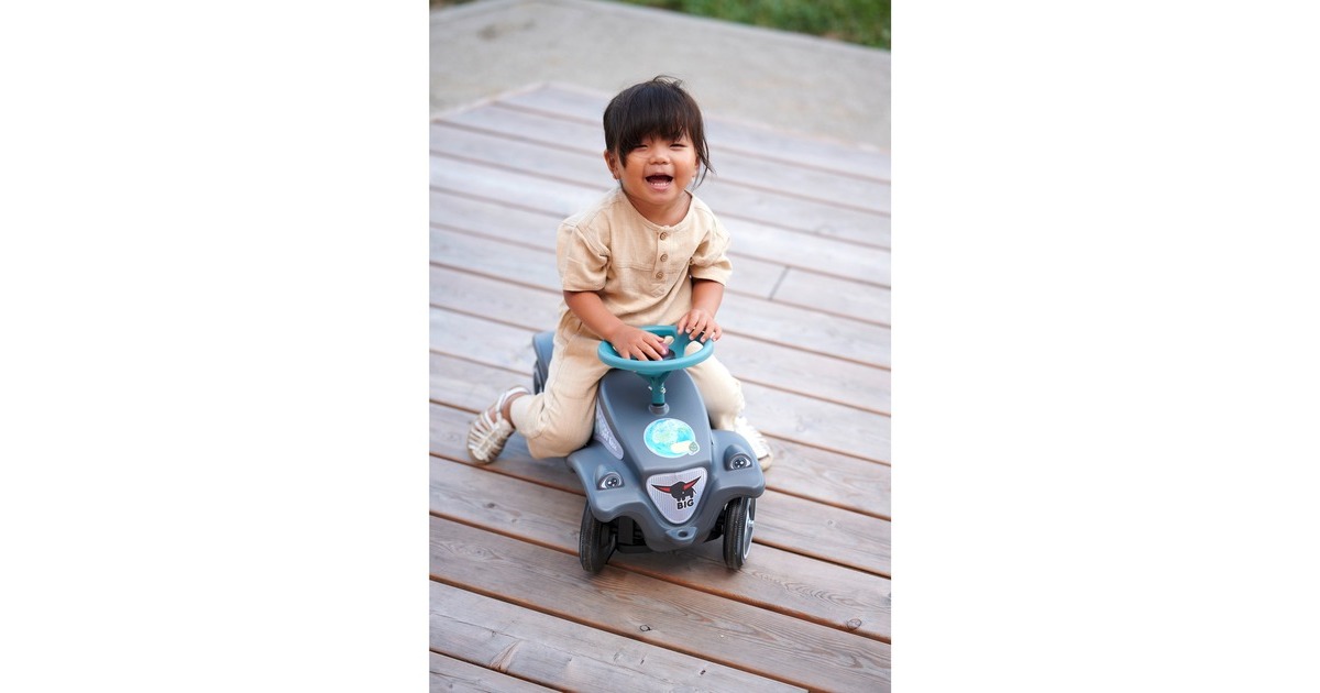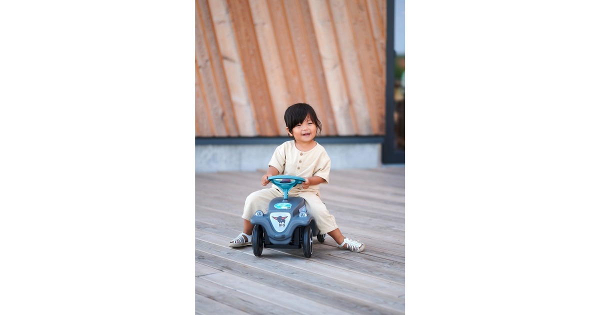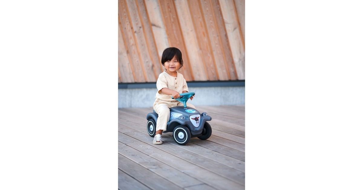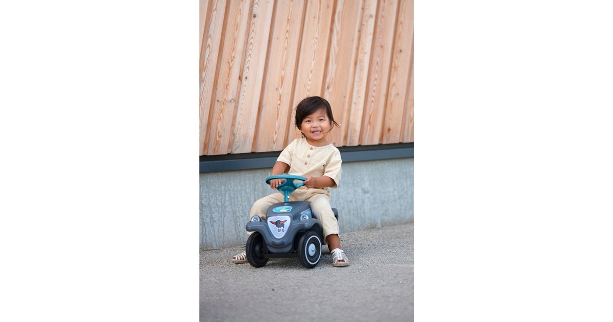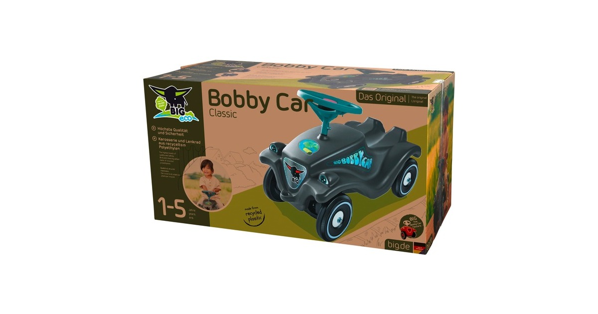 Das Bobby Car Classic Eco von BIG ist legendär in seiner Form und unschlagbar in Sachen Qualität - und dies mehr denn je, denn der Körper und das Lenkrad des Bobby Car Classic Eco wird aus recyceltem Kunststoff gefertigt. Die Räder bestehen ebenfalls aus Rezyklat. Das silbrige Grau der Karosserie ist dem verwendeten Recyclingmaterial geschuldet und wirkt modern und frisch in Kombination mit dem gräulich-türkisen Lenkrad und den Stickern in Weltkugel-Optik. Das Rutschfahrzeug kommt natürlich auch in einer Verpackung aus Recycling-Karton. Doch nicht nur im Hinblick auf Umweltschutz und Design überzeugt das Rutschfahrzeug. Die seit Jahrzehnten bewährte, unveränderte Karosserie des beliebten Kinderautos ist ergonomisch perfekt auf die Bedürfnisse der kleinen Fahrer und Fahrerinnen abgestimmt und fördert die motorische Entwicklung. Ein Sicherheitslenkrad mit mechanischer Hupe, vier robuste und abriebfeste Räder, je eine Anhängerkupplung vorne und hinten sowie eine Kniemulde zum Fahren für größere Kinder ergänzen die Ausstattung. Für einen kleinen Wendekreis sorgt die stufenlose Achsschenkellenkung. Die hervorragende Verarbeitungsqualität und der tiefliegende Schwerpunkt machen dieses Fahrzeug zu einem besonders sicheren Spielzeug.Art.-Nr.: 1914896