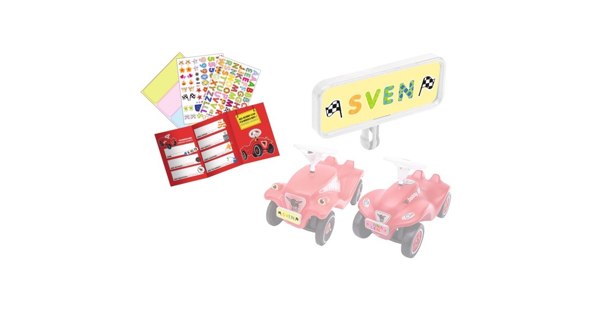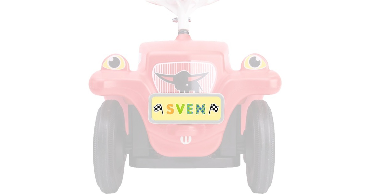 Was bei den großen Automobilen Pflicht ist, darf natürlich auch bei den kleinen Lieblingsfahrzeugen nicht fehlen: mit dem BIG-Bobby-Car Mein Nummernschild können stolze Besitzer ab 12 Monaten gemeinsam mit ihren Eltern ihr ganz individuelles Nummernschild entwerfen. Im Set ist ein Kunststoffschild mit transparentem Schutzcover enthalten, das sich leicht an der vorderen oder hinteren Anhängerkupplung aller BIG-Bobby-Car Modelle aus der New- und Classic-Reihe befestigen lässt. Es kann von oben oder unten eingesteckt werden. Zudem liegen drei Aufkleberbögen mit kunterbunt gemusterten Buchstaben und Zahlen, lustigen Symbolen und unterschiedlich farbigen Hintergründen bei. So ausgestattet kann frei nach Fantasie das persönliche Kennzeichen mit eigenem Design entstehen. Als besonderes Extra enthält das Set zudem einen BIG-Bobby-Car Führerschein.Art.-Nr.: 1237100