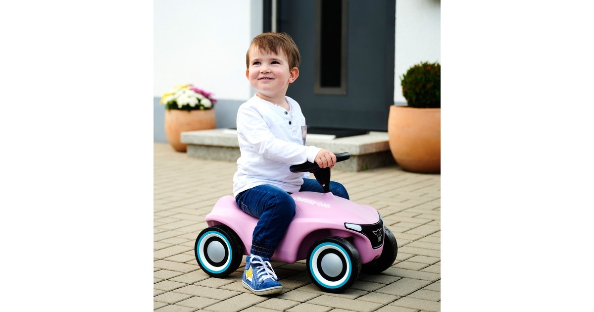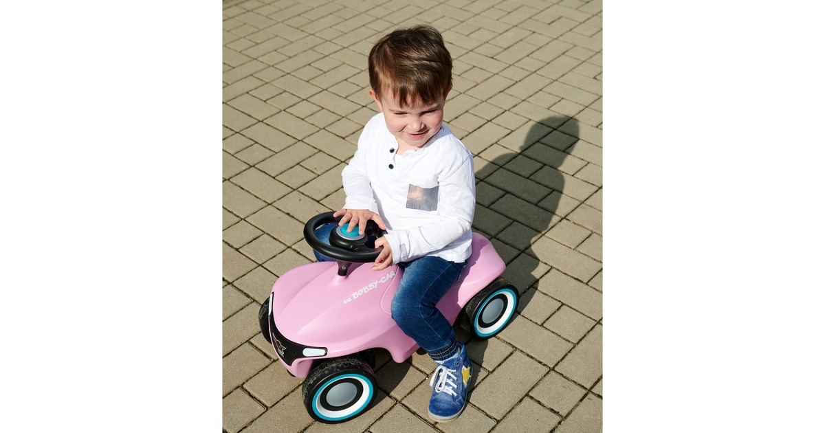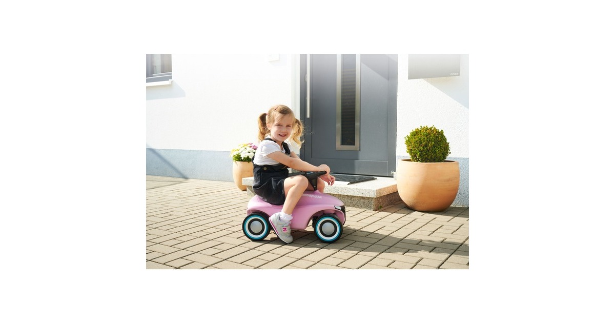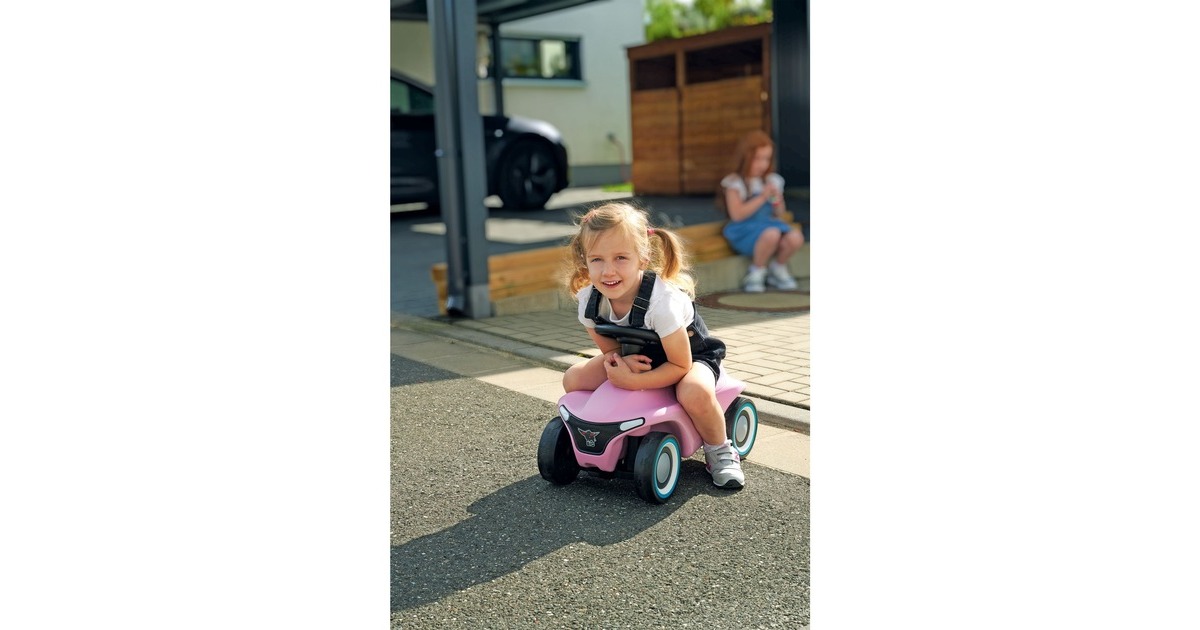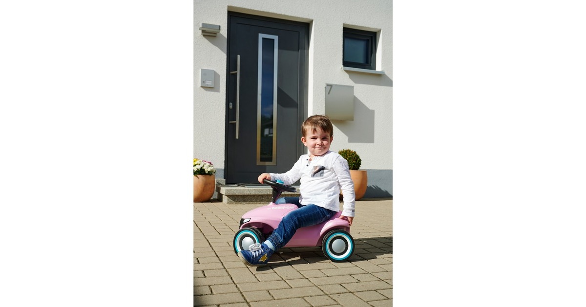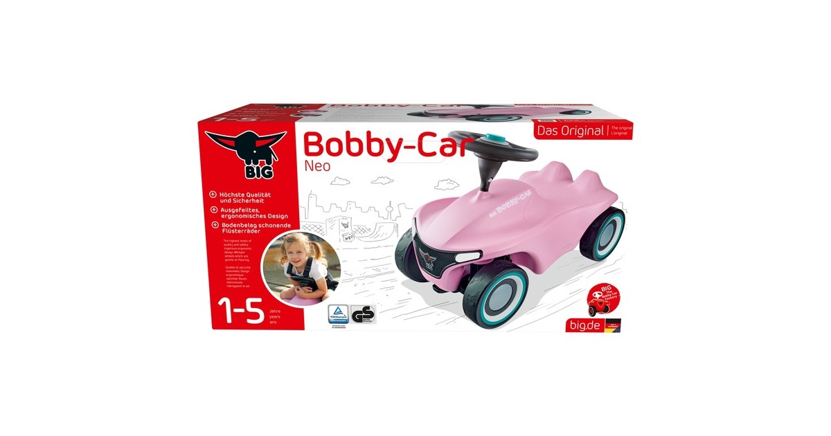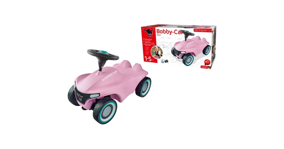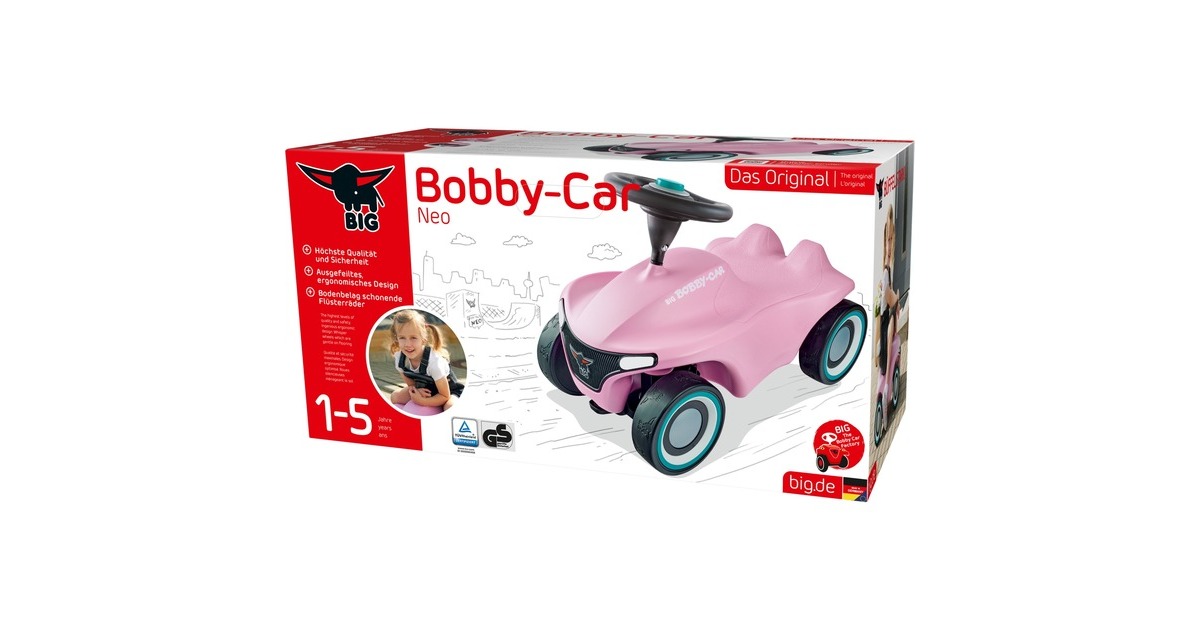 Mit dem Bobby-Car Neo präsentiert BIG das Facelift eines Klassikers. Das neue Design stellt das BIG-Logo zentral heraus, denn der bedruckte Kühlergrill wurde komplett neu gestaltet und auch die Flüsterreifen haben nun ein Büffel-Profil. Hinzu kommt die tolle Farbvariante in zartrosa mit türkisen Akzenten an Rädern und der Hupe. Das modernisierte Design bietet weiterhin eine ergonomische Sitzfläche mit Anti-Rutsch-Beschichtung und eine Sicherheits-Kniemulde. Das leichtgängige Vollschalen-Sicherheitslenkrad sorgt für einen optimalen Griff und eine angenehme Haptik. Das Bobby-Car Neo wird serienmäßig mit extra breiten, hochwertigen und abriebfesten Weichkunststoff-Reifen geliefert, die für guten Grip sorgen und flüsterleise rollen. Außerdem verfügt diese Version über 3-teilige geschlossene Felgen, die besonders leicht zu reinigen sind. Eine abnehmbare Abschleppvorrichtung vorne unter dem Kühlergrill und eine Anhängerkupplung am Heck ermöglichen das Ankoppeln von Bobby-Car-Zubehör sowie die Nutzung aller gängigen Bobby-Car-Anhänger.Art.-Nr.: 1788641