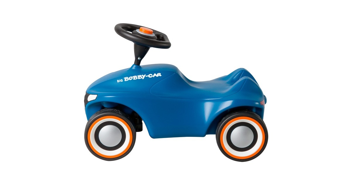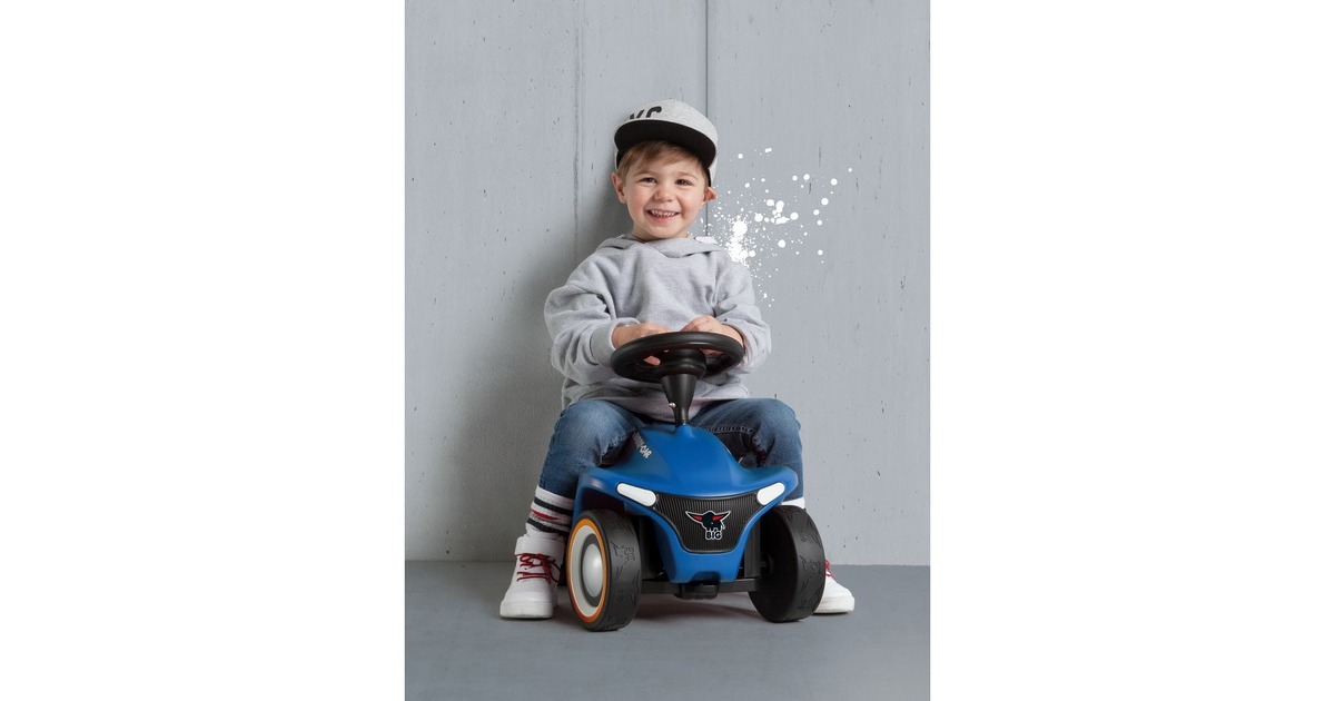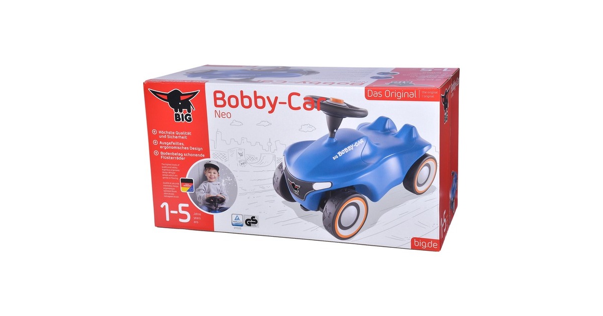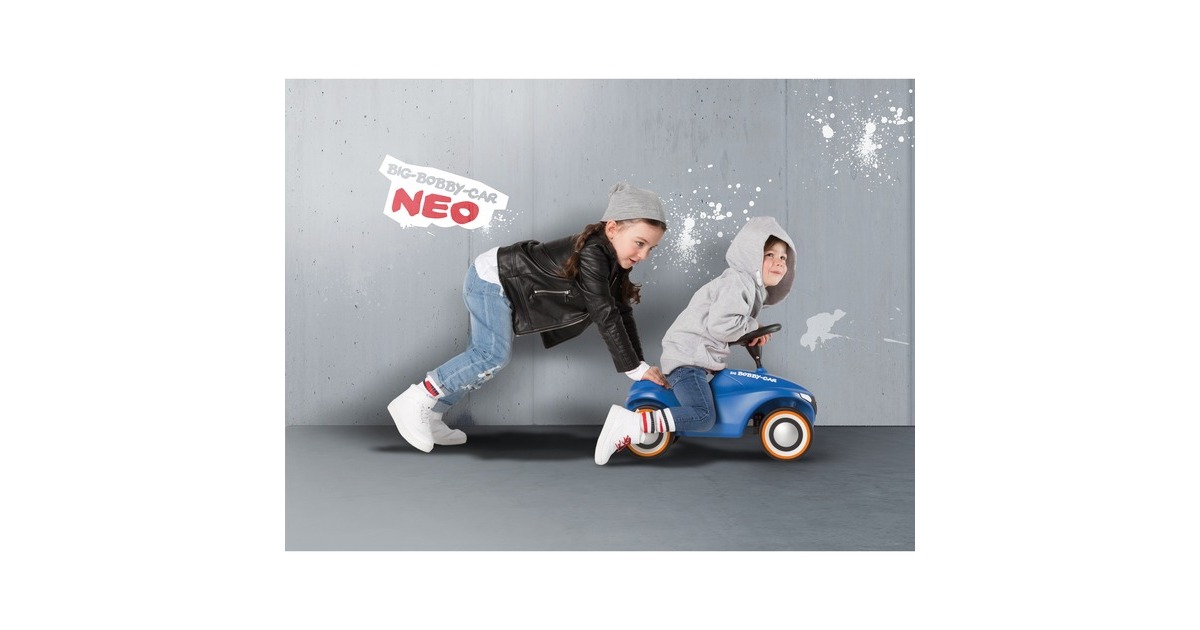 Facelift einer Legende - mit dem BIG-Bobby-Car Neo präsentiert BIG eine neue Generation seines Rutschfahrzeug-Klassikers, der schon viele Jahrgänge von Kindern begleitet und begeistert hat. Das revolutionäre, moderne Design stellt das Wappentier, den BIG-Büffel, ganz besonders heraus. So ist z.B. der hochwertig bedruckte Kühlergrill in Form des Büffels gehalten und die breiten Flüsterreifen verfügen über ein einzigartiges Büffel-Profil. Die blaue Variante mit orangen Details wirkt durch die Kombination der Farbtöne besonders frisch und modern. Das Chassis ist in neuer stylischer Form überarbeitet, die ergonomisch geformte Sitzfläche verfügt über eine Anti-Rutsch-Oberfläche. Das Kult-Auto verfügt nach wie vor über eine Sicherheits-Kniemulde und die Beinauflage. Die Rücklichter sind vormontierte Kunststoffteile in Form stilisierter Büffelhörner. Das leichtgängige Vollschalen-Sicherheitslenkrad sorgt für einen optimalen Griff und eine angenehme Haptik. Das BIG-Bobby-Car Neo wird serienmäßig mit extra breiten, hochwertigen und abriebfesten Weichkunststoff-Reifen geliefert, die für guten Grip sorgen und flüsterleise rollen. Des Weiteren verfügt die neue Version des kultigen Rutschautos über 3-teilige geschlossene Felgen, die besonders leicht zu reinigen sind. Das BIG-Bobby-Car Neo ist revolutionär in seiner Form und unschlagbar in Sachen Qualität. Hergestellt wird es aus umweltfreundlichem und strapazierfähigem Kunststoff im modernen BIG-Werk in Deutschland. Art.-Nr.: 1529364