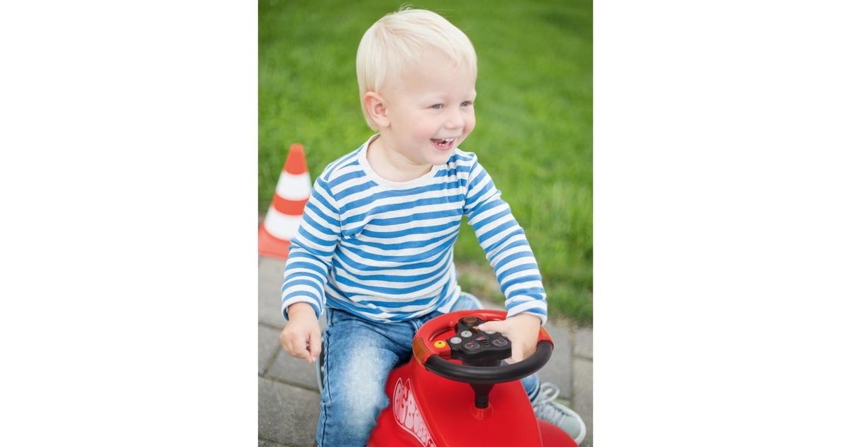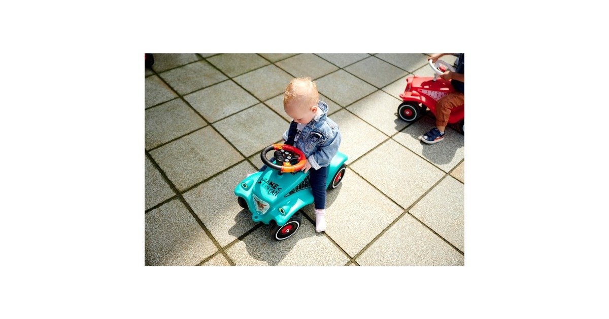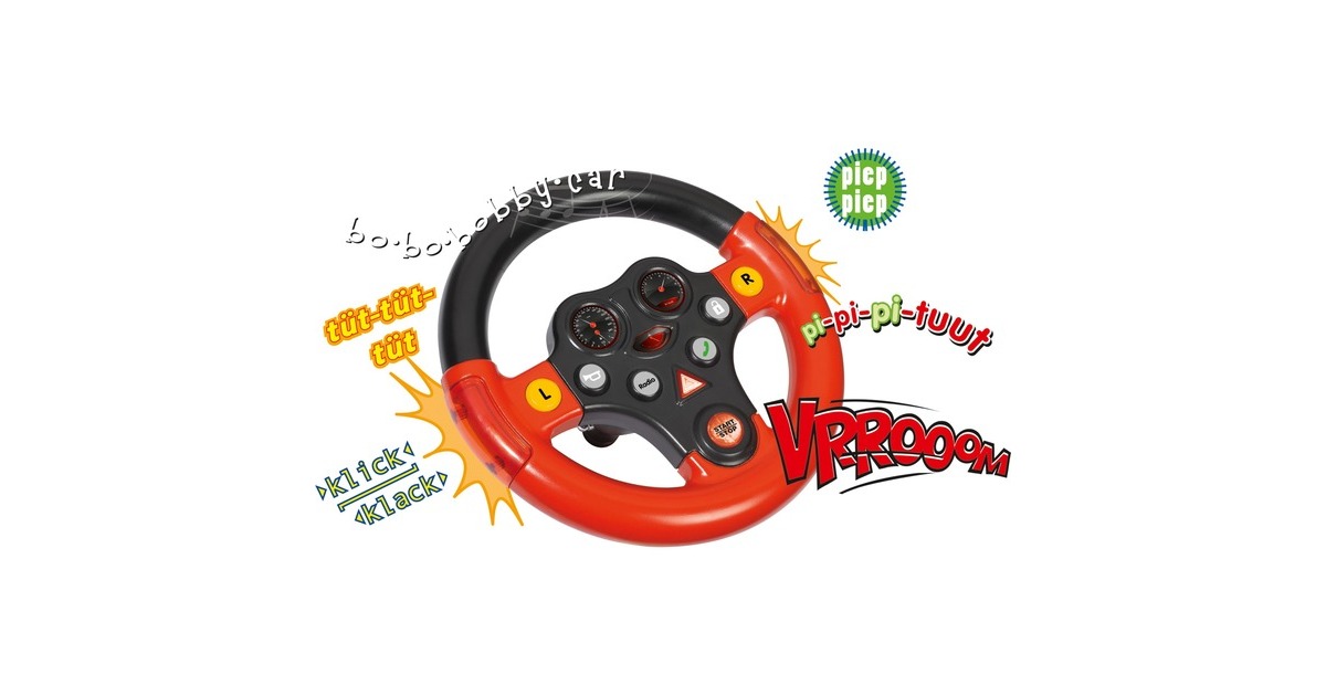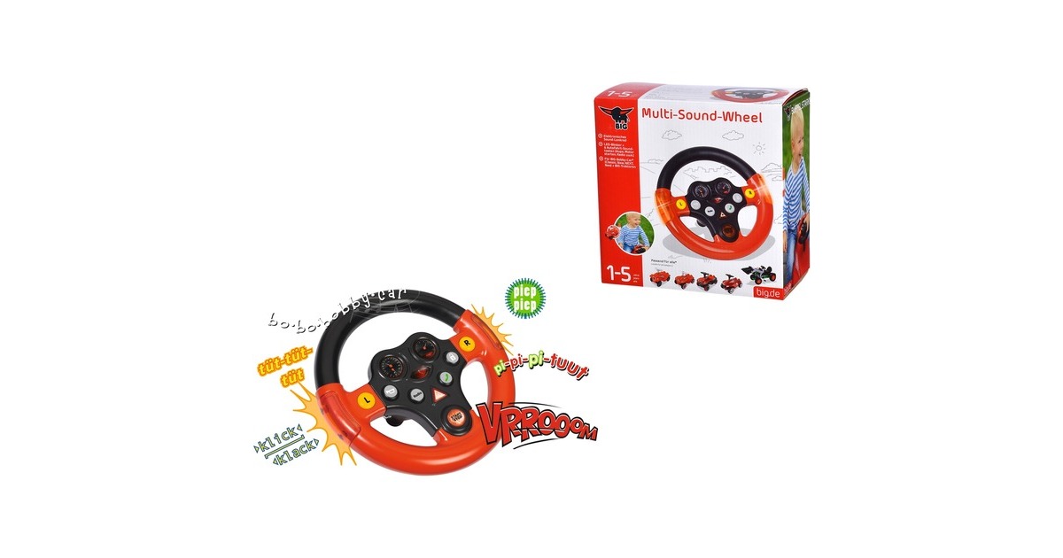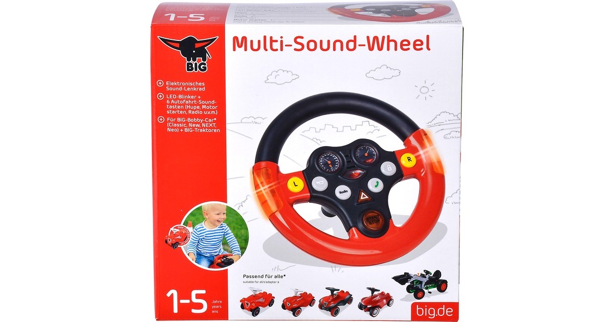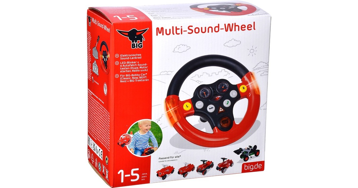 Wirklich einzigartig machen das BIG-Multi-Sound-Wheel die vielen kindgerechten Tasten mit Originalsounds der großen Fahrzeuge. Gestartet wird durch Drücken der On/Off-Taste. Sobald diese betätigt wird ertönt ein Anlassergeräusch. Nun wird entweder der Blinker auf der linken oder rechten Seite durch Knopfdruck betätigt und das bekannte Blinkgeräusch ertönt. Kurz über die linke oder rechte Schulter geguckt und wenn kein Auto kommt geht die Fahrt los. Für ein entspanntes Reisen sorgt die richtige Musik, die bei Druck der Radio-Taste ertönt. Das fröhliche BIG-Bobby-Car-Lied lädt zum Mitsingen ein.Art.-Nr.: 1195329