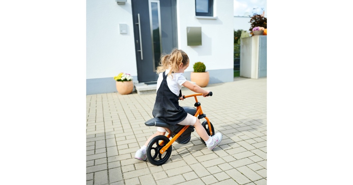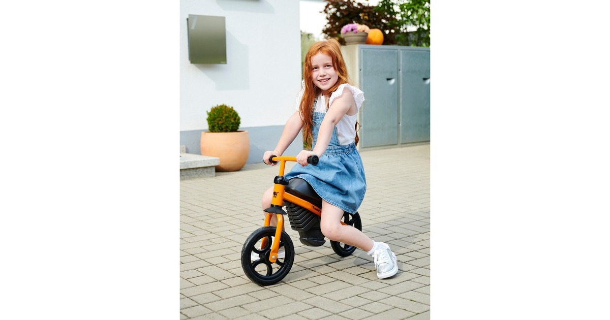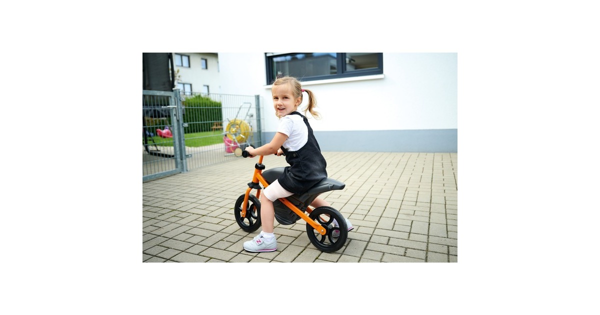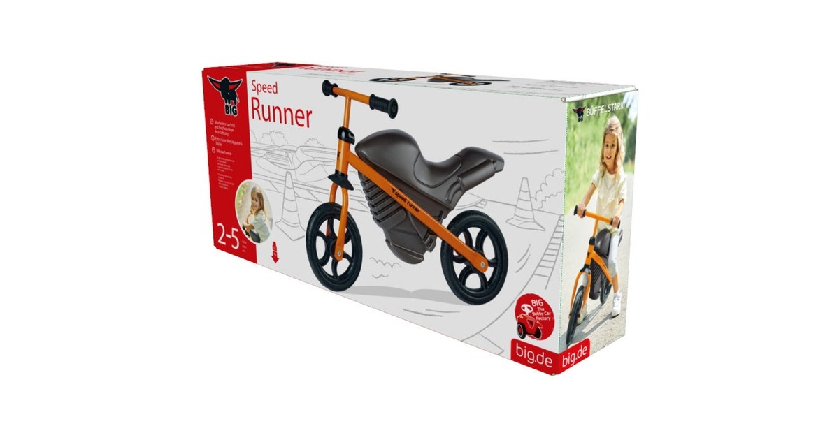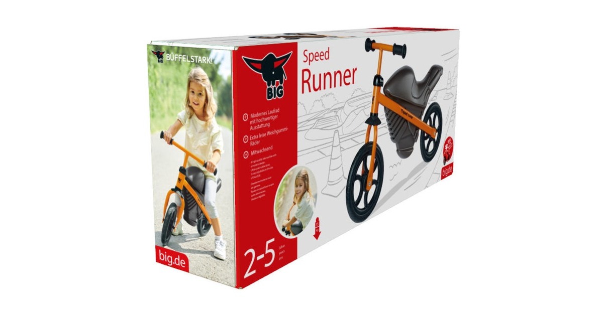 Der Speed-Runner von BIG ist ein modernes Laufrad mit hohem Fahrkomfort durch die Verbindung aus hochwertigem Kunststoff mit robustem Metallrahmen. Der Blasformkörper mit Sitz an der Oberseite wird aus strapazierfähigem und umweltfreundlichem Kunststoffmaterial hergestellt und ist je nach Bedarf genau wie der Lenker 3-fach höhenverstellbar. Der Lenker bietet kleinen Rennfahrern kindgerechte Griffe mit Handschutz. Diese verhindern Abrutschen und sorgen für den notwendigen Schutz der Hände, wenn das Kind mal aneckt. Der Speed-Runner kommt serienmäßig mit hochwertigen Weichgummi-Rädern die für ein leises und angenehmes Fahrgefühl sorgen. Das sportliche Laufrad trainiert den Gleichgewichtssinn, schult Koordinationsvermögen und unterstützt den kindlichen Bewegungsdrang - ideal als Vorbereitung für den Umstieg auf ein "richtiges" Fahrrad.Art.-Nr.: 1788638| Abmessung | Breite: 370 mm x Höhe: 210 mm x Tiefe/Länge: 790 mm |
