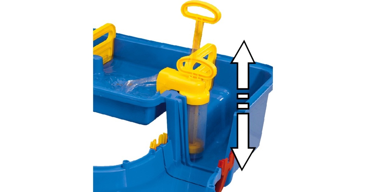Staubecken mit Pumpe, 2 Schleusen, abschüssige Wasserbahn und Handkurbel zum herausheben |