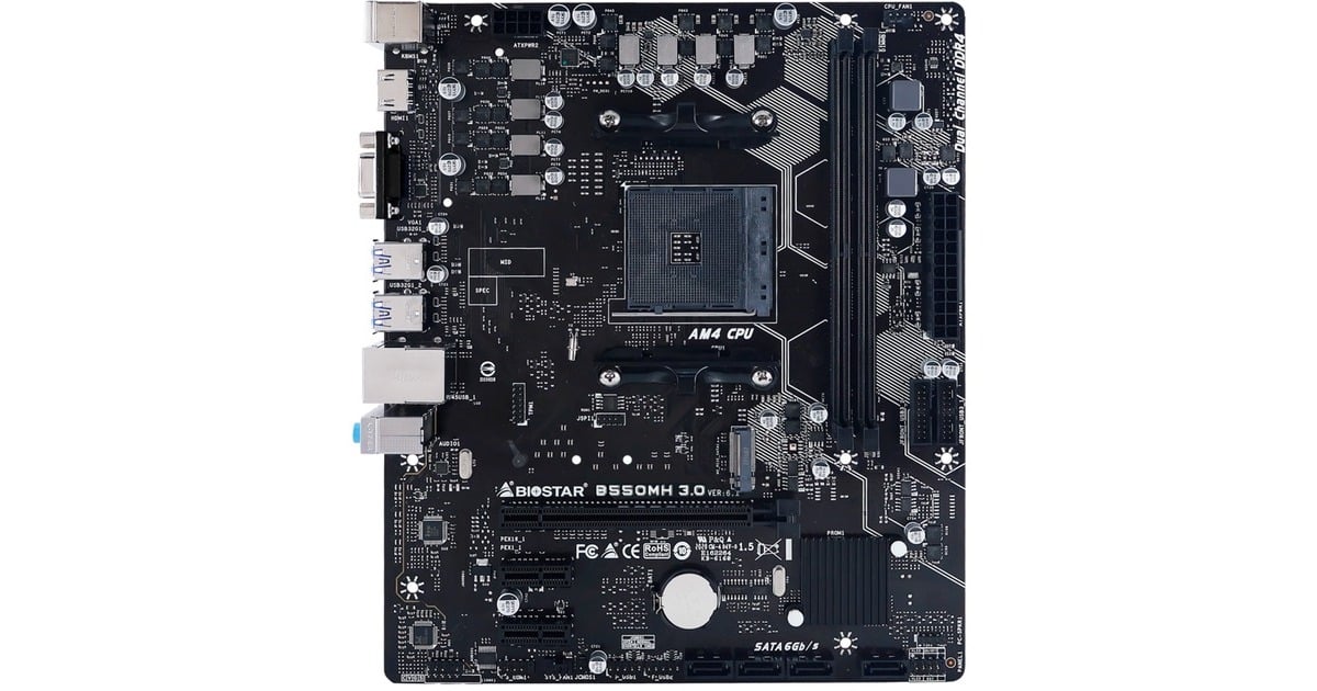 Das Biostar B550MH 3.0 basiert auf dem AMD-B550-Chipsatz und unterstützt AMD-Prozessoren für den Sockel AM4. Es verfügt über zwei DDR4-Slots für bis zu 64 GB Arbeitsspeicher. Zur weiteren Ausstattung des Biostar B550MH 3.0 gehören ein PCIe-4.0-x16-Slot, ein PCIe-4.0-x16-Slot und zwei PCIe-3.0-x1-Slots. Außerdem verfügt das Biostar B550MH 3.0 über 8-Kanal-Sound, eine Gigabit-LAN-Schnittstelle, vier SATA3-Anschlüsse, eine M.2-Anschlüsse, und eine Reihe an USB Schnittstellen.Art.-Nr.: 1911282