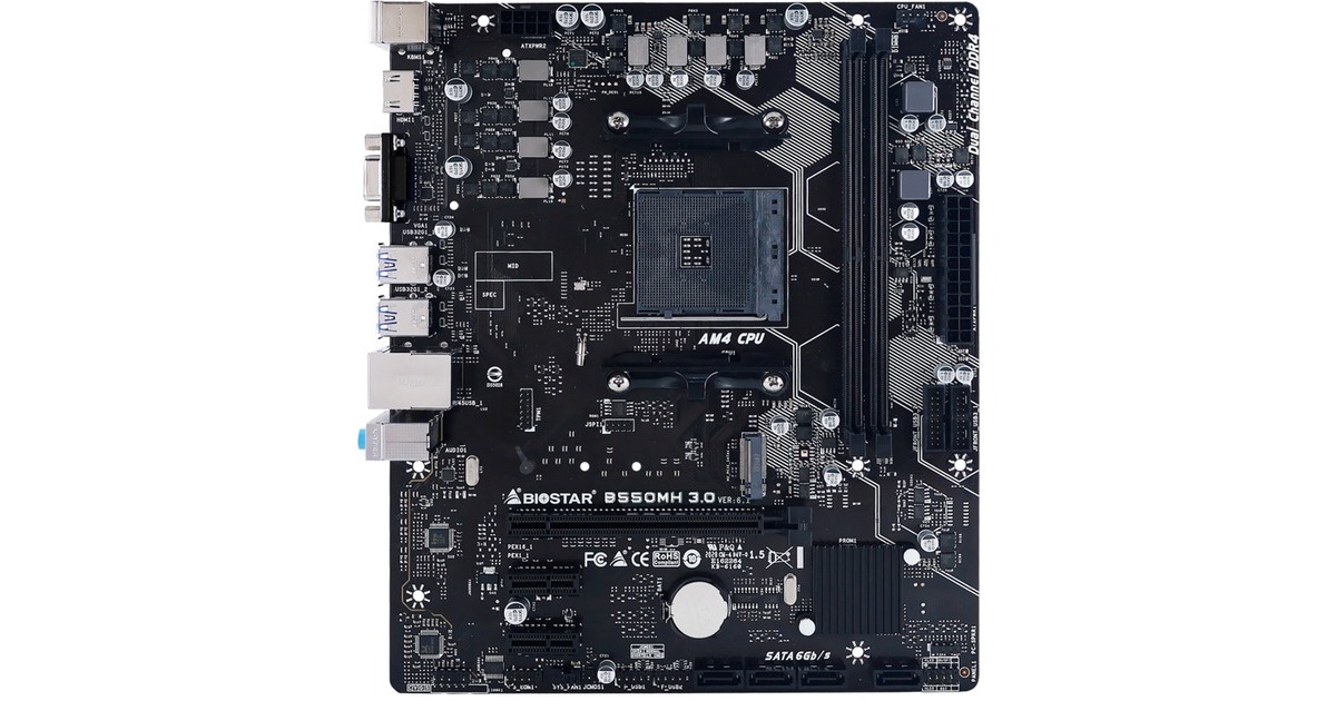 Das Biostar B550MH 3.0 basiert auf dem AMD-B550-Chipsatz und unterstützt AMD-Prozessoren für den Sockel AM4. Es verfügt über zwei DDR4-Slots für bis zu 64 GB Arbeitsspeicher. Zur weiteren Ausstattung des Biostar B550MH 3.0 gehören ein PCIe-4.0-x16-Slot, ein PCIe-4.0-x16-Slot und zwei PCIe-3.0-x1-Slots. Außerdem verfügt das Biostar B550MH 3.0 über 8-Kanal-Sound, eine Gigabit-LAN-Schnittstelle, vier SATA3-Anschlüsse, eine M.2-Anschlüsse, und eine Reihe an USB Schnittstellen.Art.-Nr.: 100045902