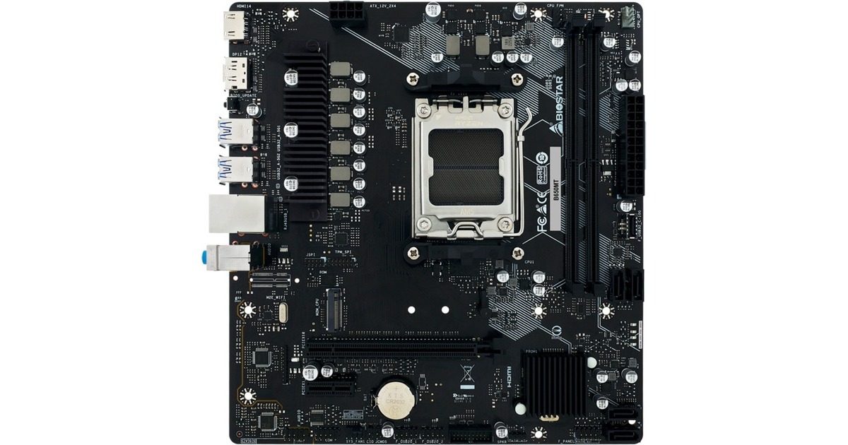 Das Mainboard Biostar B650MT basiert auf dem AMD-B650-Chipsatz und unterstützt AMD-Prozessoren für den Sockel AM5. Es verfügt über zwei DDR5-DIMM-Slots im Dual-Channel-Betrieb für bis zu 96 GB Arbeitsspeicher. Zur weiteren Ausstattung des B650MT gehören ein PCIe-4.0-x16-Slot und ein PCIe-3.0-x1-Slot. Außerdem verfügt das B650MT über 8-Kanal-Sound, eine Gigabit-LAN-Schnittstelle, vier SATA3-Anschlüsse, einen M.2-Anschluss mit Unterstützung für M.2 PCIe 4.0 x 4 sowie eine Reihe an USB-Schnittstellen.Art.-Nr.: 100022589