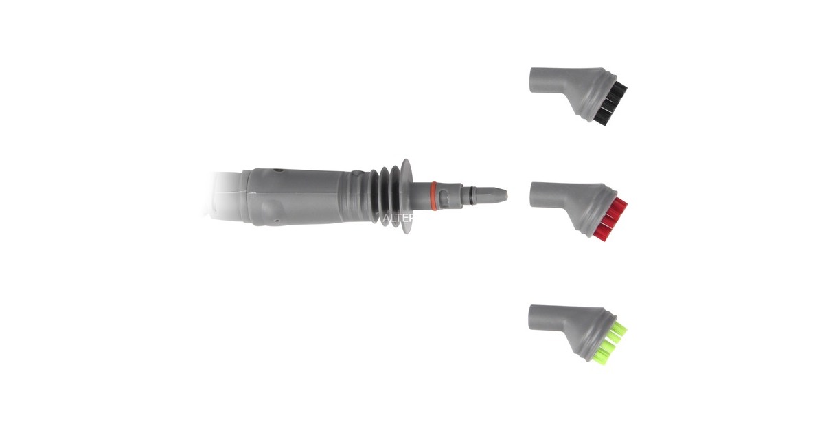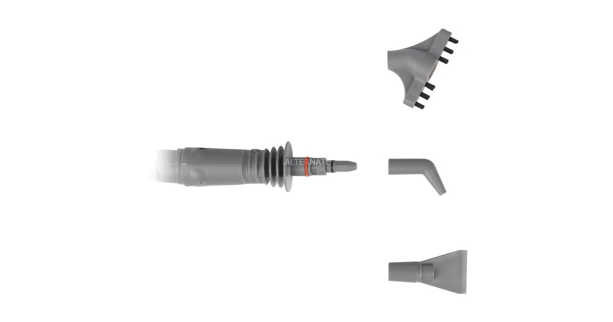 Einfüllbecher, Verlängerungsschlauch, Detailbürste mit 3 farbkodierten Bürsten, Winkelaufsatz, Fensterabzieher, flaches Pad, Flachkratzaufsatz, 2 Mikrofaser-Reinigungstücher, Zubehördüse |