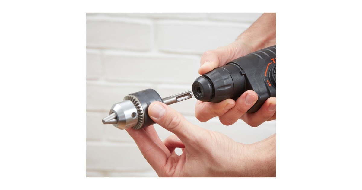 3 Funktionsmodi: Schlagbohren, Bohren in Holz / Metall (ohne Schlag) und leichte Meißelarbeiten in Putz und Fliesen (mit Drehstop), Feststellschalter |