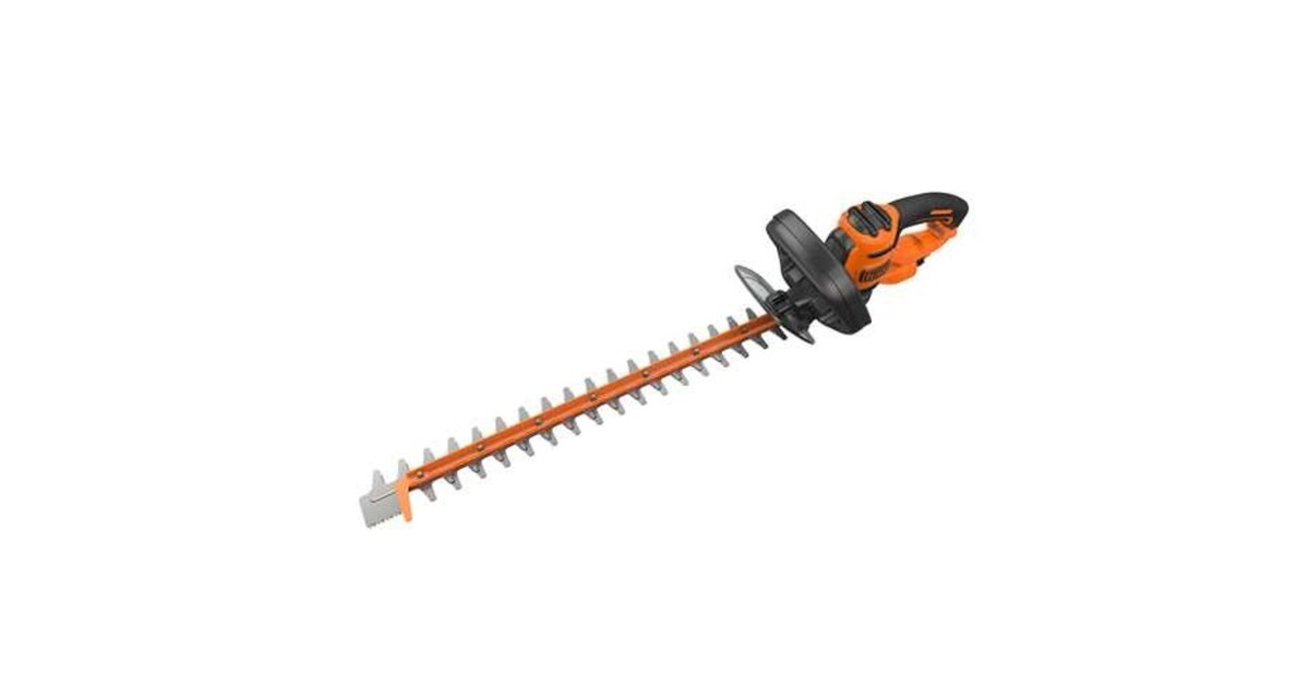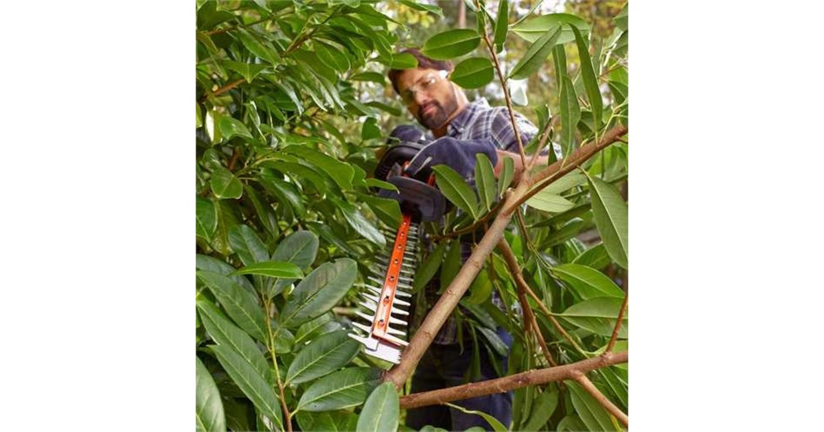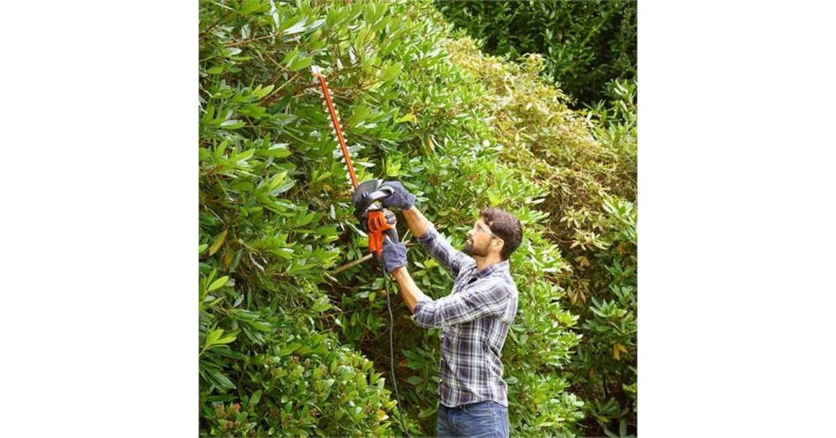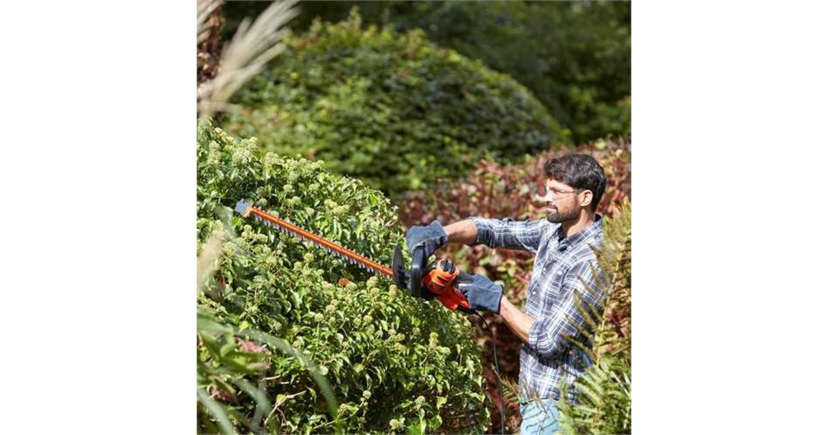 Die leistungsstarke Elektro-Heckenschere BEHTS451 von BLACK+DECKER ermöglicht kraftvolles Schneiden und mit einer Schnittstärke von 25mm eine hohe Schnittleistung. Sie eignet sich besonders gut für große Hecken. Die Sägeblattspitze ermöglicht dabei auch das Schneiden dickerer Zweige bis zu 35mm Durchmesser ohne Zuhilfenahme zusätzlicher Werkzeuge. Das geringe Gewicht und das ergonomisches Design mit Bügelhandgriff erlauben eine gute Steuerung bei unterschiedlichen Anwendungswinkeln. Die langlebigen, robusten und gegenläufigen Messer sind aus gehärtetem Stahl gefertigt und ermöglichen einen vibrationsarmen Lauf. Der transparenter Handschutz verbessert die Sicht bei vertikalen Heckenarbeiten. Der Direktanschluss des Verlängerungskabels und die Kabelzugentlastung sorgen während des Betriebs für sichere Kabelführung ohne versehentliches Steckerziehen.Art.-Nr.: 1439231