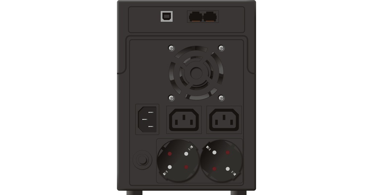 LCD-Panel mit Anzeige für USV in Betrieb, USV im Batteriebetrieb, Überlast, Alarm |