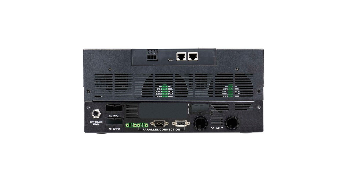 Der PowerWalker Off-Grid Solar-Wechselrichter 5000 ZRO OFG mit Doppelwandlertechnologie und Null-Übertragungszeiten kann mit einem Generator oder mit einer PV (Photovoltaik) Anlage als Stromquelle verwendet werden und ermöglicht ein schnelles Aufladen der vier externen Batterien (nicht enthalten). Er koordiniert die eingehende Leistung des Stromnetzes, die Energieerzeugung der Solaranlage und die gespeicherte Energie im Batteriesystem. Der Solar-Wechselrichter kann dann alle Arten von Geräten zu Hause oder im Büro mit Strom versorgen, einschließlich motorbetriebener Geräte wie Röhrenlampen, Ventilatoren, Kühlschränke und Klimaanlagen. Er generiert einen reinen Sinuswellenausgang für eine breite Palette von Anwendungen. Das übersichtliche LCD-Display ermöglicht eine benutzerkonfigurierbare und leicht zugängliche Bedienung, wie z.B. den Batterieladestrom und die Priorität des AC-/PV-Ladegeräts. Der Solar-Wechselrichter 5000 ZRO OFG kann mit der Smartphone-App WatchPower von PowerWalker verwaltet werden. Art.-Nr.: 1858351