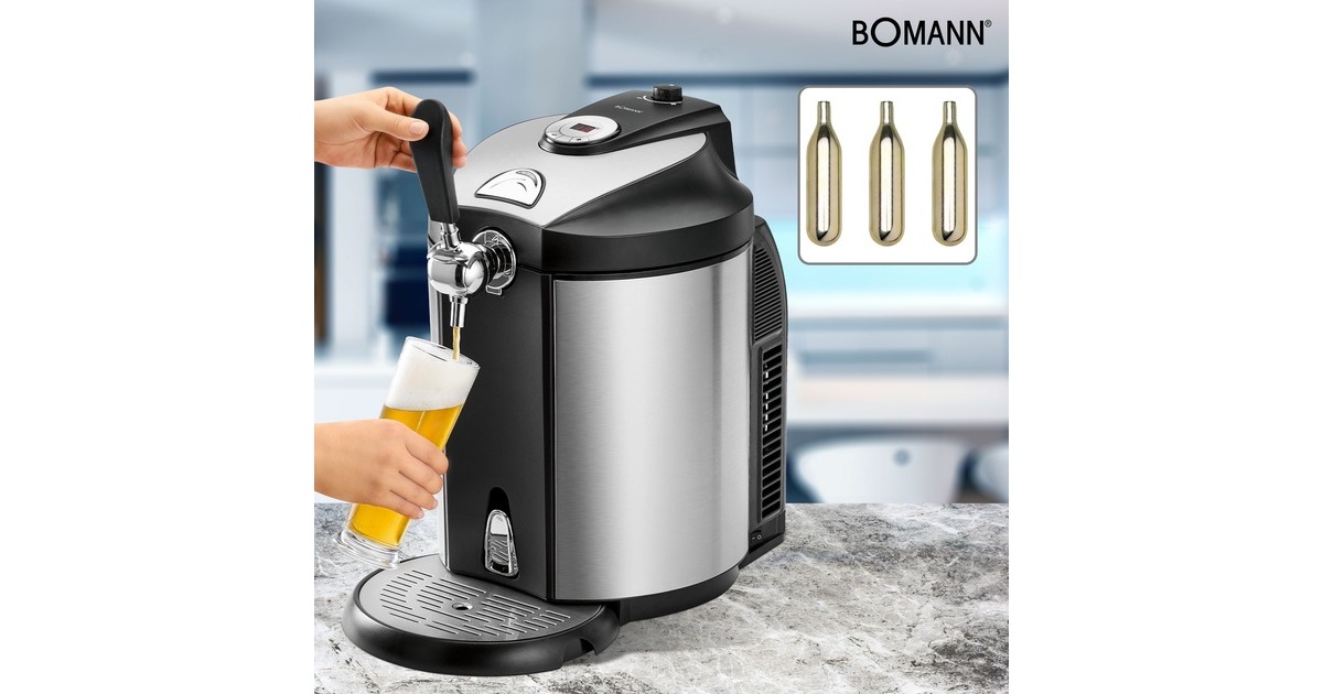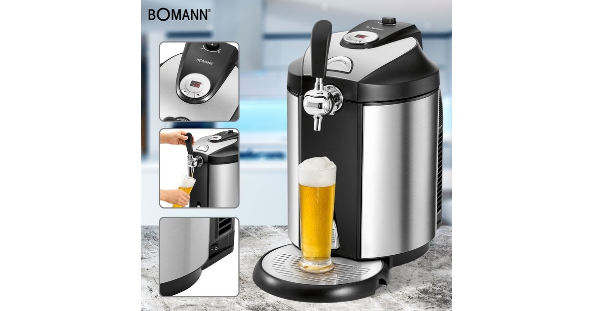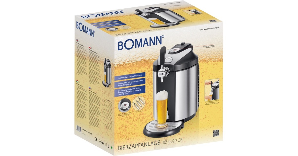 Die Bomann BZ 6029 CB ist eine Edelstahl-Bierzapfanlage mit CO₂-Druckkartuschen-System und für alle handelsüblichen 5 Liter-Partyfässer geeignet. Sie stellt eine leistungsstarke und angenehme Alternative zum lästigen Tragen von Getränkekisten dar. Der Druck kann für das richtige Schaumniveau stufenlos eingestellt werden, für Biergenuss wie vom Wirt gezapft. Die BZ 6029 CB ist mit einem LED-Display zur komfortablen Temperaturregelung und Kühlung von 2°C - 12°C ausgestattet. Die Fässer lassen sich leicht installieren und so ist die Zapfanlage schon nach wenigen Minuten einsatzbereit. Das Edelstahl-Abtropfgitter und die Tropfschale sind zur leichten Reinigung herausnehmbar und spülmaschinengeeignet.