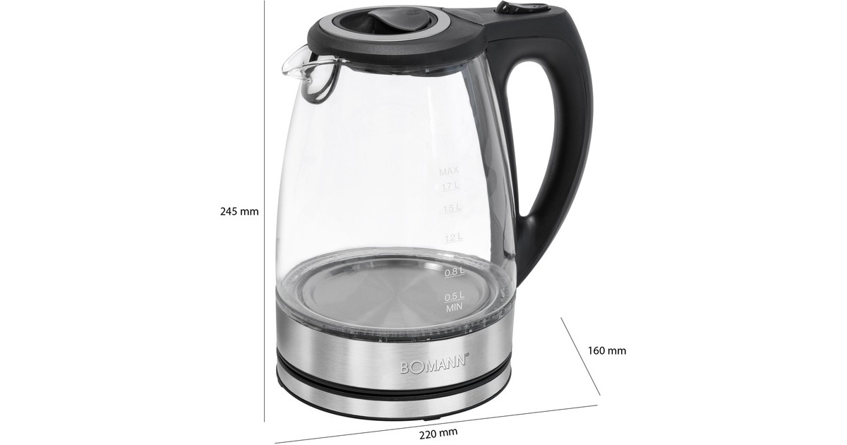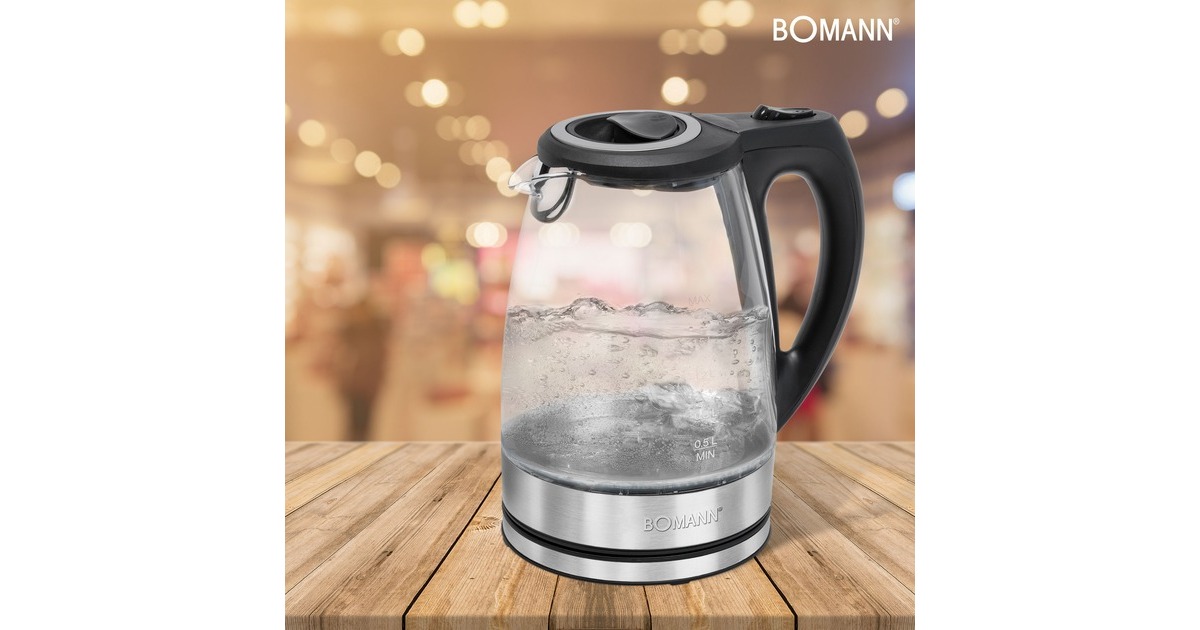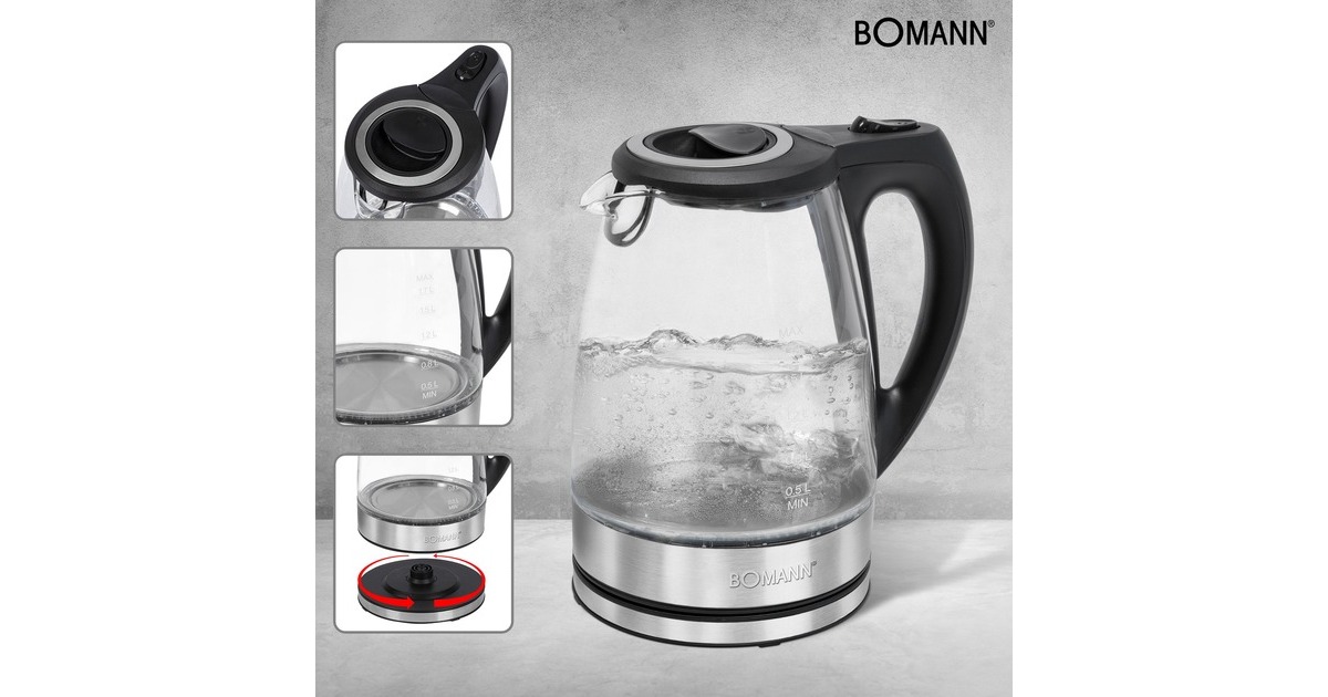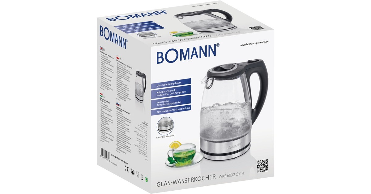 Mit dem Boman WKS 6032 G Wasserkocher aus hitzebeständigem Sicherheitsglas kann man bis zu 1,7 Liter Wasser aufkochen. Der Wasserkocher kann in jeder Position auf die Basisstation gestellt werden, dabei beendet ein Abheben sofort den Kochvorgang. Das verdeckte Edelstahlheizelement erleichtert die Reinigung. Neben einer automatischen und manuellen Abschaltung, sorgen ein verriegelter Sicherheitsklappdeckel sowie der Trockengeh- und Überhitzungsschutz für mehr Sicherheit.Art.-Nr.: 1610807