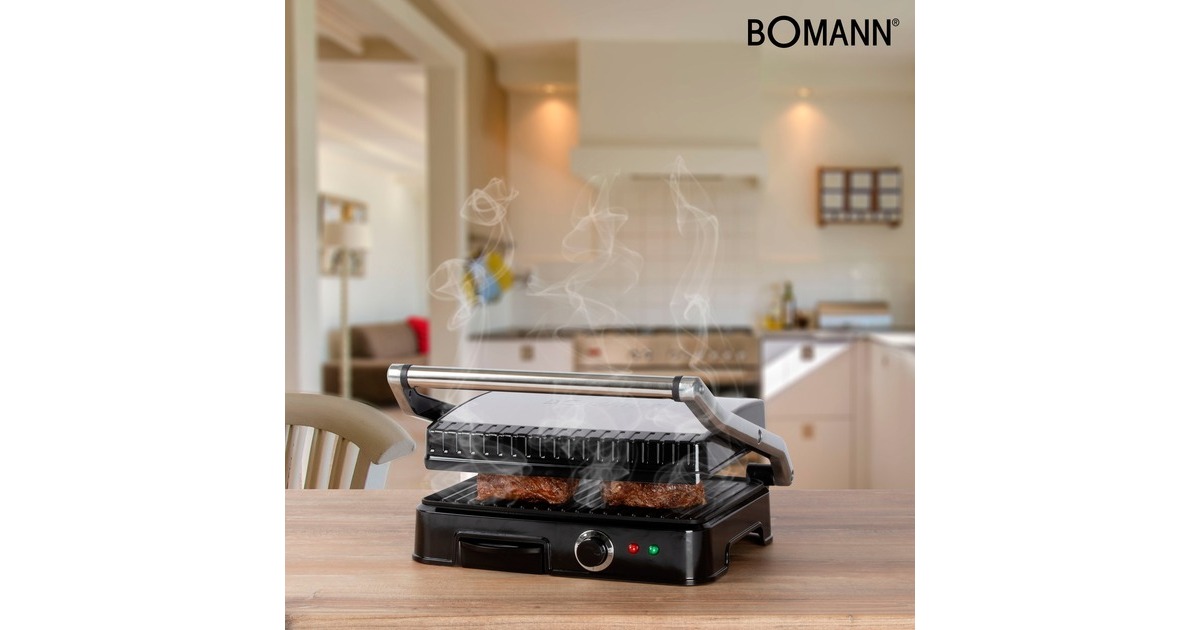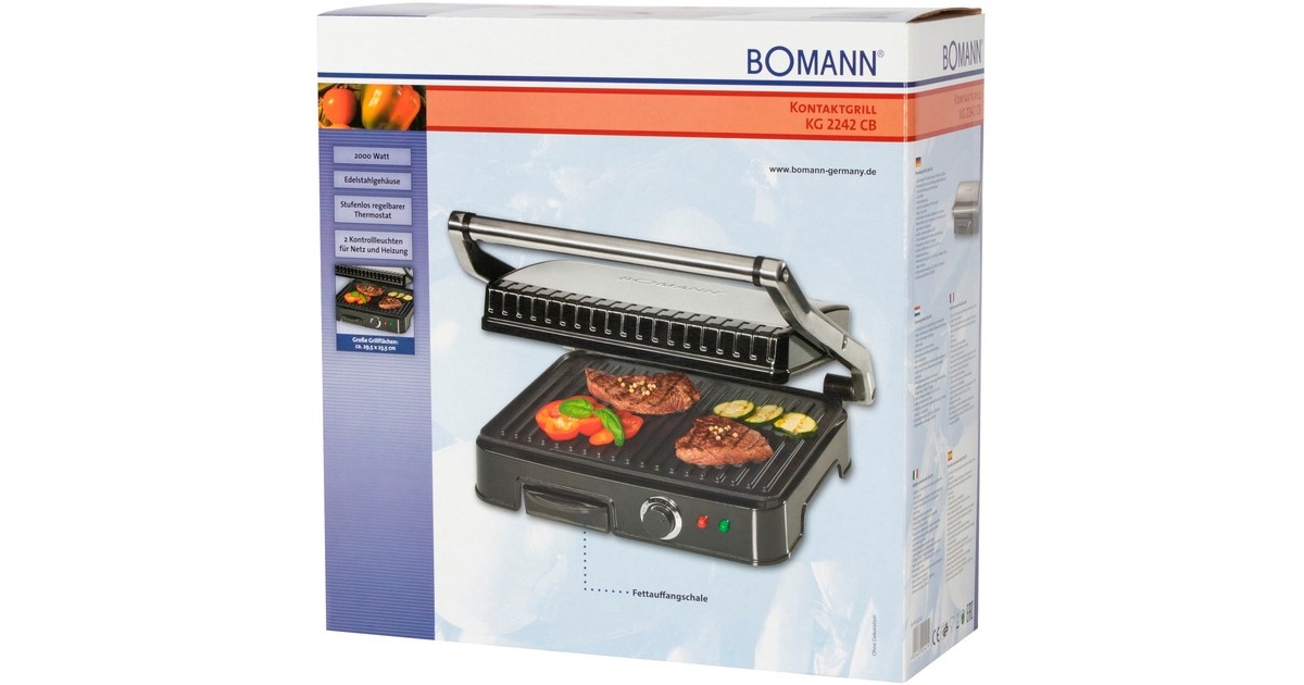 Der Kontaktgrill Bomann KG 2242 CB erzielt mit einer Leistung von 2.000 Watt kurze Garzeiten und optimale Ergebnisse beim beidseitigen, fettfreien Grillen von Panini, Steaks, Fisch oder Gemüse. Die antihaftbeschichteten Grillplatten besitzen extra tiefe Rillen für ein intensives Grillmuster und optimalen Fettabfluss, wobei die Fettauffangschale zur leichten Reinigung entnehmbar ist. Die Temperatur ist stufenlos regelbar, und zwei Kontrollleuchten geben Auskunft über Netz und Heizung. Der große, wärmeisolierte Griff des KG 2242 CB schützt zudem vor Verbrennungen.Art.-Nr.: 1460372