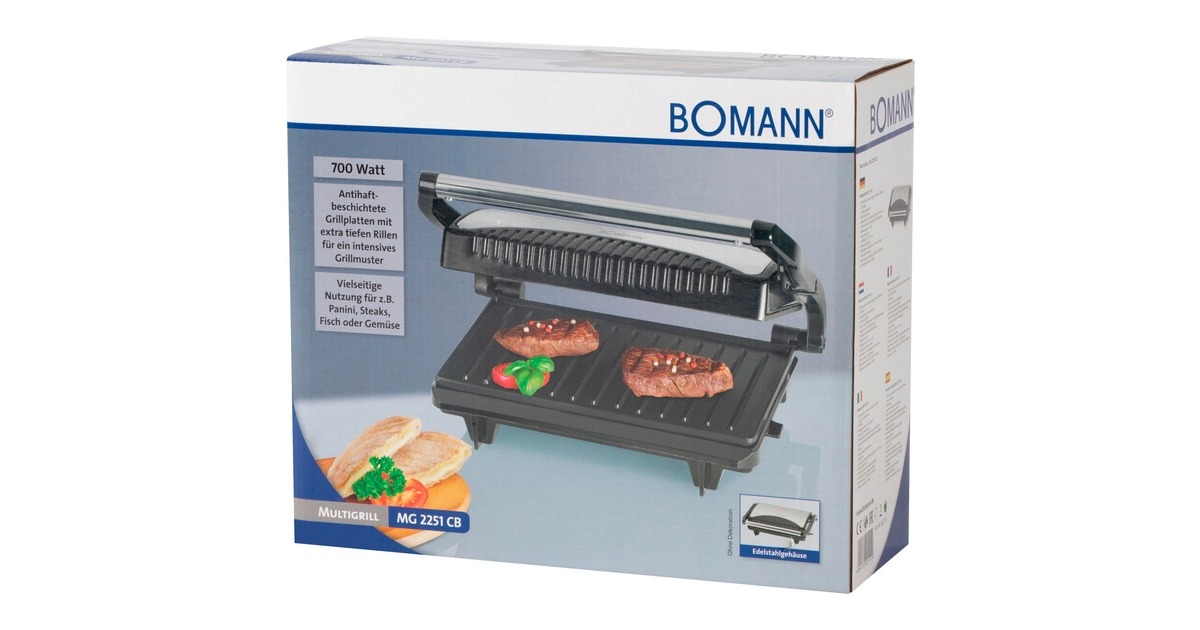 Der Kontaktgrill Bomann KG 2242 CB erzielt kurze Garzeiten und optimale Ergebnisse beim beidseitigen, fettfreien Grillen von Panini, Steaks, Fisch oder Gemüse. Die antihaftbeschichteten Grillplatten besitzen extra tiefe Rillen für ein intensives Grillmuster und die Kabelaufwicklung sorgt für unkompliziertes Verstauen. Der wärmeisolierte Griff des KG 2251 CB schützt zudem vor Verbrennungen.Art.-Nr.: 1460654