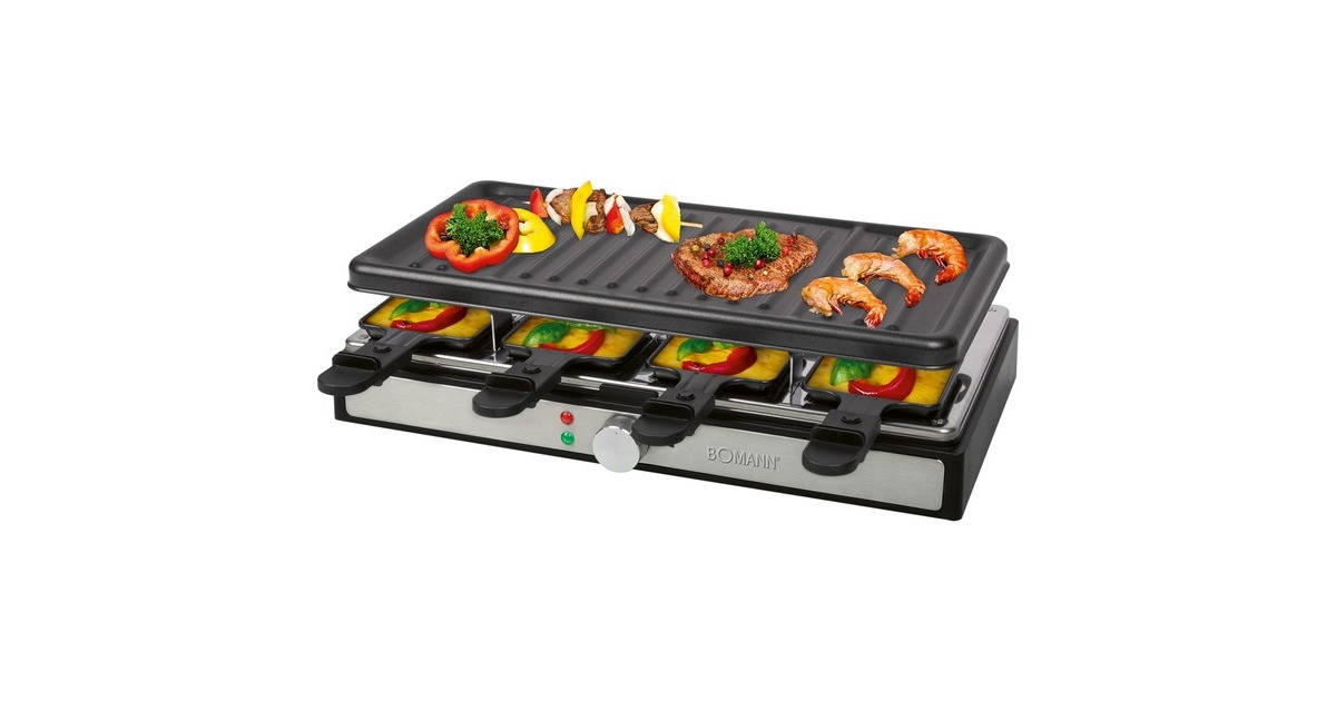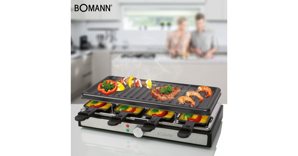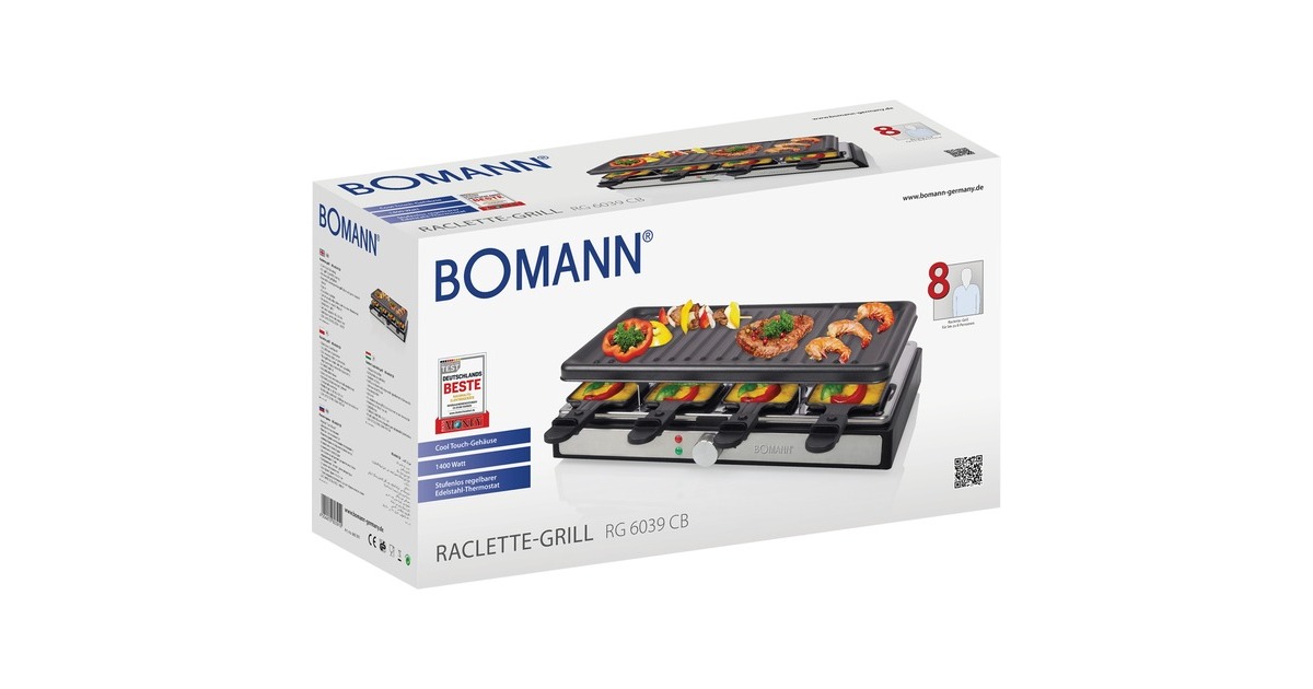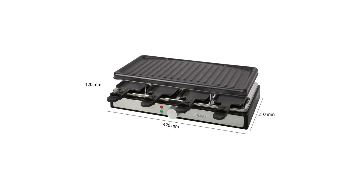 Der Raclette-Grill RG 6039 CB von Bomann eignet sich zum Grillen und Überbacken für bis zu acht Personen. Über den Edelstahl-Thermostat lässt sich die Temperatur stufenlos einstellen. Ist die Temperatur erreicht, leuchtet eine der beiden Kontrollleuchten auf. Die abnehmbare Grillplatte bietet eine Grillfläche von ca. 42 x 21 cm. Die Grillplatte sowie die acht Raclette-Pfännchen sind antihaftbeschichtet. Das erleichtert die Entnahme der gratinierten oder gegrillten Zutaten und sorgt für eine leichte Reinigung. Art.-Nr.: 1758285