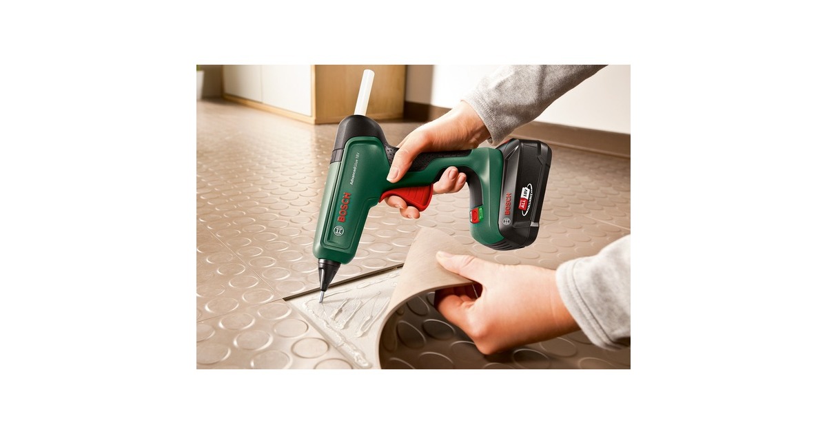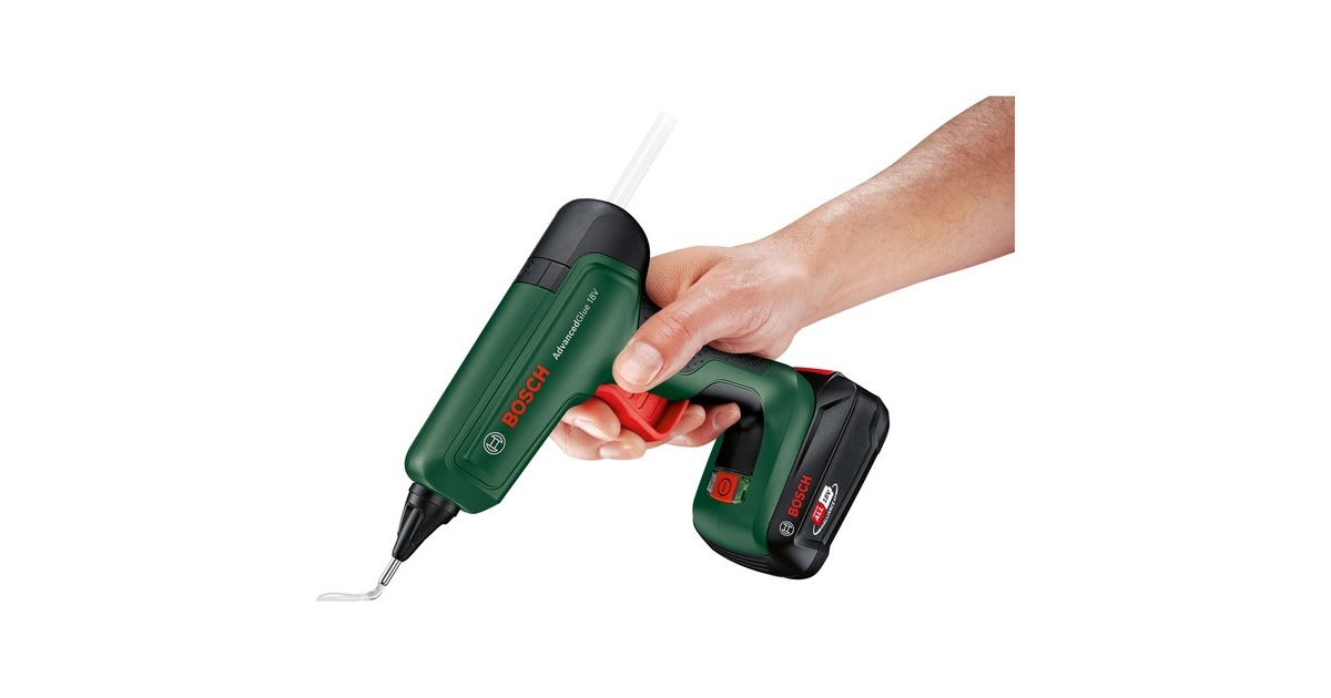 Die Bosch AdvancedGlue 18V ist eine kraftvolle Akku-Heißklebepistole mit der gleichen starken Leistung wie bei einem kabelgebundenen Gerät. Sie eignet sich zum zum lösungsmittelfreien Verkleben von Papier, Pappe, Kork, Holz, Leder, Textilien, Schaumstoff, Kunststoff (außer PE, PP, PTFE und Weich-PVC), Keramik, Porzellan, Metall, Glas und Stein. Bei Verwendung von Spezialklebern (low melt) und einer Verarbeitungstemperatur von 130°C ist das Verkleben von hitzeempfindlichen Materialien wie beispielsweise Styropor möglich. In nur 90 Sekunden ist sie aufgeheizt und einsatzbereit. Dank der Bosch Technologie für eine konstant hohe Temperatur ermöglicht sie optimale Klebeverbindungen für perfekte Leimfugen und bietet dabei ausreichend Korrekturzeit. Die extra lange Düse erleichtert die Sicht und das präzise Auftragen auf kleine Flächen. Die Bosch AdvancedGlue 18V ist mit zwei Temperaturstufen ausgestattet. Die 200°C Stufe sorgt für maximale Verklebung bei Heimwerker- oder Reparaturarbeiten, während sich die 130°C Stufe ideal für hitzeempfindliche Projekte eignet. Sie eignet sich zur Verarbeitung von 11mm-Klebesticks von 45mm bis 300mm Länge. Sie spart auch Energie, indem sie bei Inaktivität abschaltet. Die Akku-Heißklebepistole AdvancedGlue 18V wird ohne Ladegerät und POWER FOR ALL-Akku geliefert. Es kann jeder Akku der 18V POWER FOR ALL ALLIANCE eingesetzt werden, egal von welchem Hersteller. Die POWER FOR ALL ALLIANCE ist eine der größten markenübergreifenden Akku-Allianzen führender Hersteller (Bosch, GARDENA, Husqvarna, STEINEL, Gloria, Flymo, Rapid, Wagner u.a.). Man braucht also nicht für jedes Gerät einen extra Akku kaufen und spart Geld.Art.-Nr.: 1892498