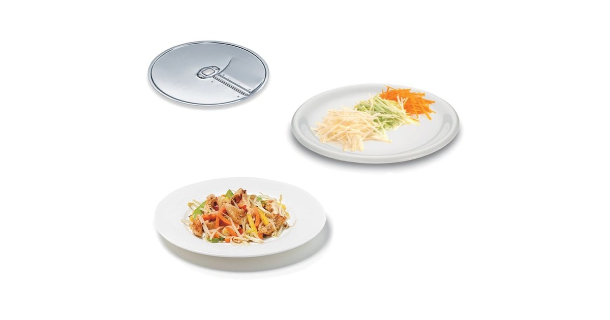 Die Asia-Gemüse-Scheibe MUZ45AG1 raspelt und schneidet Gemüse schnell und einfach in feine Streifen. Für asiatische Gemüsegerichte und Suppeneinlagen, sowie dekorative Beilagen oder Garnitur von Fisch- und Fleischspeisen. Die Scheibe aus Edelstahl ist geschmacksneutral, einfach zu reinigen und liefert langzeitig gute Schneidergebnisse durch gehärtete und geschliffene Schneideinsätze. Sie ist nur in Verbindung mit dem Durchlaufschnitzler der Küchenmaschinen MUM4, MUM5 und MCM6 verwendbar.Art.-Nr.: 1360211